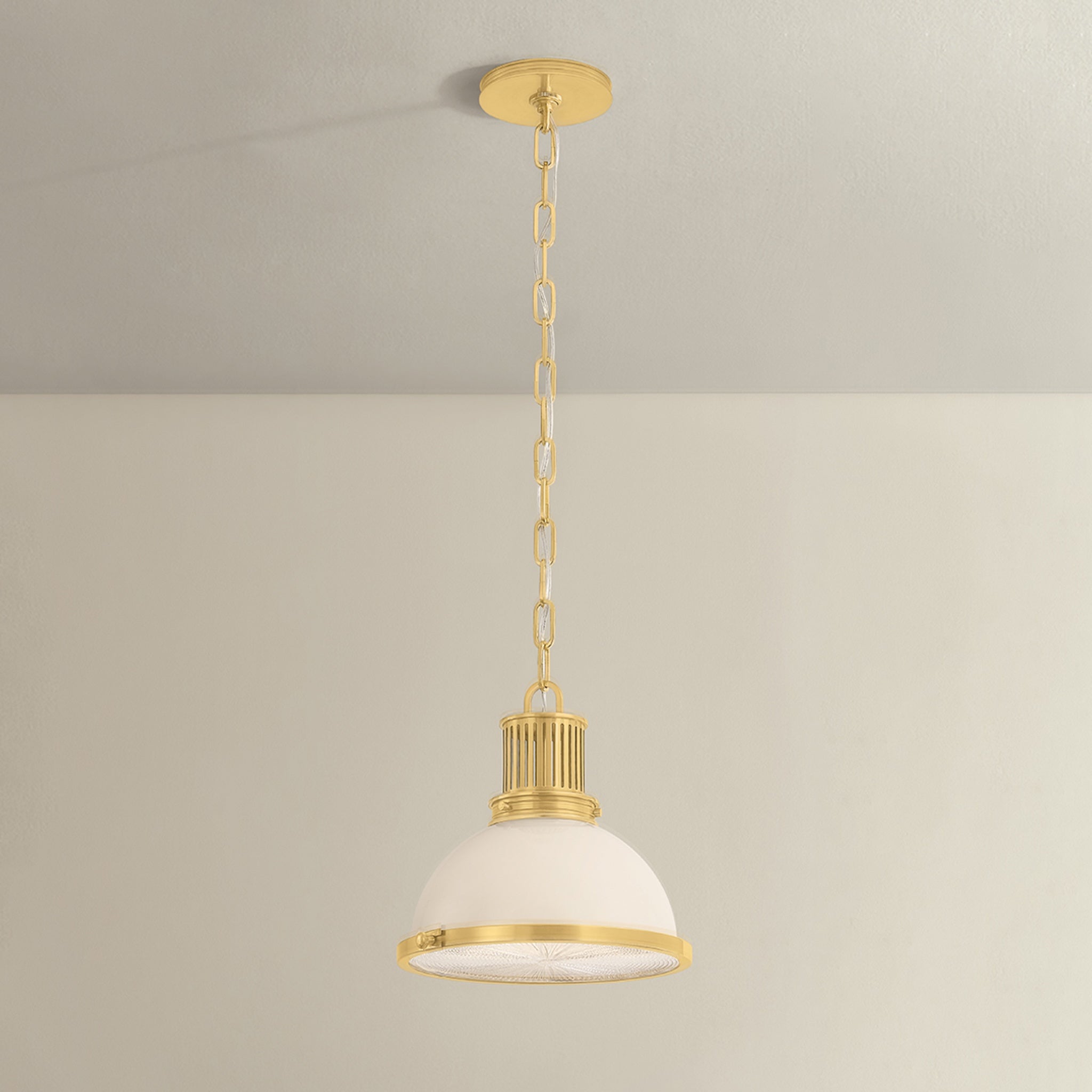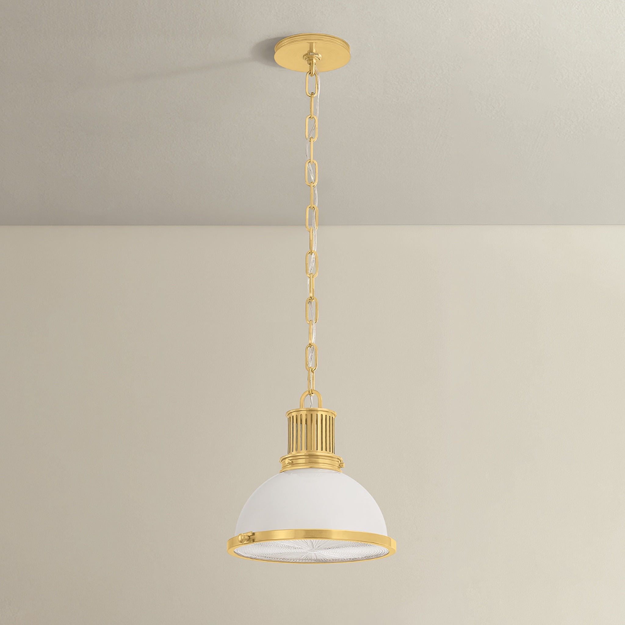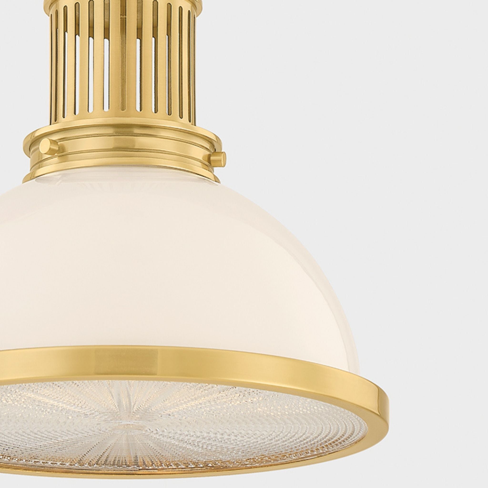 Pinesbridge reimagines the classic RLM pendant with a retro twist, pairing an opal glass shade with a textured holophane diffuser for beautifully layered light. Finished with geometric perforations and an industrial edge, it brings timeless character to kitchens, hallways, and beyond.