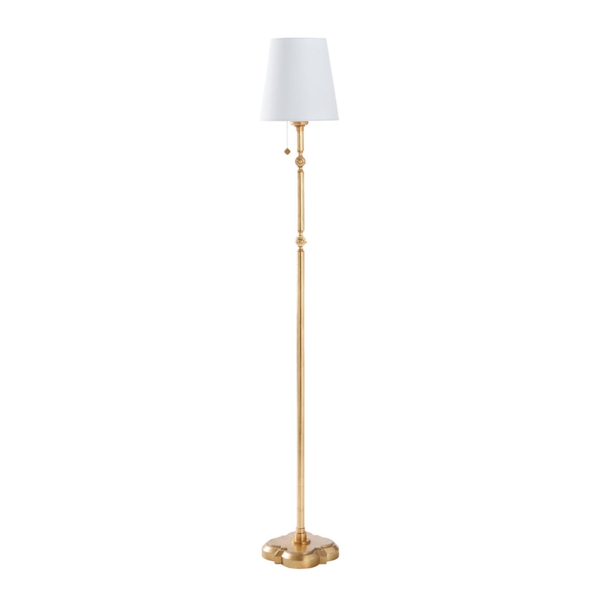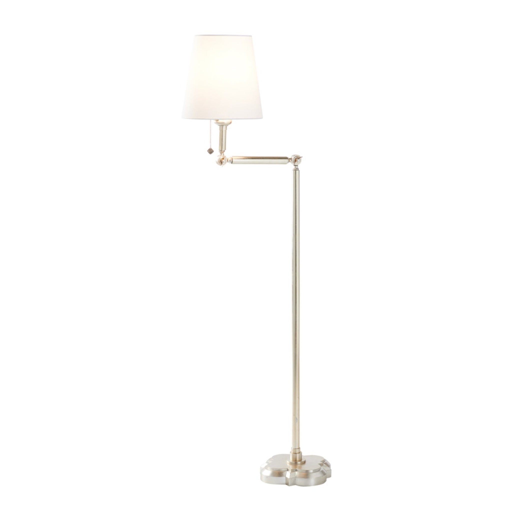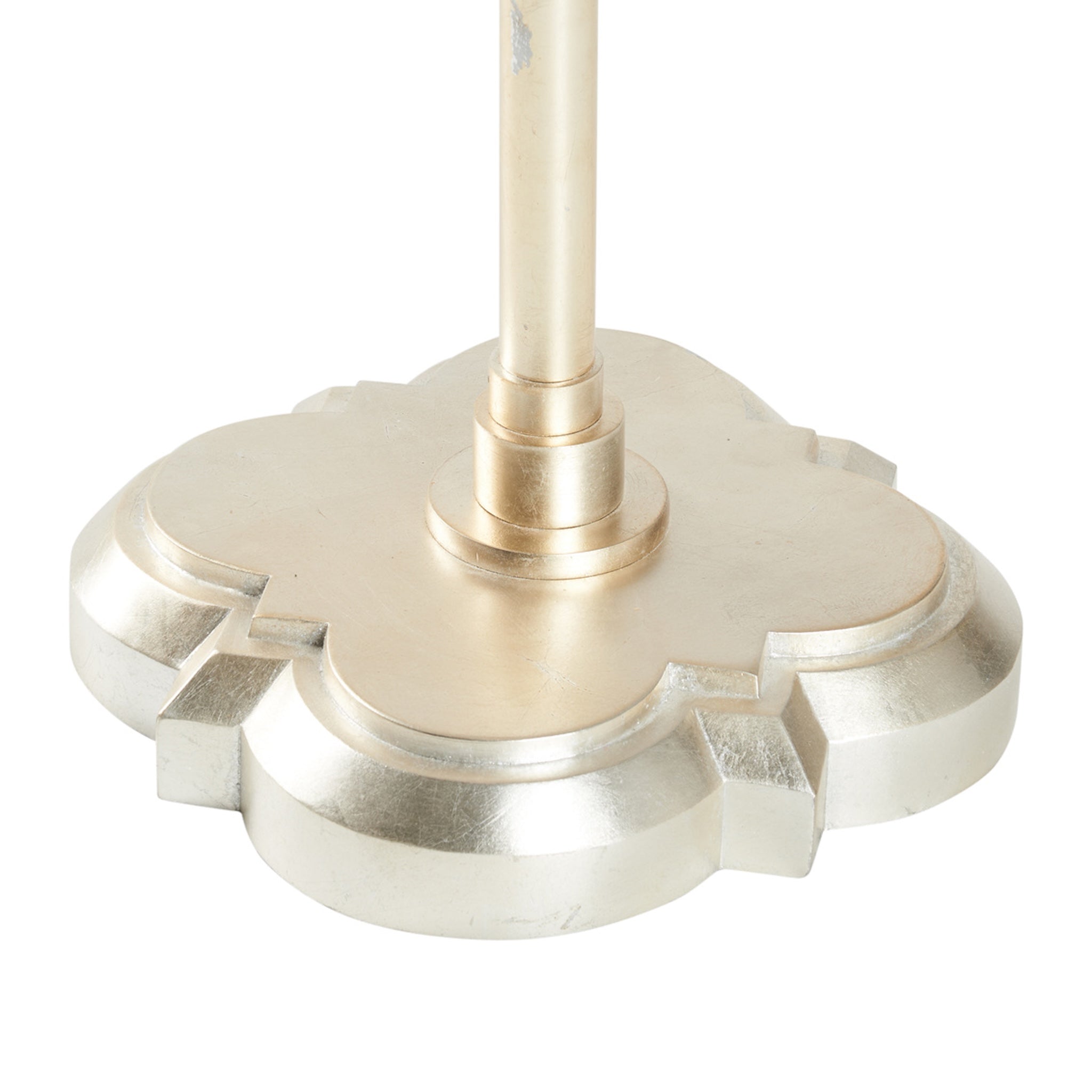 Designed by Lisa Kahn, this Quatrefoil Floor Lamp pairs a sleek quatrefoil base with silver or gold finishes for versatile sophistication. Topped with a white shade, it delivers gentle illumination that completes the look.