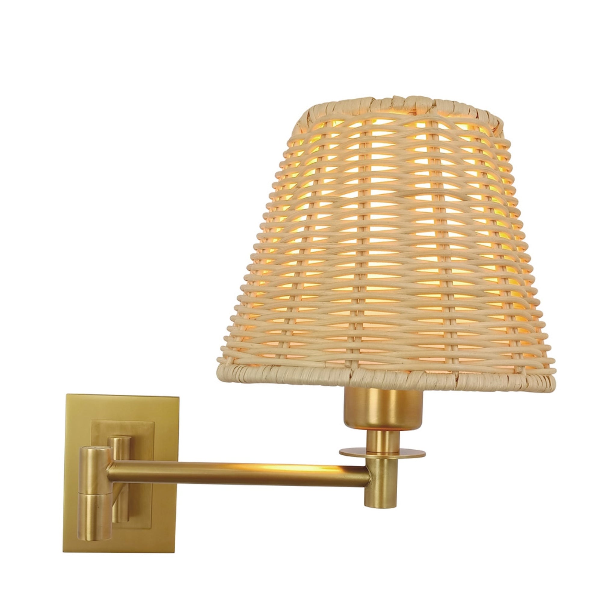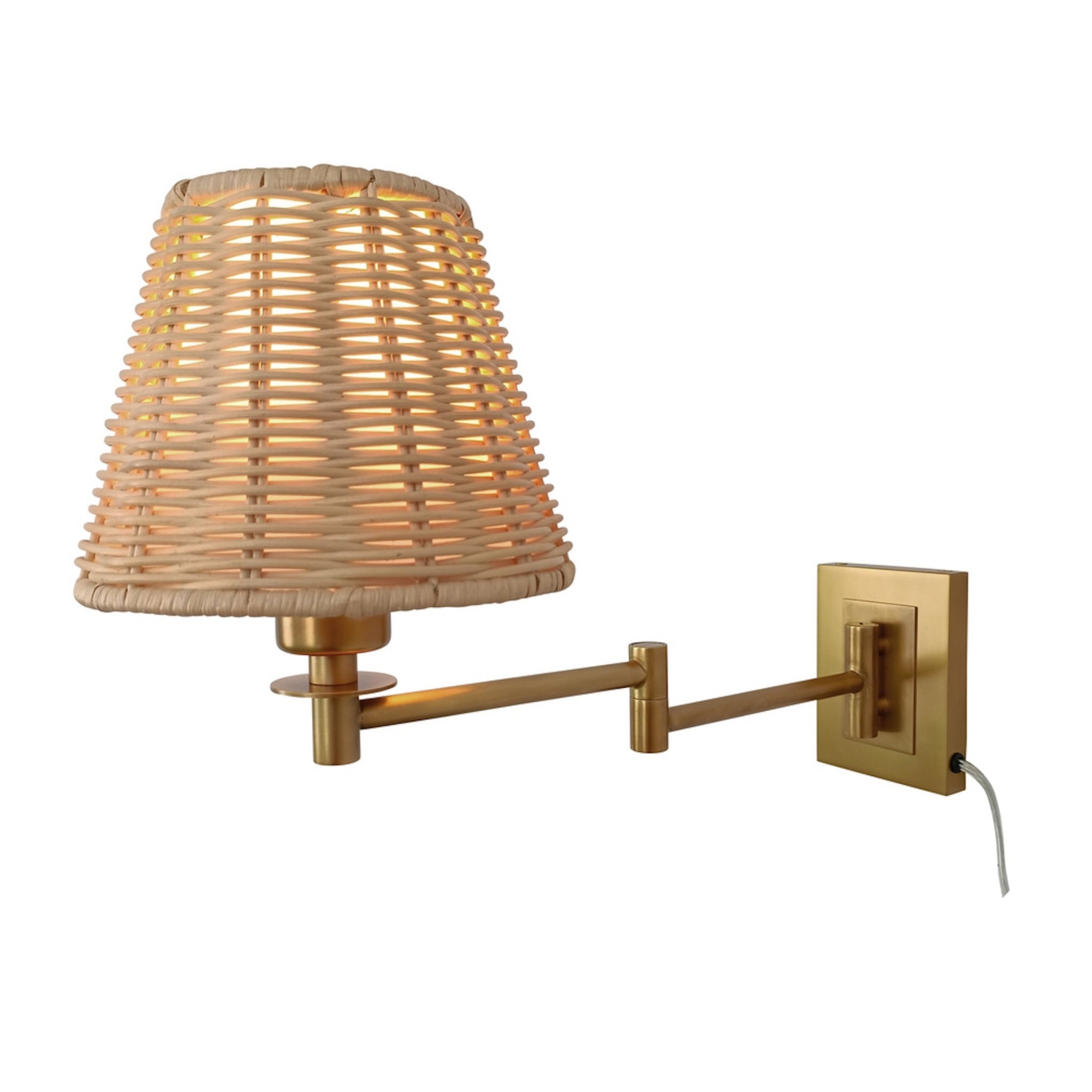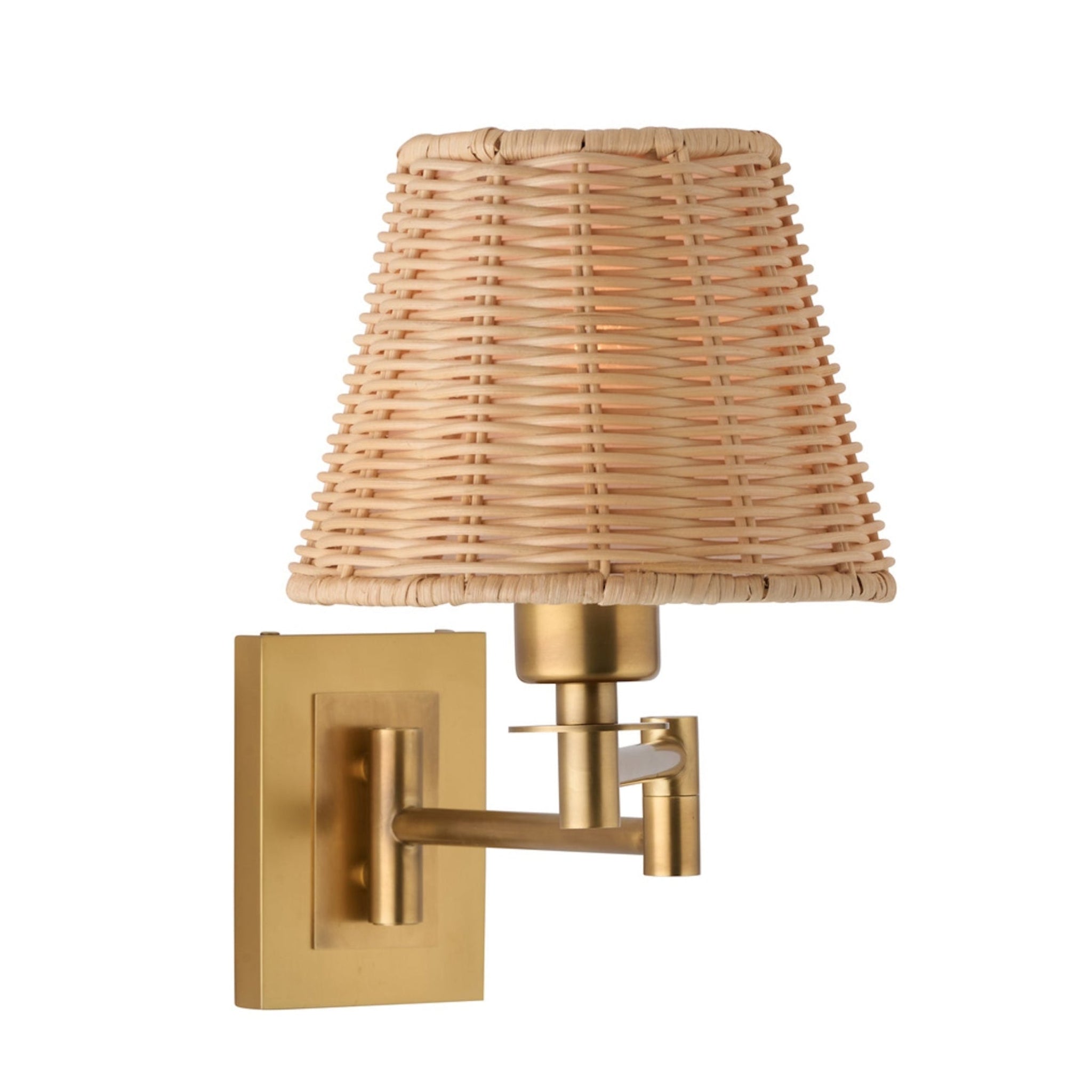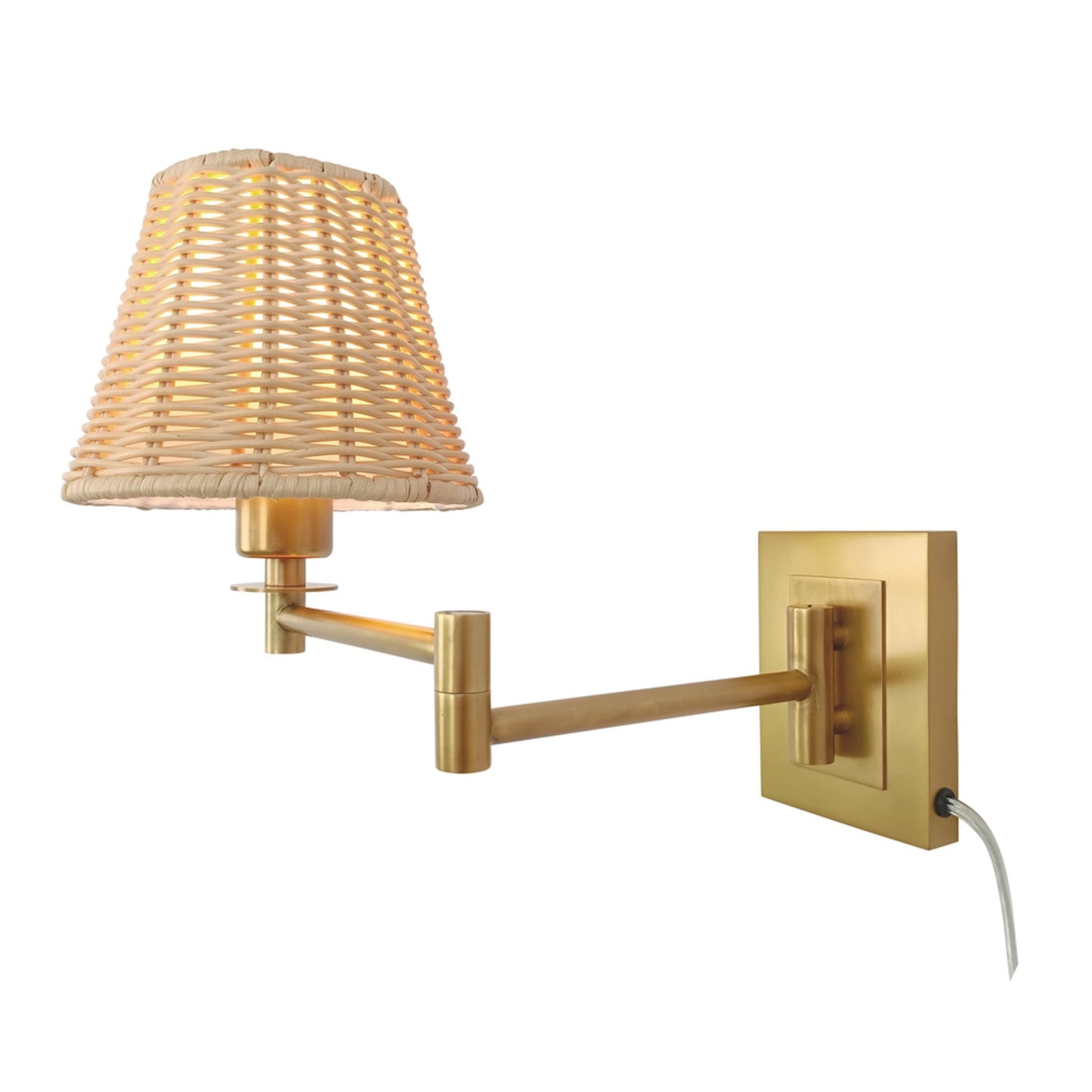 The Uptown Sconce pairs handwoven rattan warmth with a sleek brass swing arm for a polished, modern look. Its adjustable plug-in design makes it perfect for bedrooms, reading nooks, or living spaces, casting a soft and inviting glow.