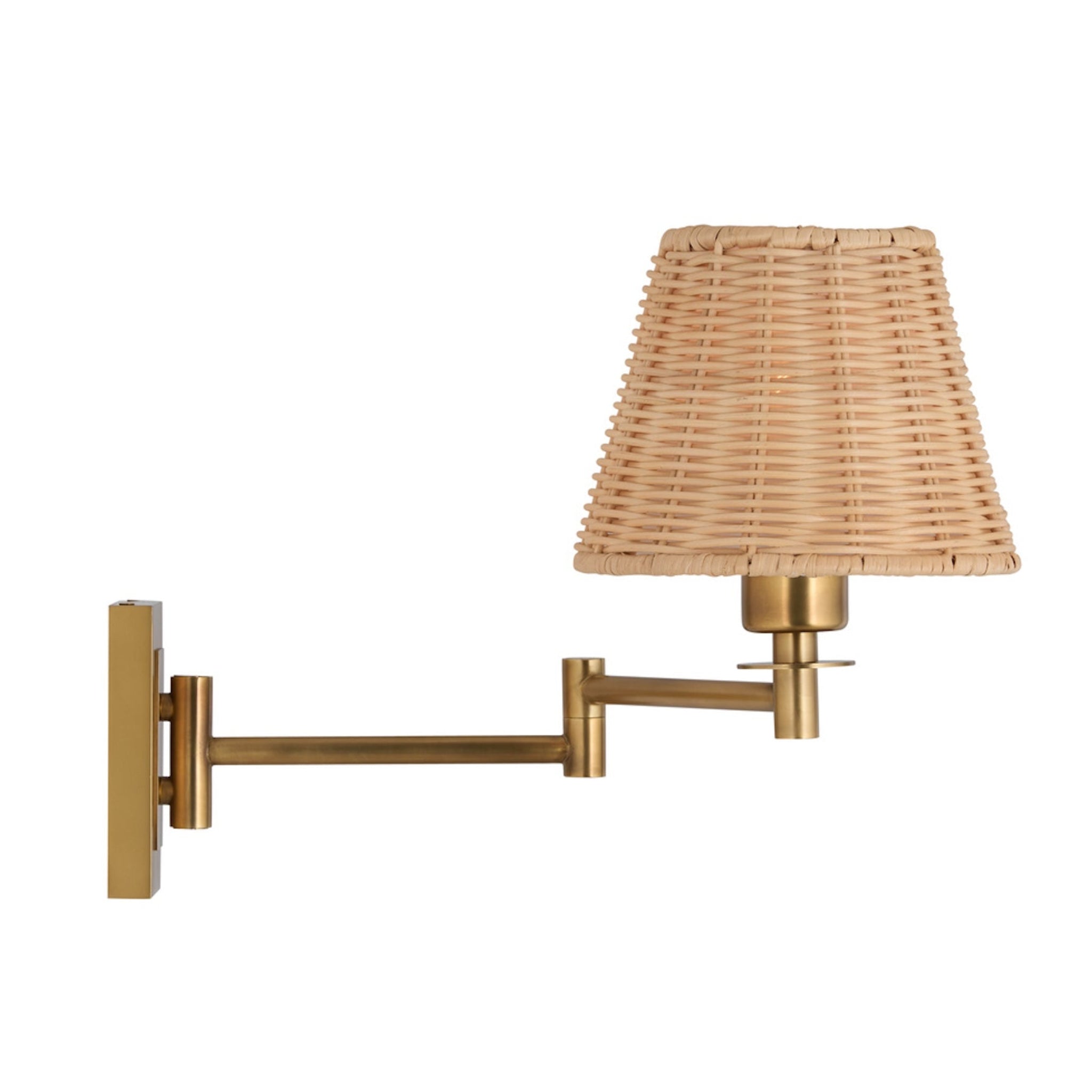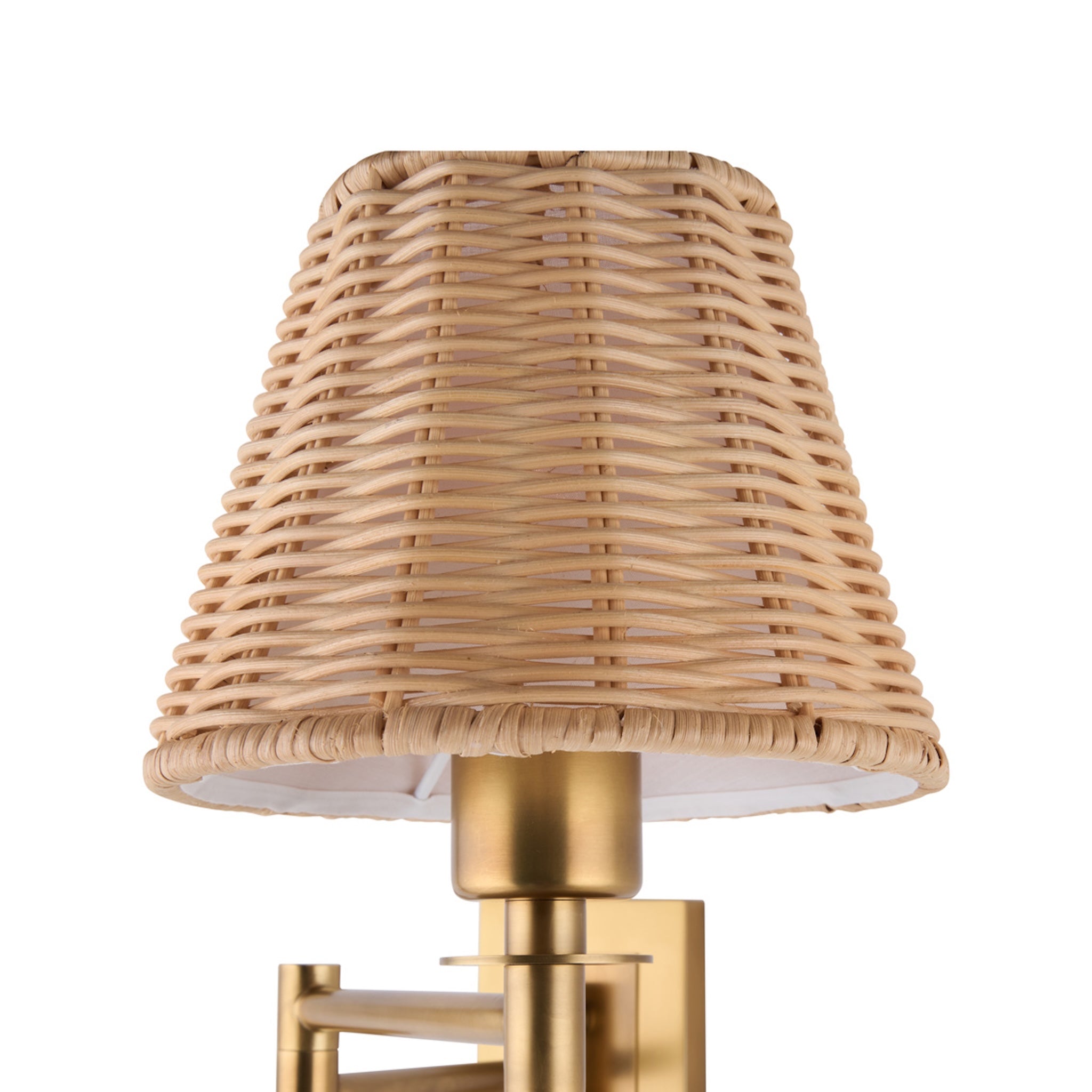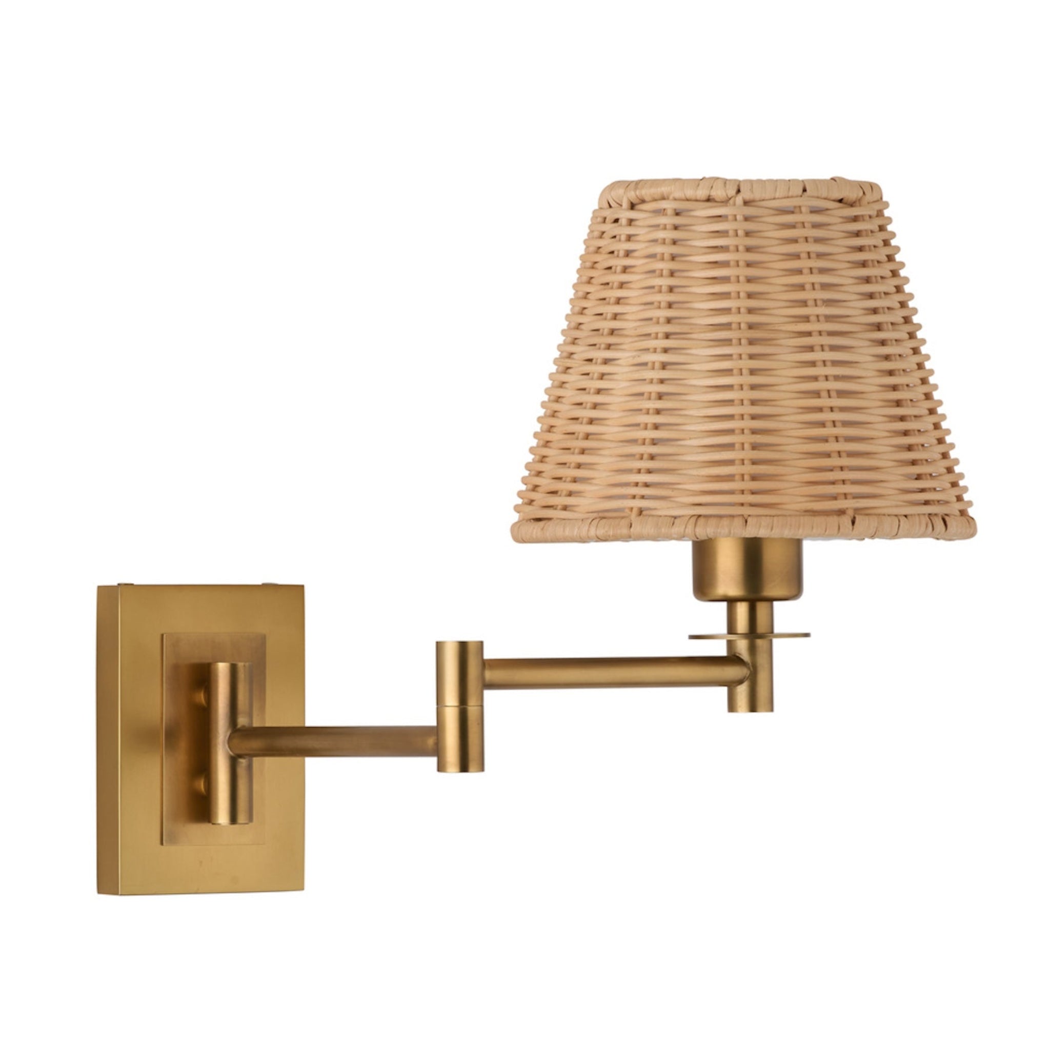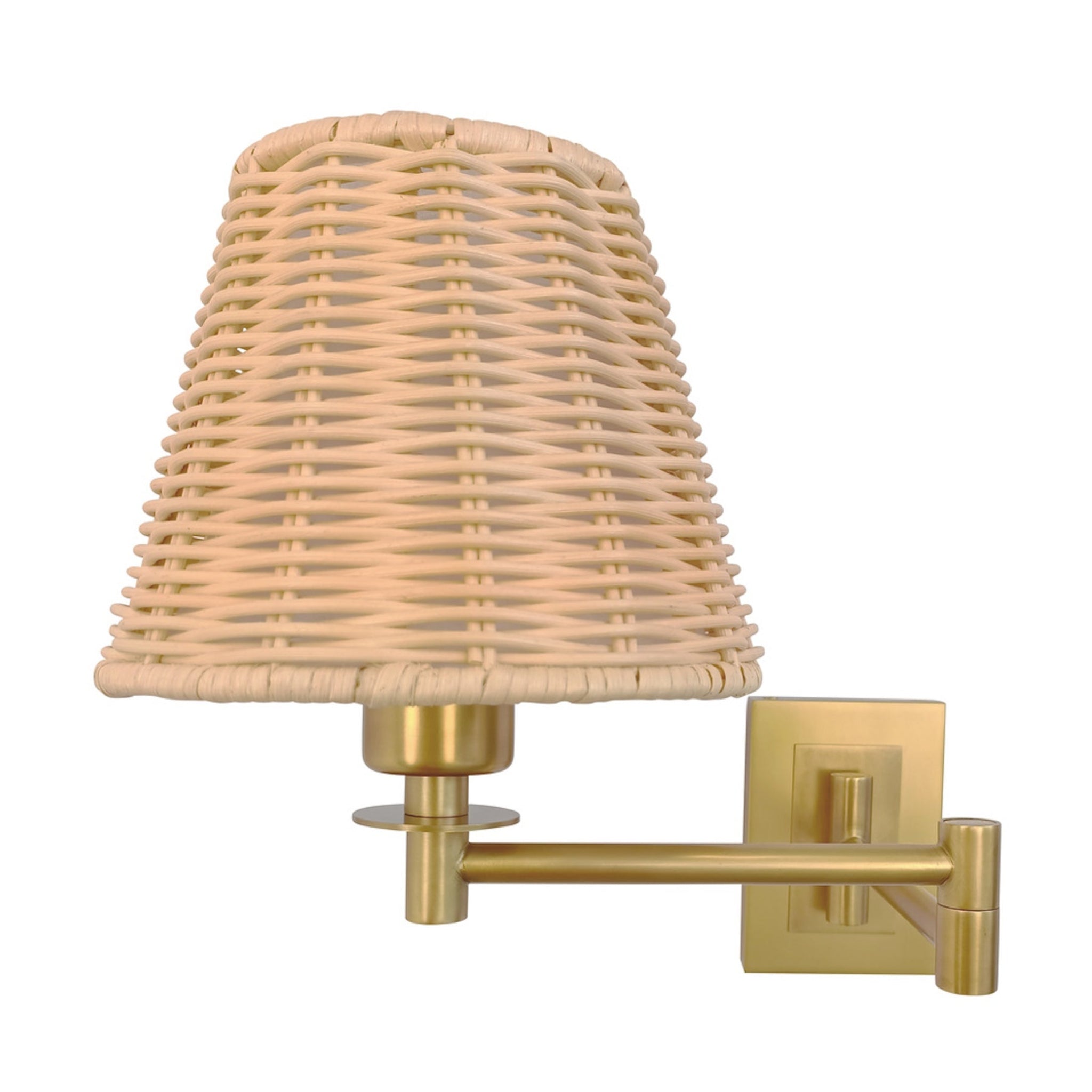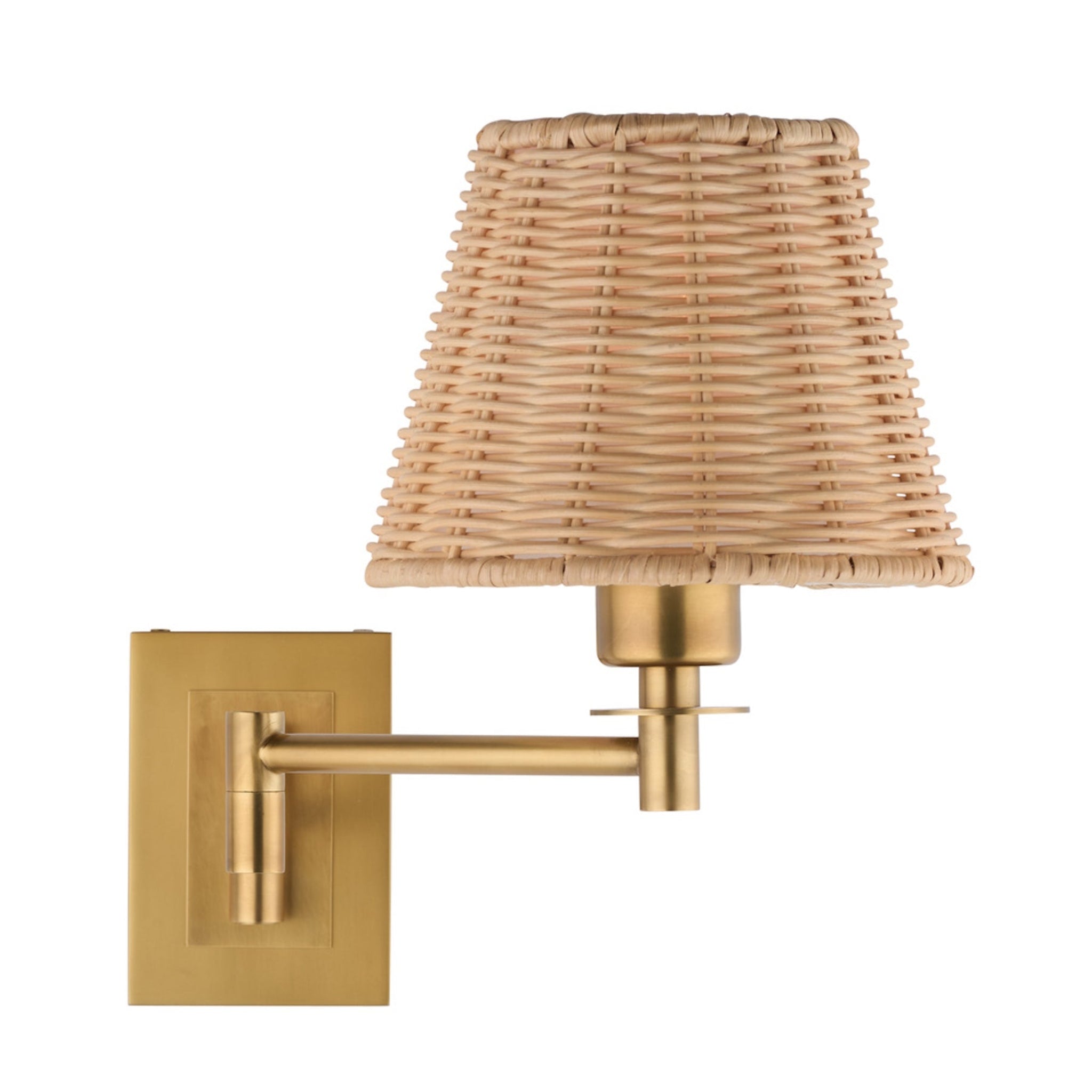The Uptown Sconce pairs handwoven rattan warmth with a sleek brass swing arm for a polished, modern look. Its adjustable plug-in design makes it perfect for bedrooms, reading nooks, or living spaces, casting a soft and inviting glow.