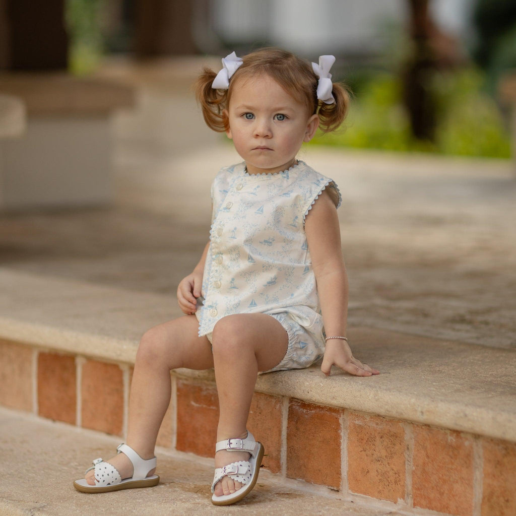 Our Drew Diaper Set is the most classic summer outfit for both boys and girls. Featuring our brand new Tucker's Town Toile colorway and the sweetest light blue ric rac, it's the cutest outfit for beach trips, family photos or elevated everyday wear.