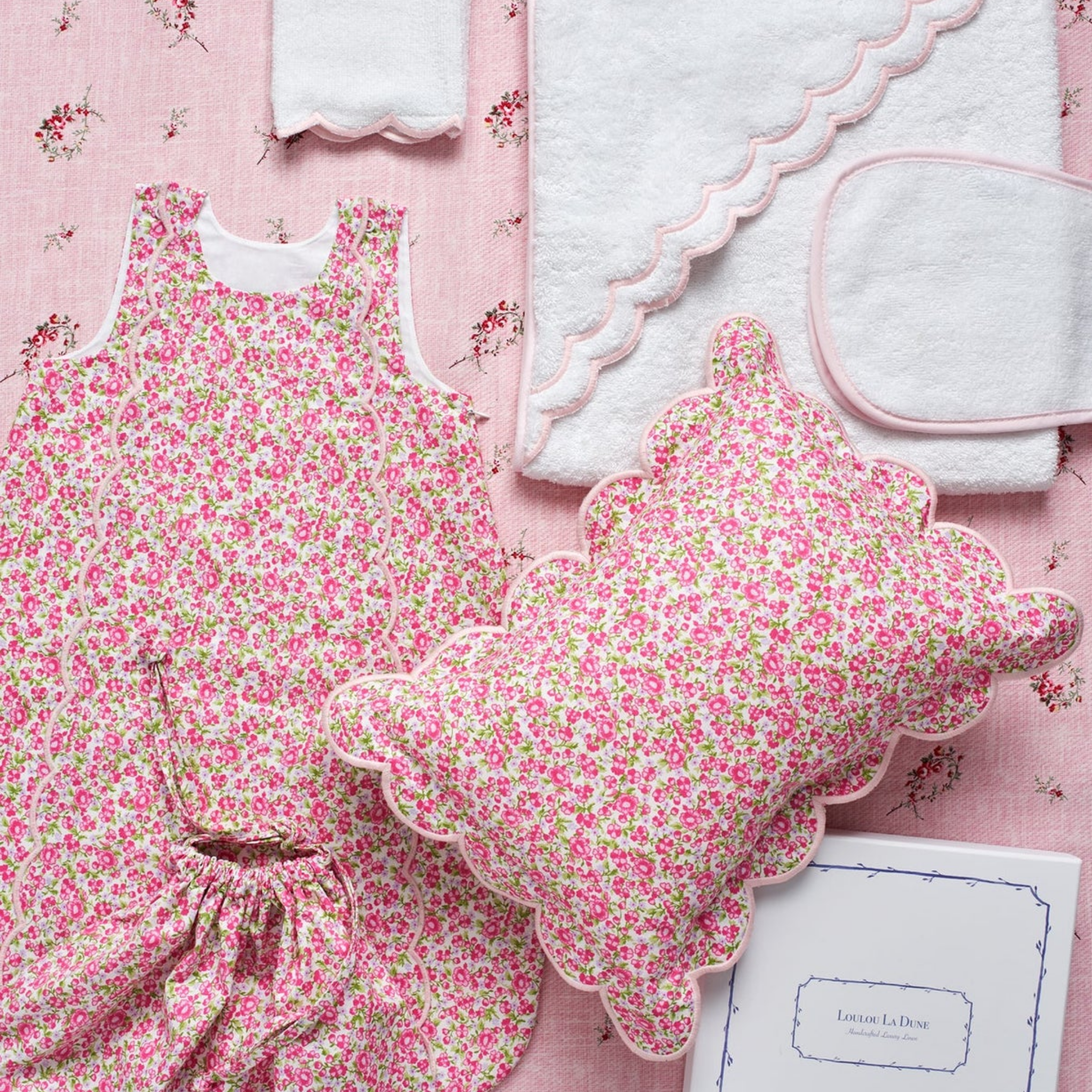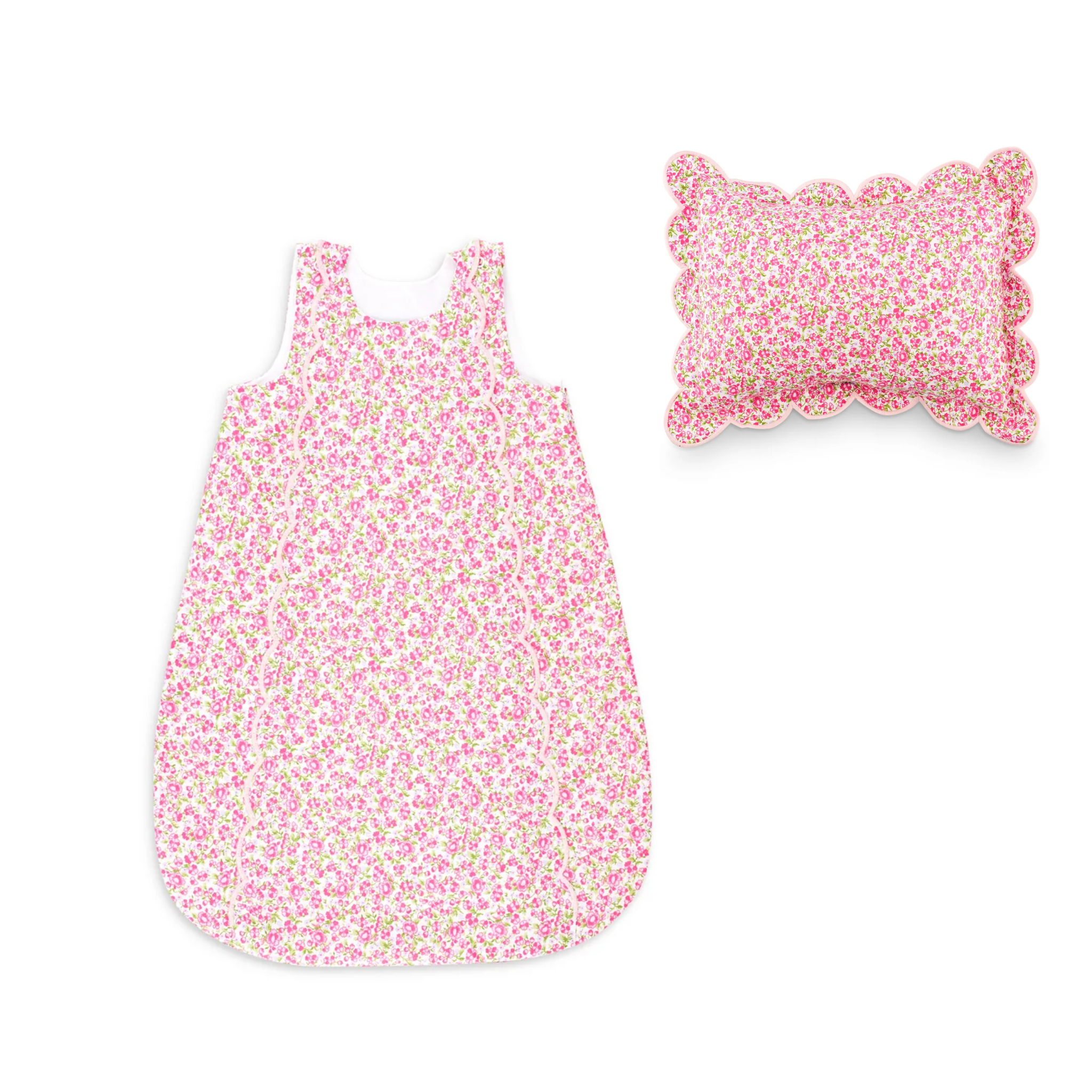 This pink floral set includes a bedroom sham, a sleep sack, a hooded towel, a washcloth and burp cloth with matching bag. This item is final sale and is not eligible for return. Click images for greater detail.