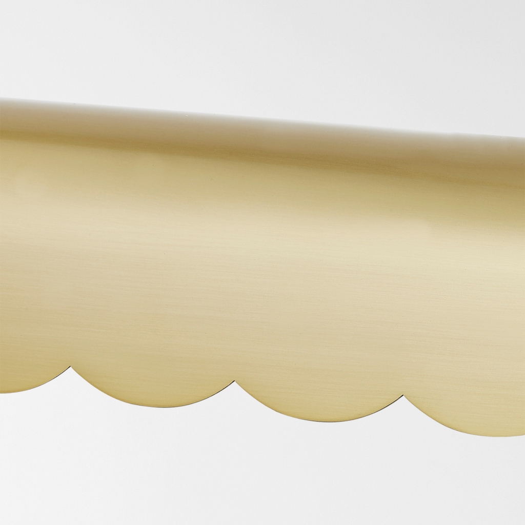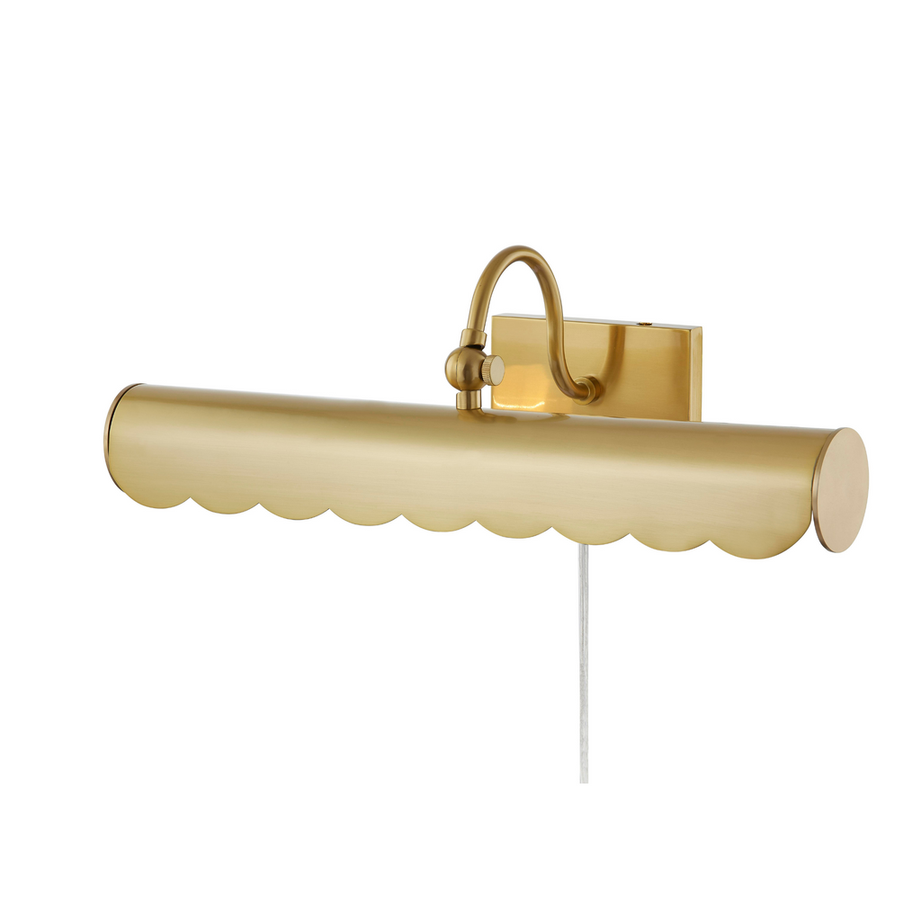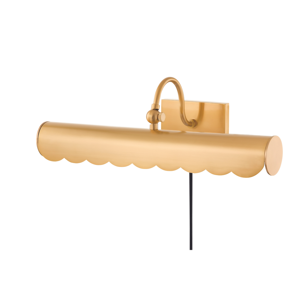 Highlight artwork, photos or other wall décor with this aged brass, plug-in picture light. Features a scalloped edge and curved arm that adds a warm, fresh feel. Click images for greater detail.