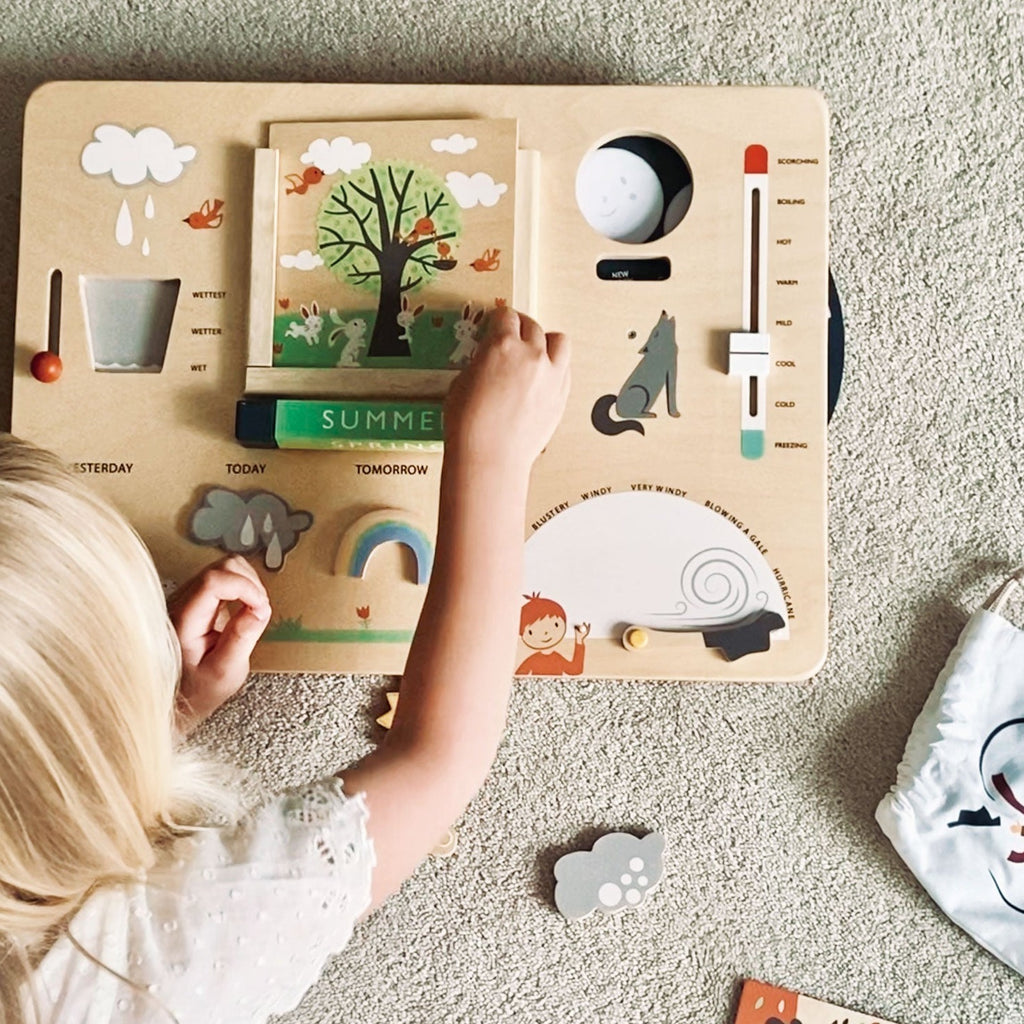 A top-quality illustrated wood Weather station that links all aspects of climate into a simple and educational board that can be hung up on a classroom wall or played with on a tabletop. Rainfall, wind speed, temperature, seasons and a daily 'what is the weather like today' as well as a novel moon phase wheel teaches about cycles.