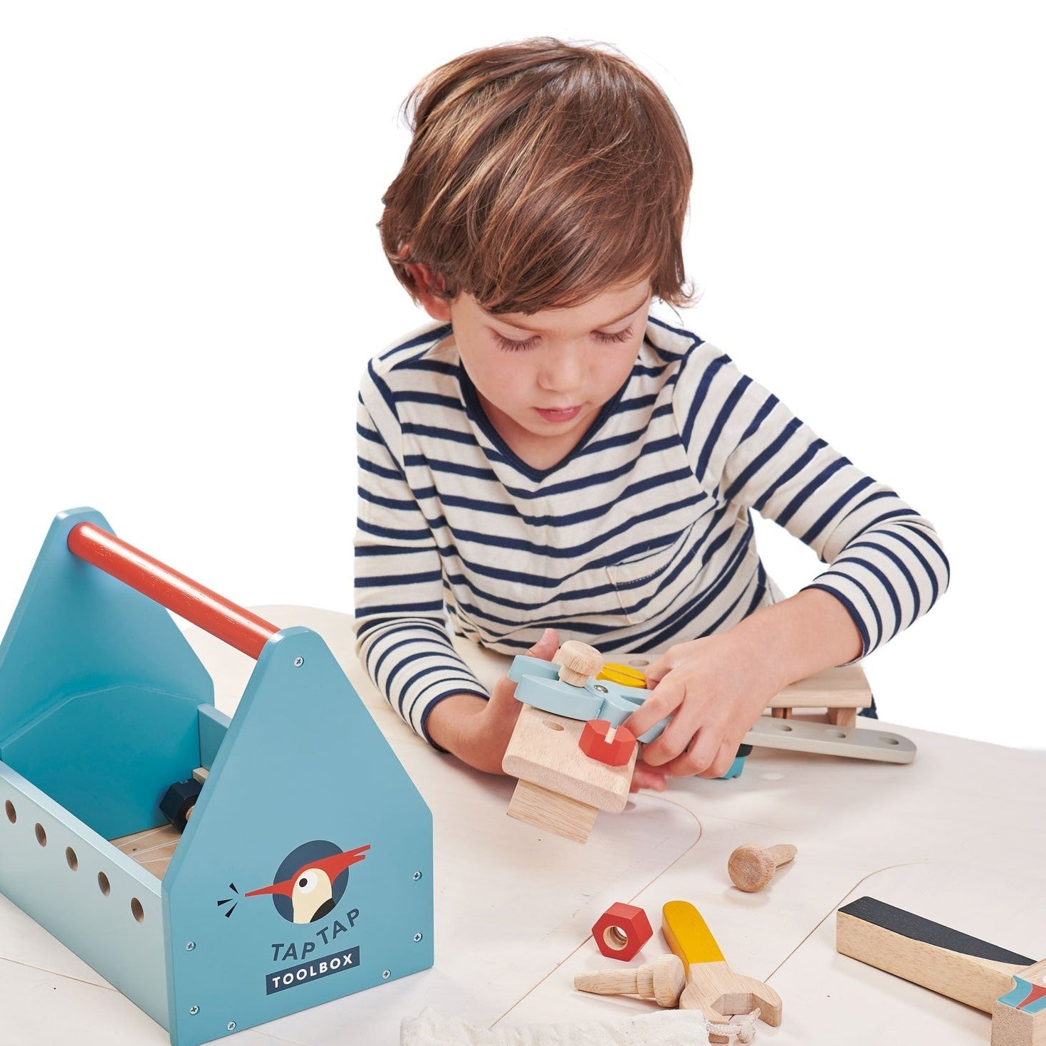 A Tender Leaf Toys branded woodpecker themed tool box filled with everything you need to build something on your own. With two removable lid pieces that turn into screwable plates, and a cloth printed bag to pack away after play, this set includes a woodpecker hammer, a pair of pliers, a screwdriver, a spanner, 2 screws, 2 bolts, 2 planks, 4 nuts, and 4 pegs. We have even included a chalkboard on one end of the box to record your inventions.