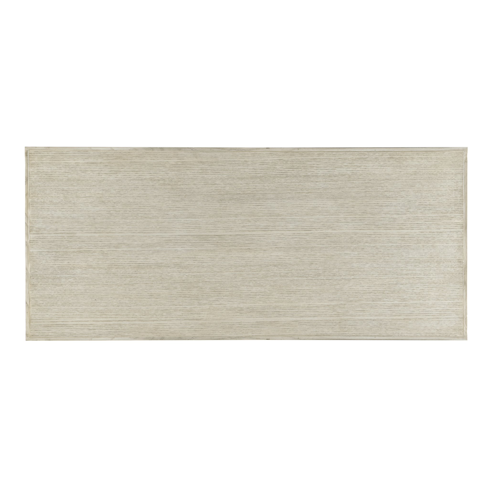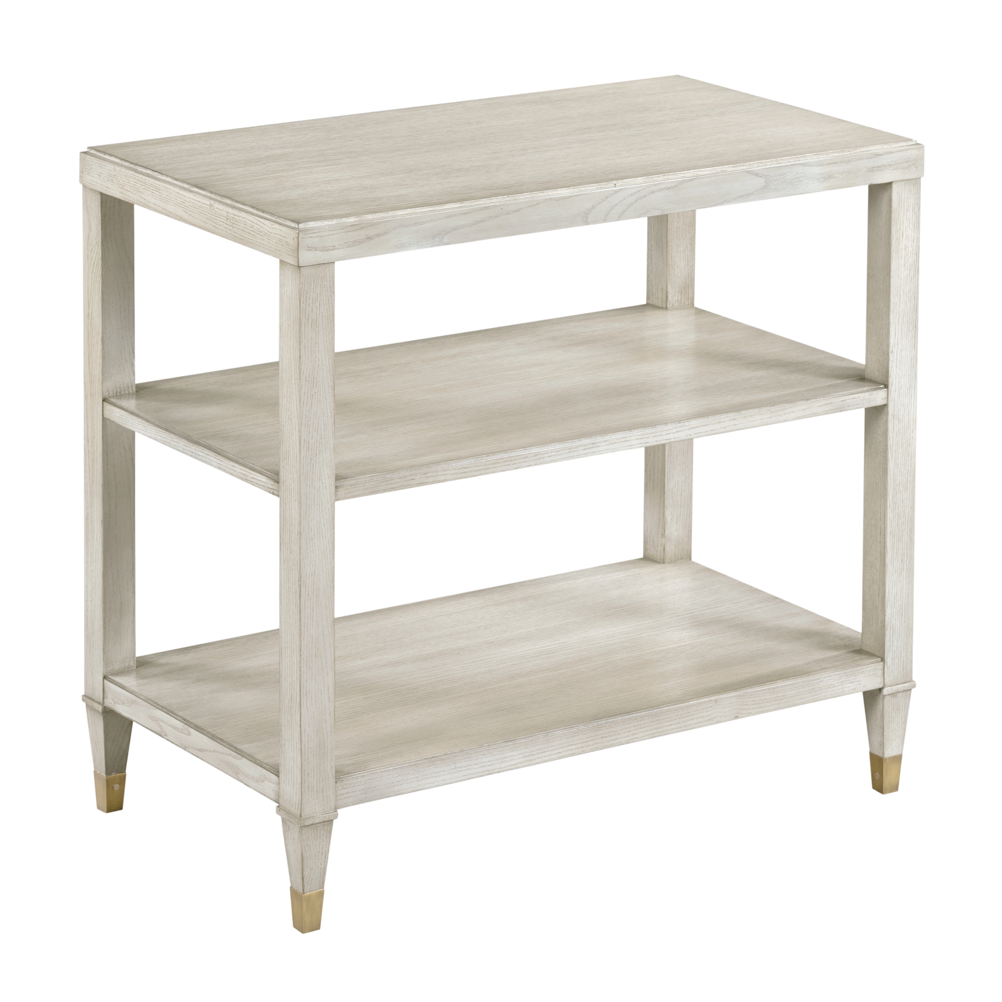 A rectangular top rests over four squared corner posts joined by a middle and low shelf elevated on tapering legs.
