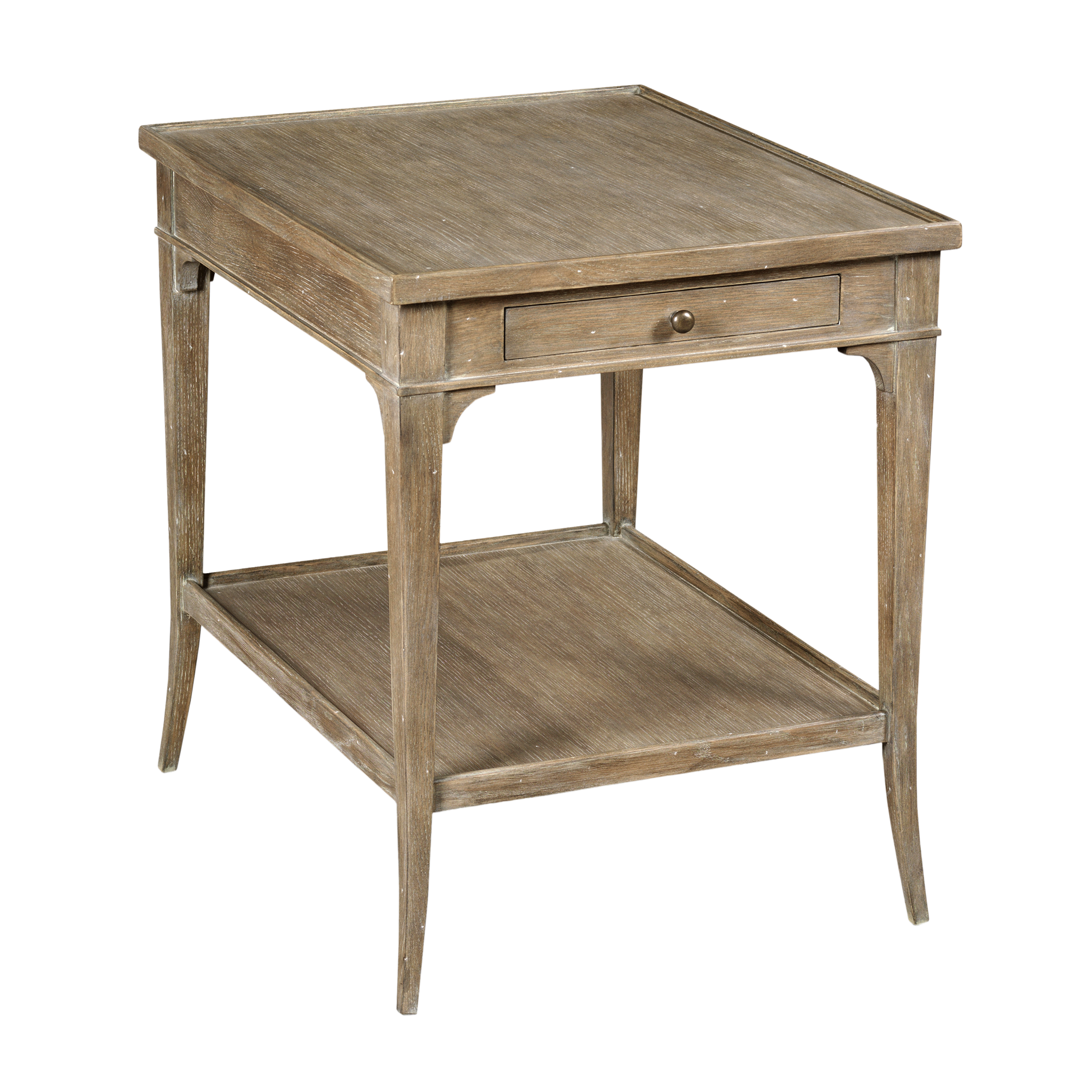 A rectangular galleried top rests over an apron rail drawer and squared gracefully tapering corner posts joined by a low shelf.