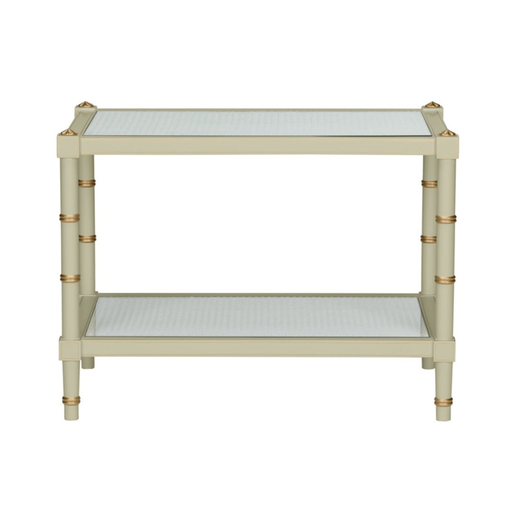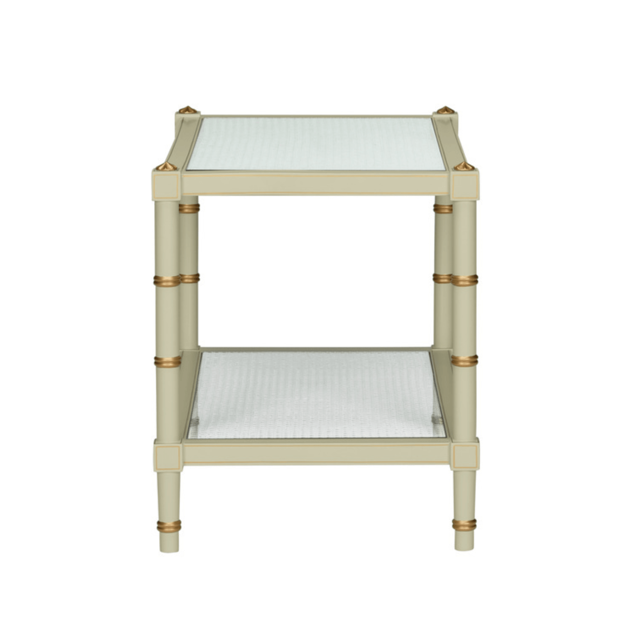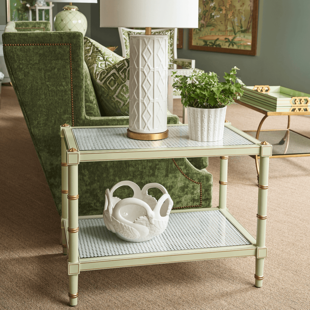 This elegant accent table in green is adorned with gold hand painted detailing around the edge of the bamboo-inspired legs and natural caned shelf. Perfect for any room that needs a subtle pop of color. Designed by Bill Cain.