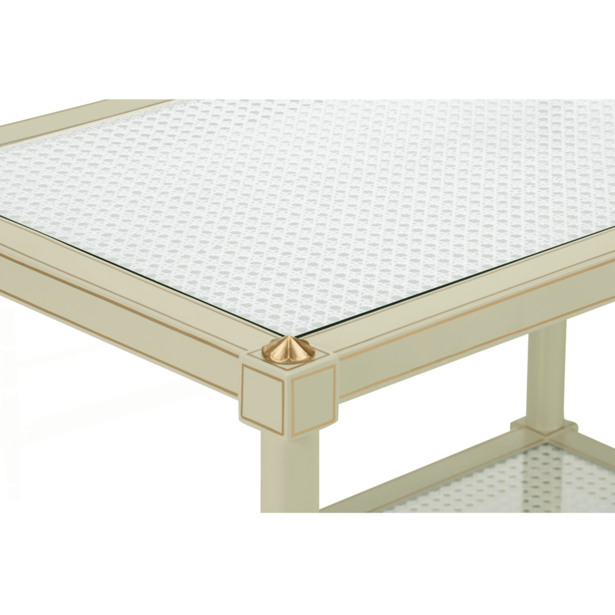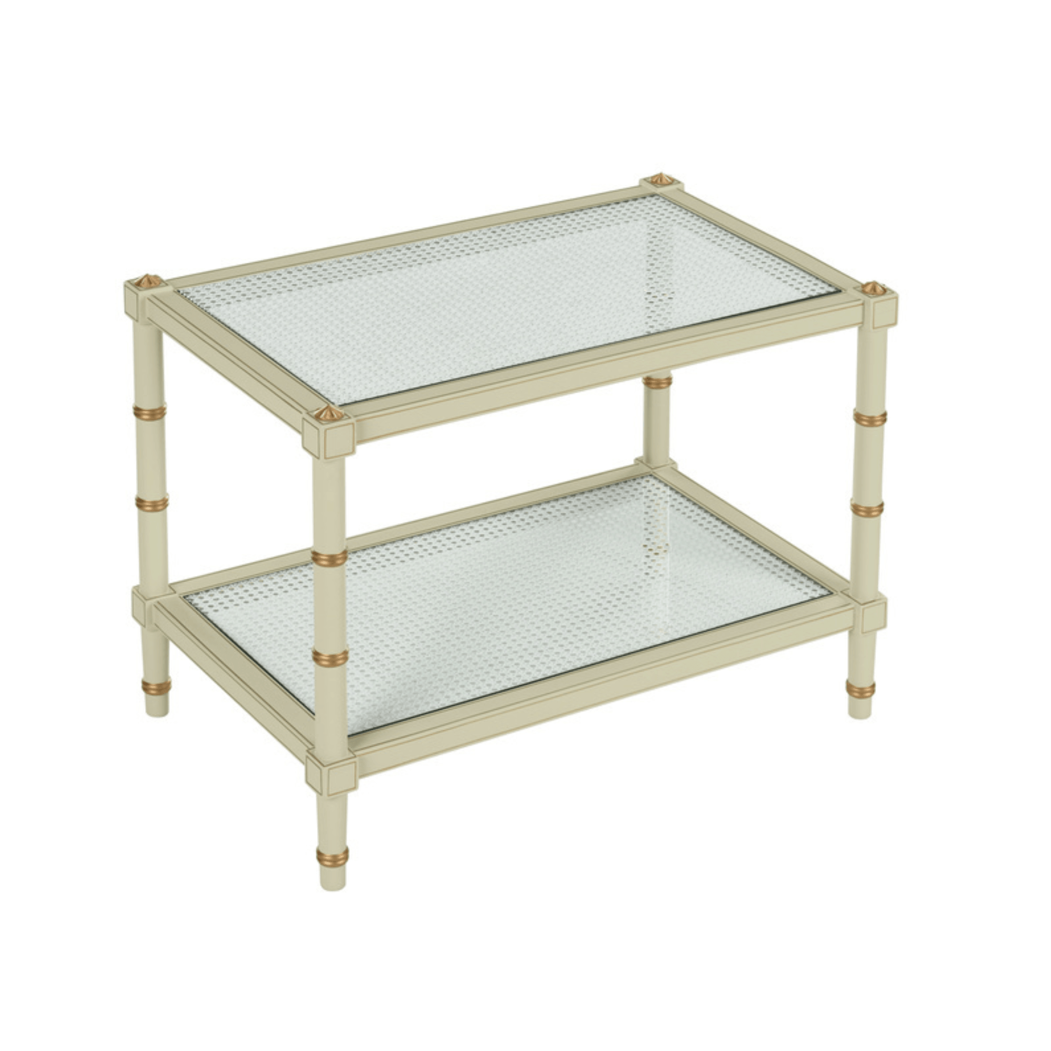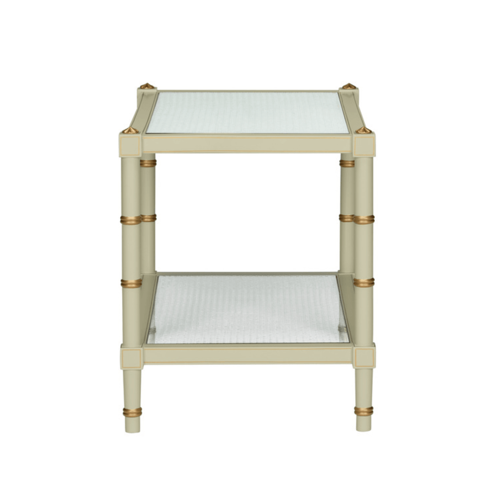 This elegant accent table in green is adorned with gold hand painted detailing around the edge of the bamboo-inspired legs and natural caned shelf. Perfect for any room that needs a subtle pop of color. Designed by Bill Cain.