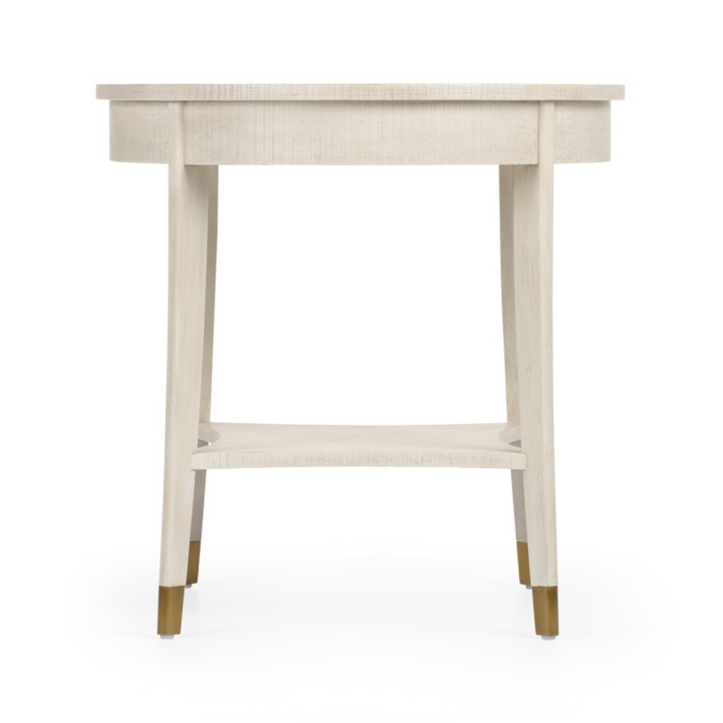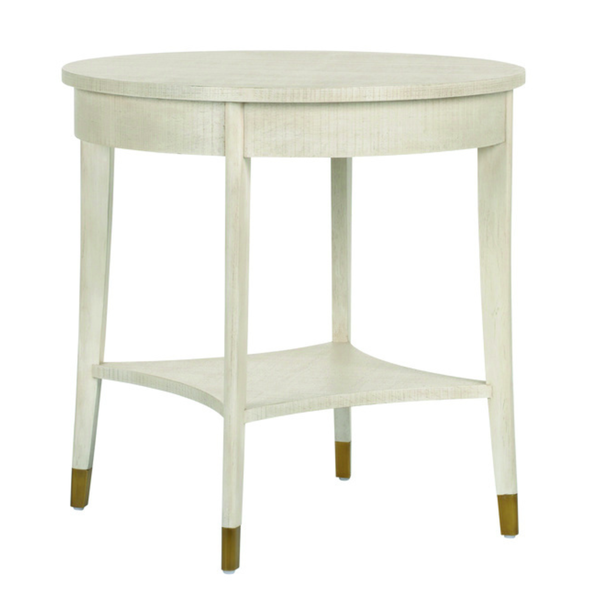 The Oaklee Collection features solid, hand finished cerused oak which highlights the texture of the natural wood grain and its rustic modern appeal. The end table has antique brass leg caps that add an upscale touch to the design. The round shape makes this an ideal table to use between two chairs in a conversation area.
