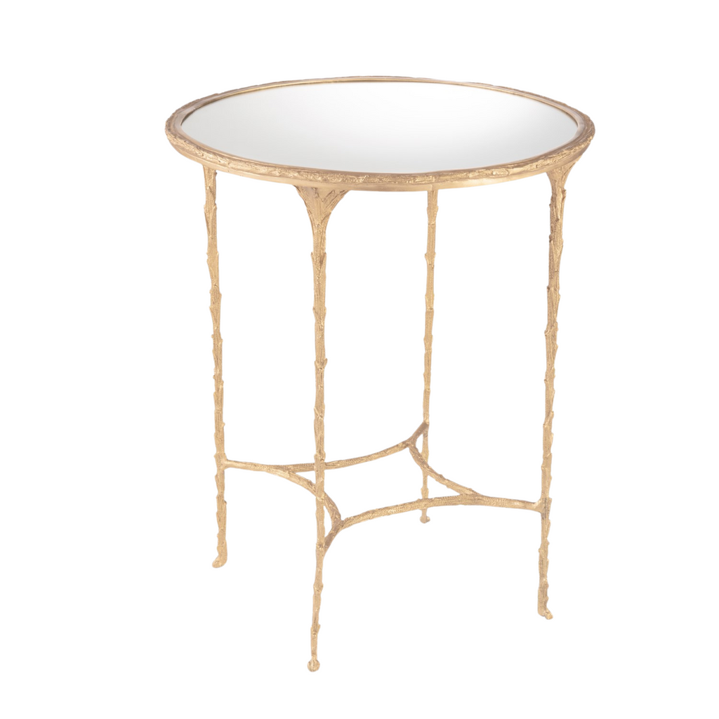 Leafy carvings cover the frame of this gilded table. The luxe brass finish and mirrored surface give your space classic glamour.