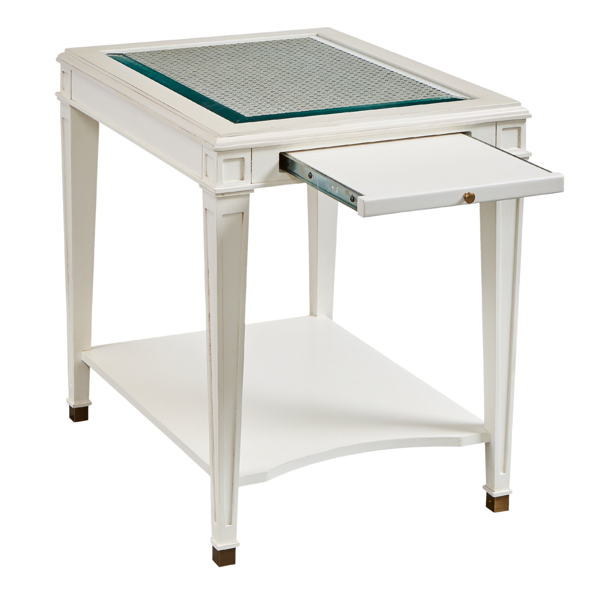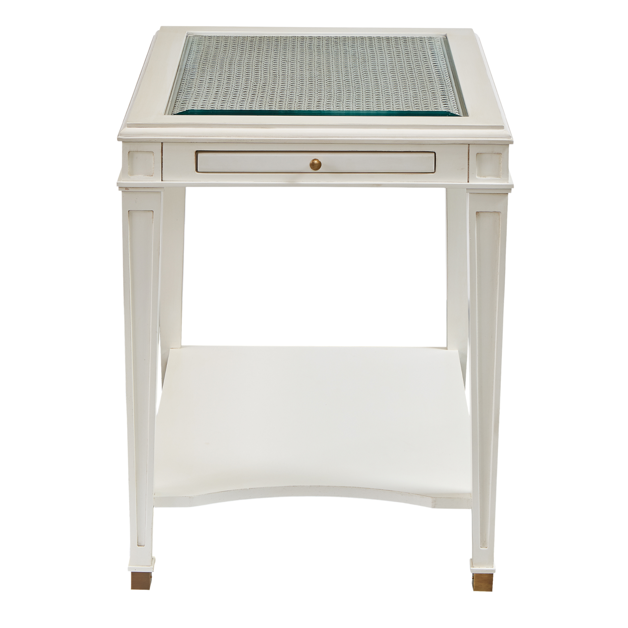 The Palm Beach End Table provides the same level of detailing as the rest of the collection. Maple solids and veneers with attention to design detailing with a shaped front lower shelf, inset cane and beveled glass top. This item was made in the USA by the skilled technicians who combine time-honored manufacturing techniques, and the highest quality materials, to hand build each piece of furniture for your home. With skill and care, they blend traditional American hand-craftsmanship.