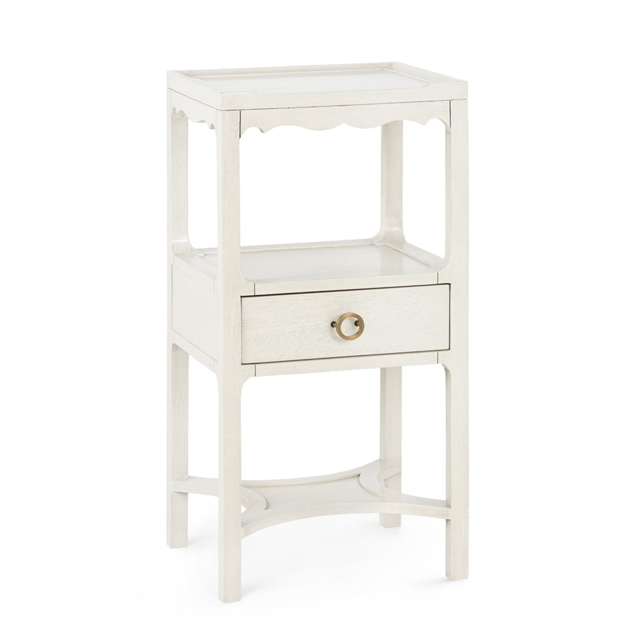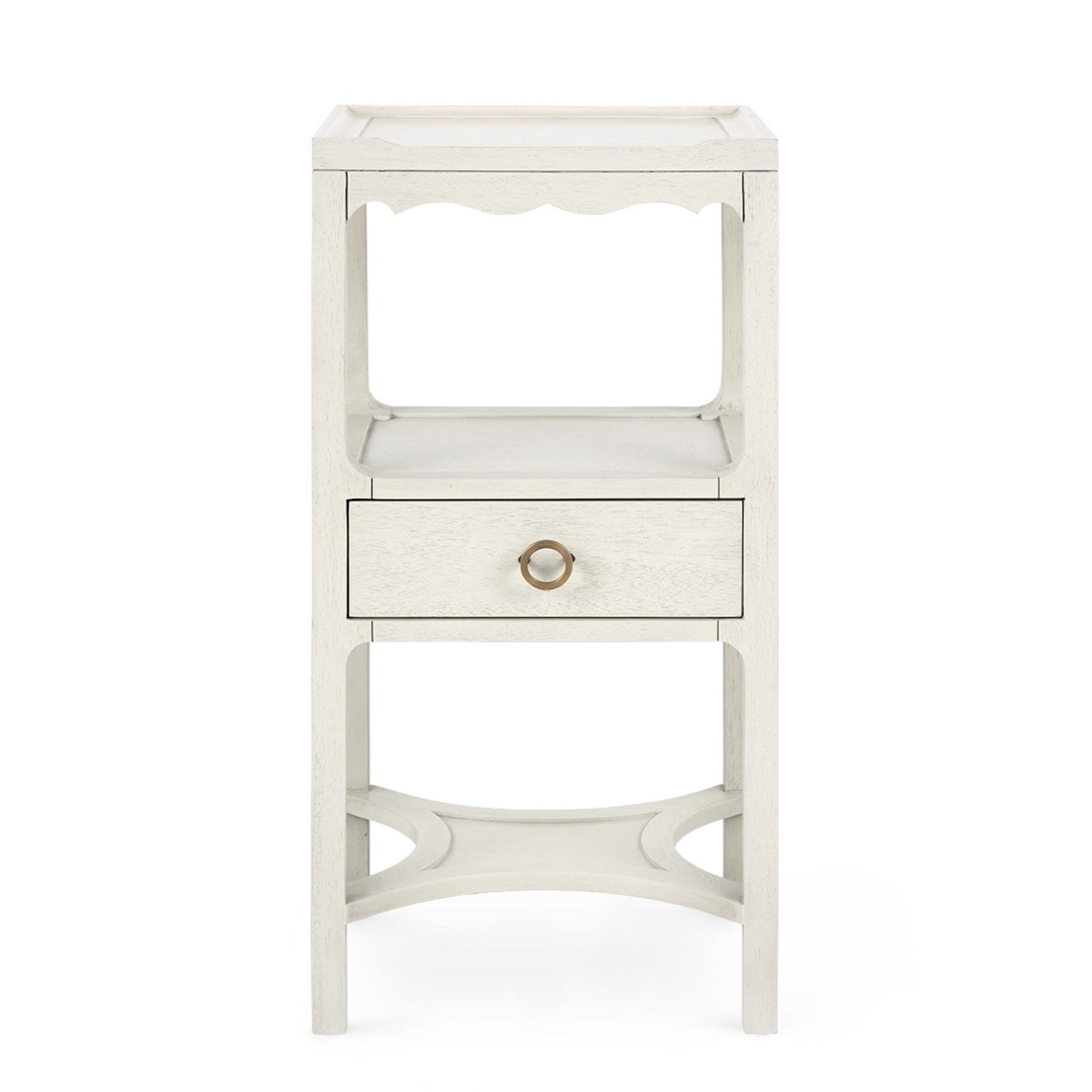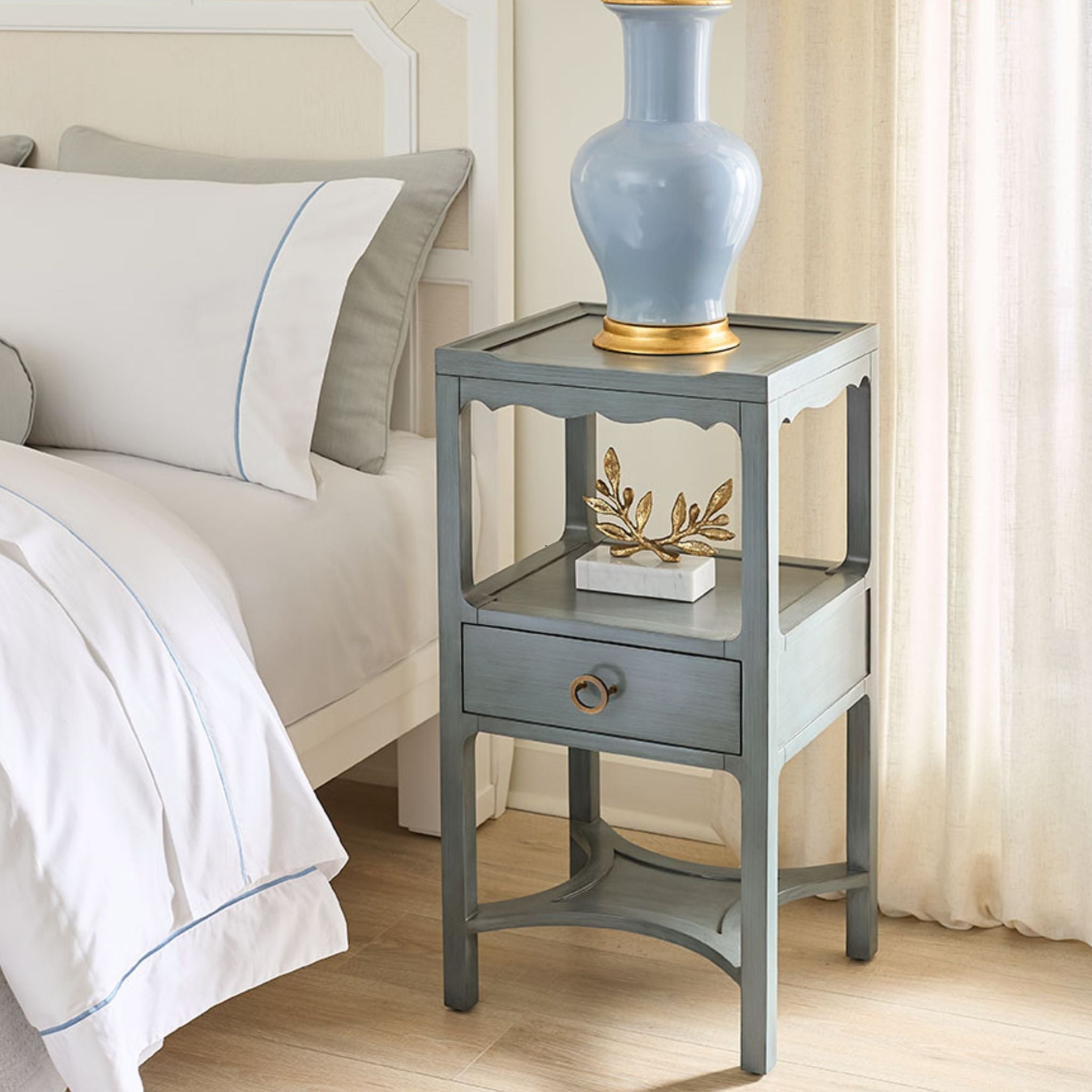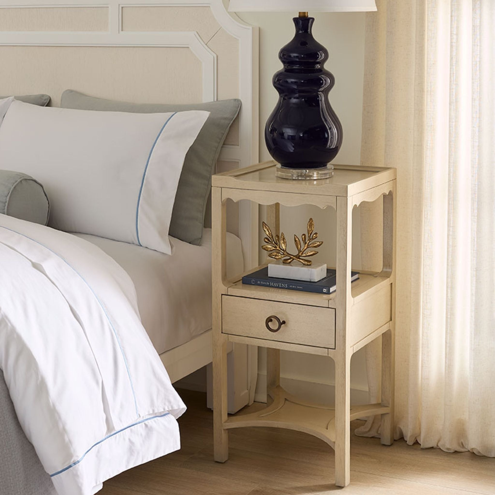 The Sara 1-Drawer Side Table blends vintage-inspired charm with a modern finish, featuring raised panel drawer detailing and softly curved aprons for a romantic, timeless look. Crafted from lacquered acacia wood, it offers a soft-close drawer and a refined silhouette that adds effortless elegance to any space.