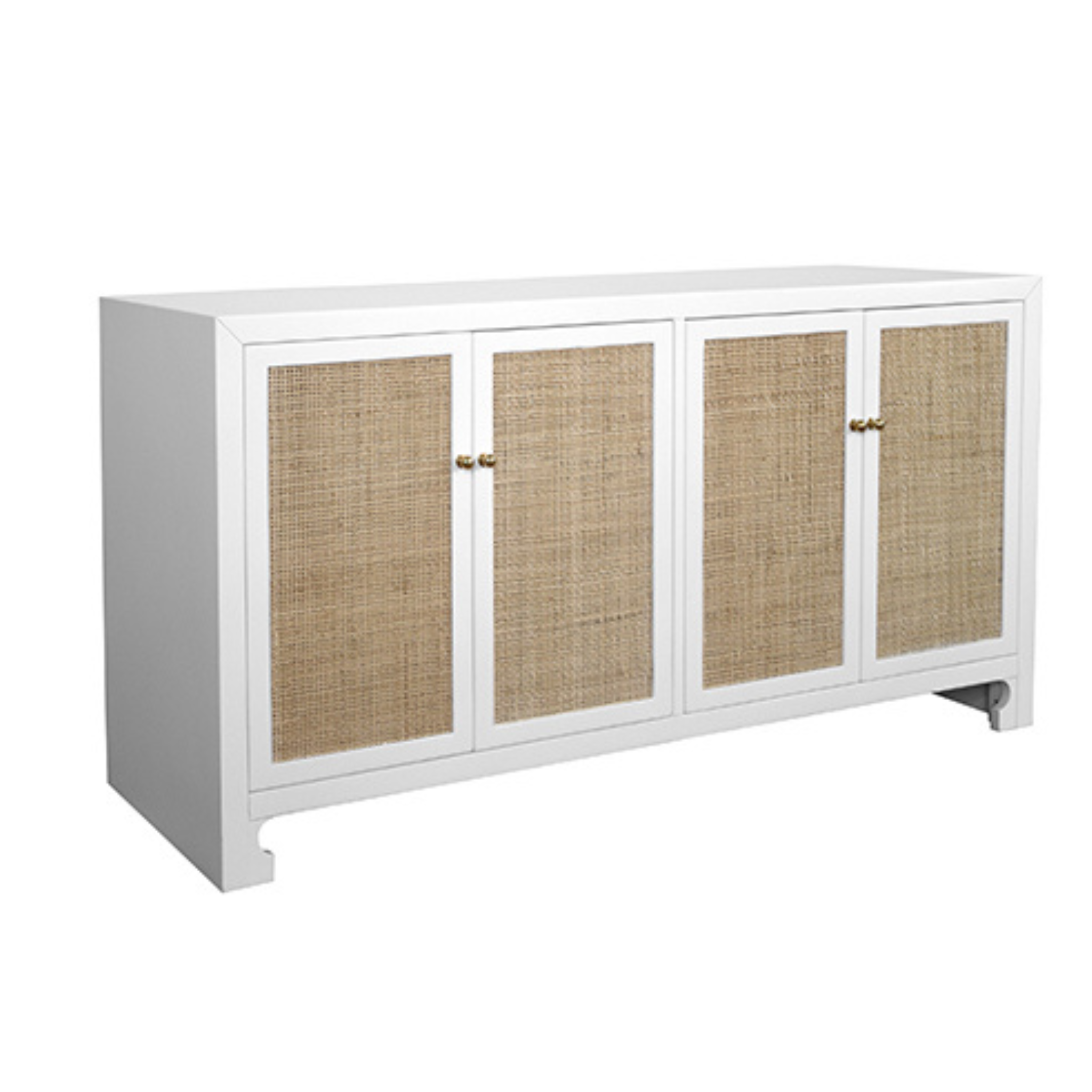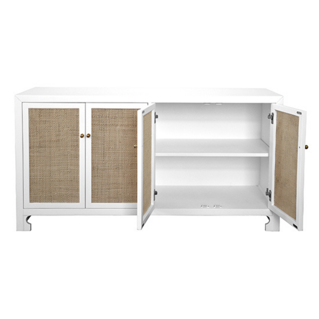 British West Indies style with a modern flair, this chic cabinet showcases natural, hand-woven caning on a crisp, matte white canvas. The result – a sublime composition that embodies casual elegance. Includes adjustable shelves in each cabinet. Whether placed in a coastal retreat or downtown loft, Sofia complements any design motif.