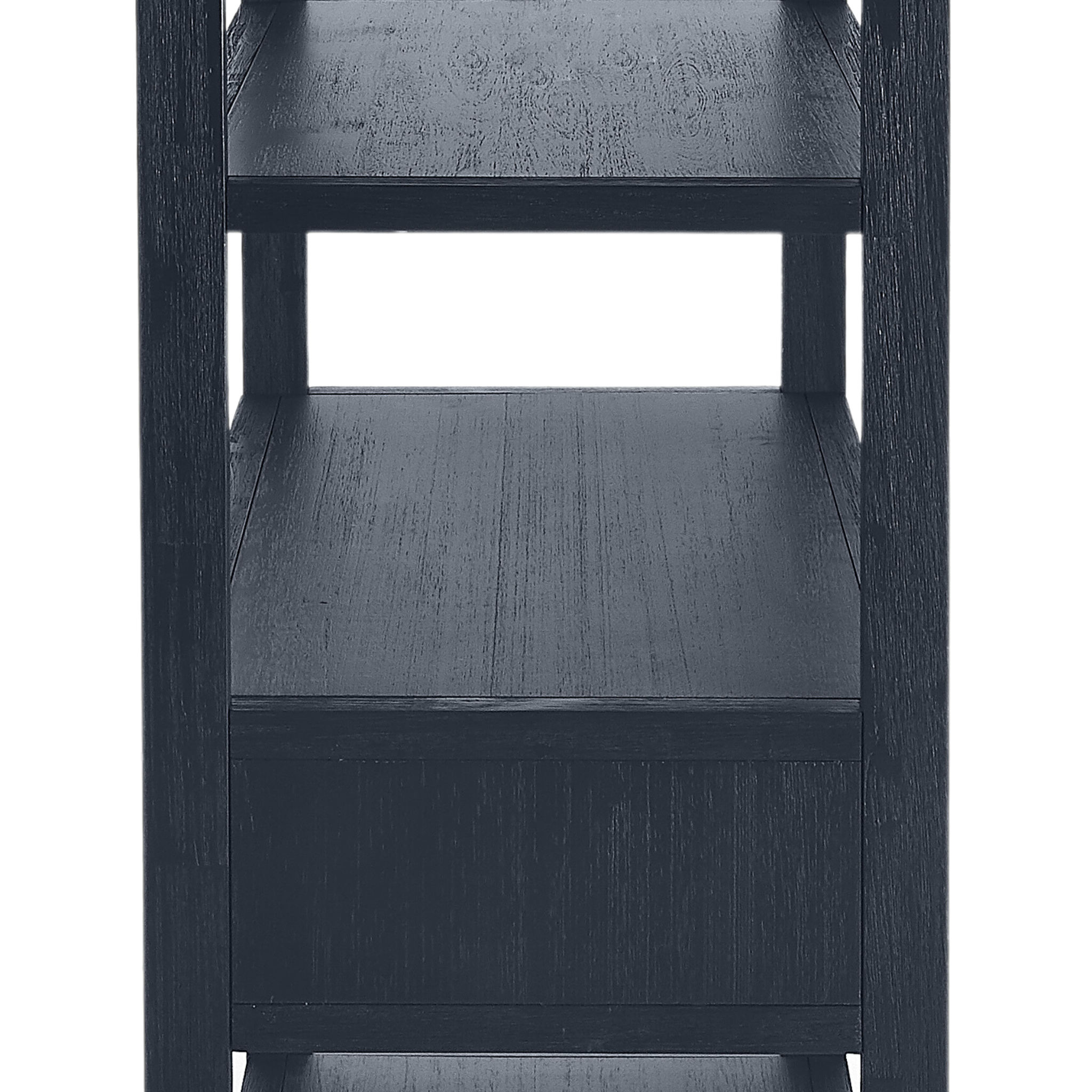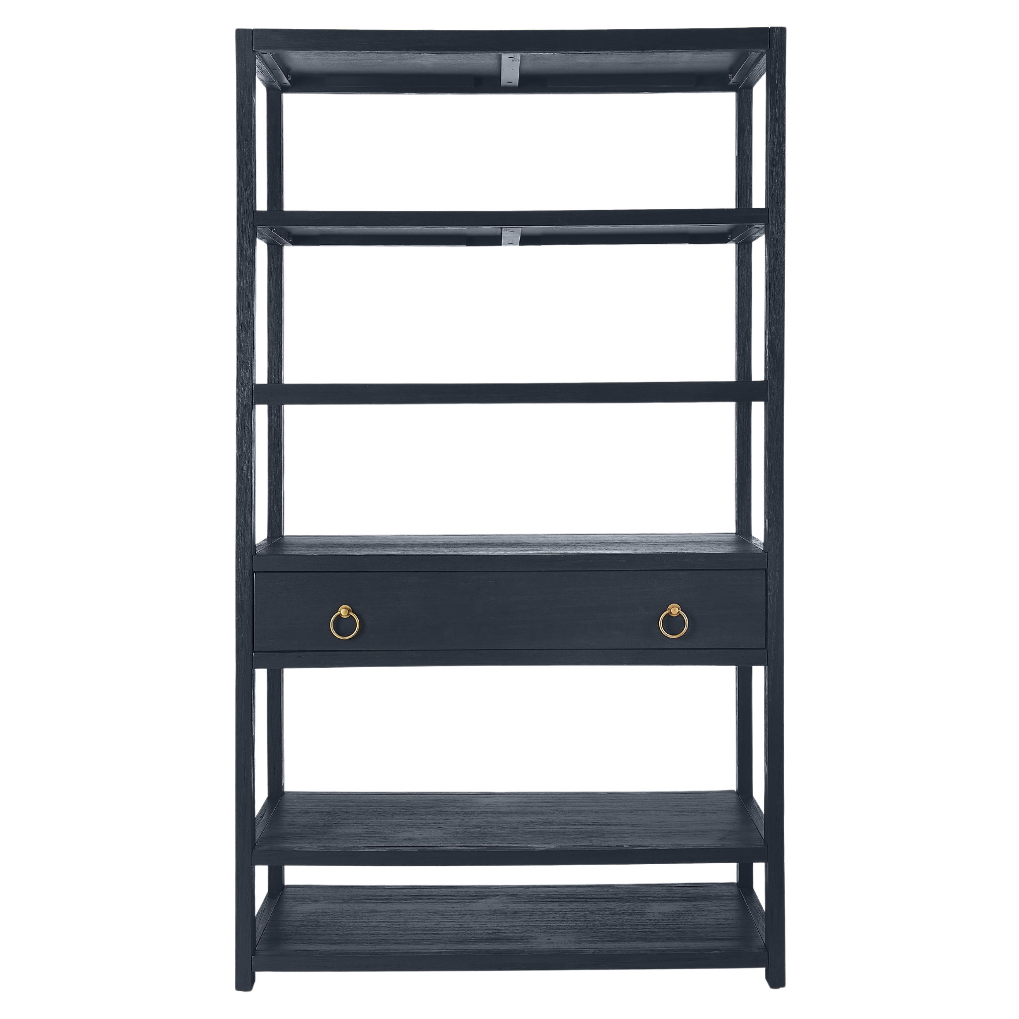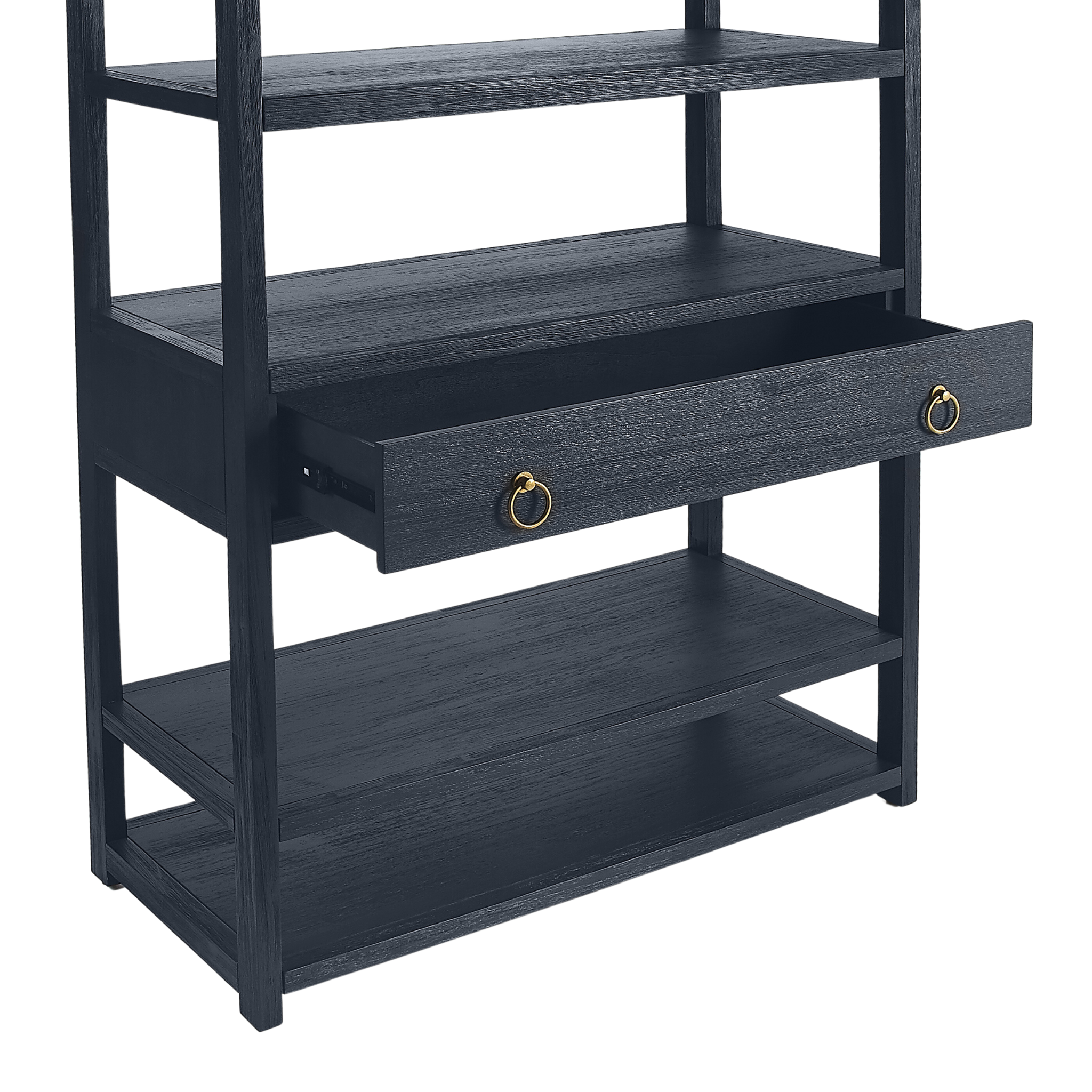 The tall bookcase provides a transitional modern style with a pop of color and the glam of its gold metallic hardware. The colorway of the brushed wood veneers lends beauty and elegance to the style. The functional 5 shelves offer fantastic storage space while the storage drawer is adorned with gleaming metallic gold statement hardware. The simplicity of this design allows storage to be prominently displayed while surrounded by color to enhance every room. The statement of color and glam is all yours with this style and the coordinating style pieces.