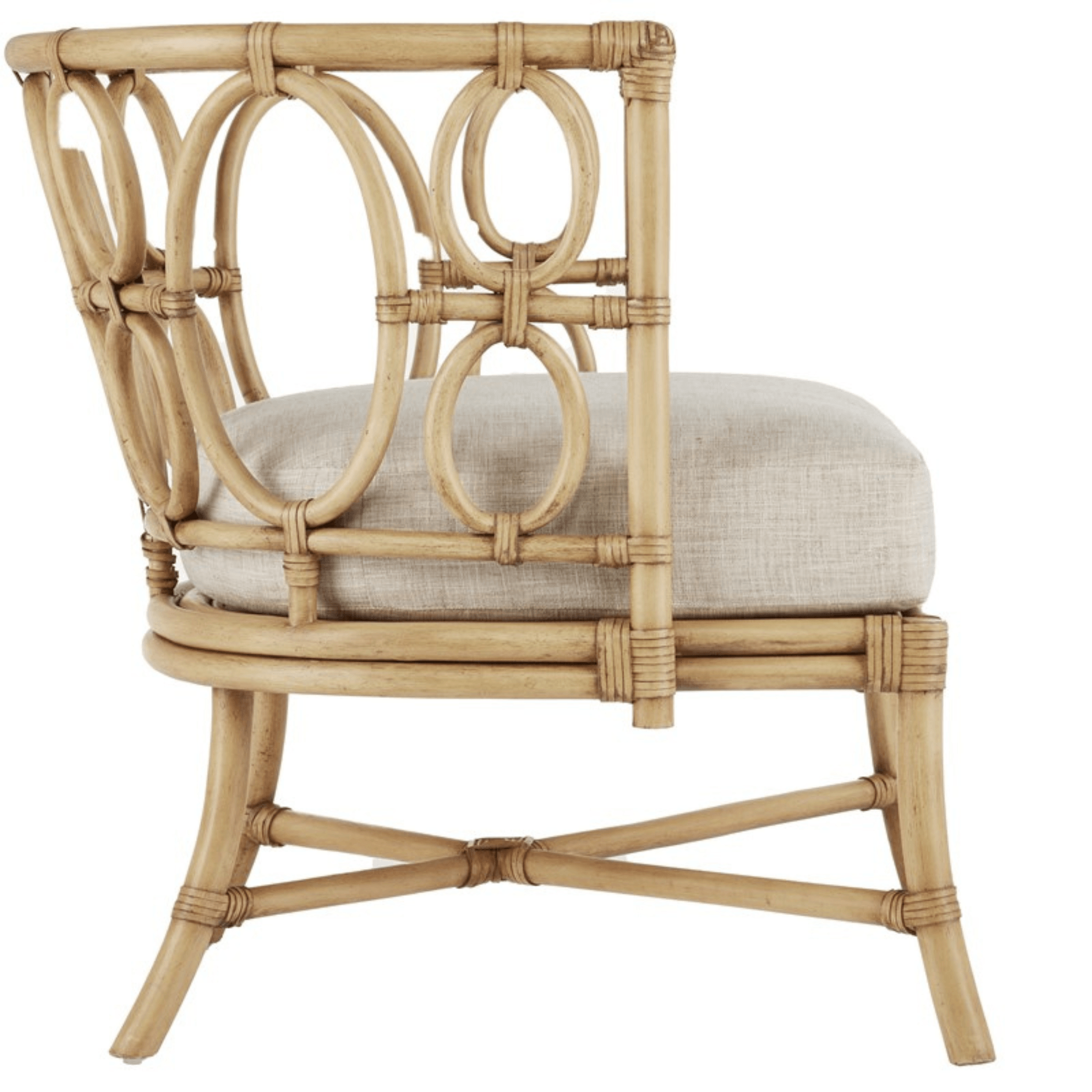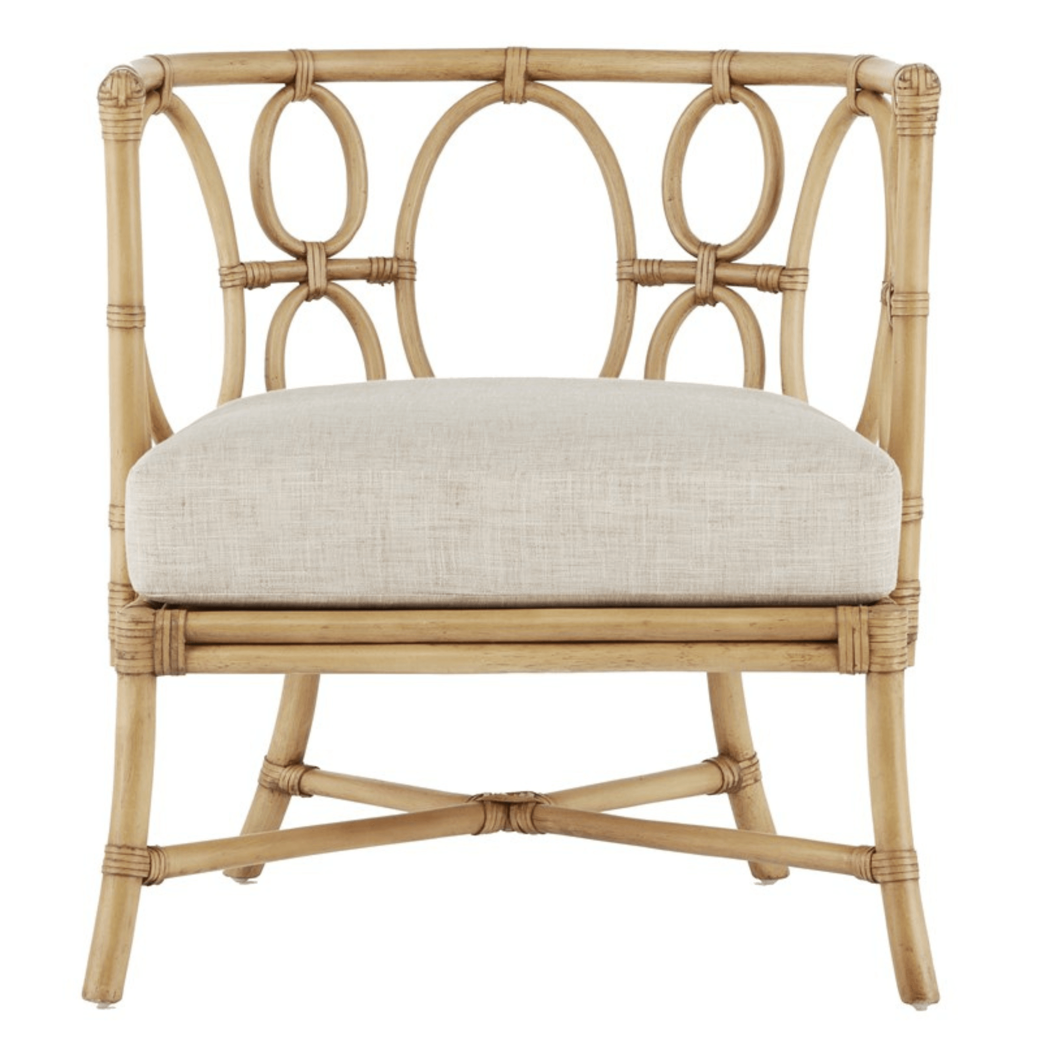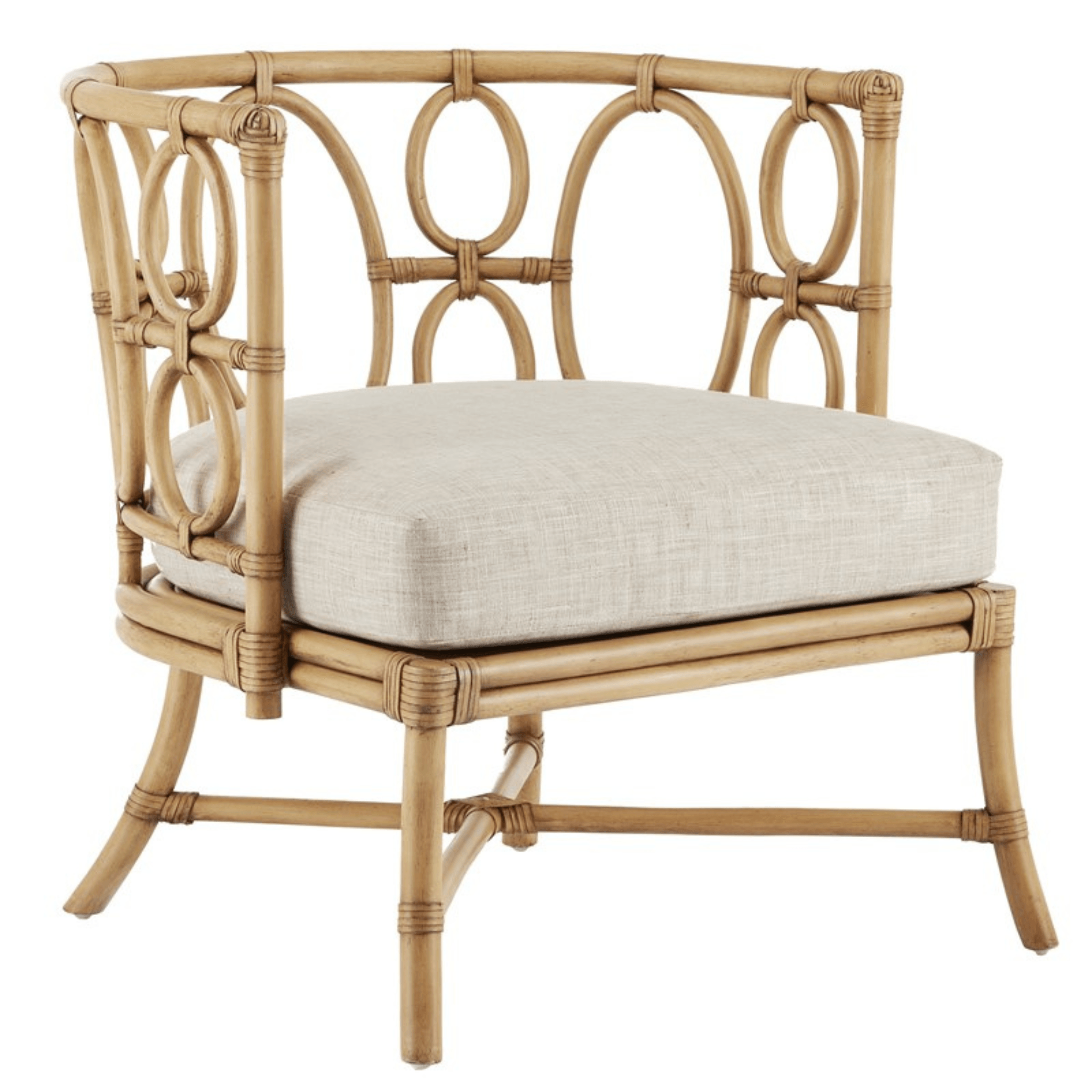 The Tegal Natural Chair is made of solid rattan using a very traditional rattan construction technique. But instead of thinner reeds, the ties on this rattan chair are made of leather. The chair, which will fast become a favorite in a variety of spaces including sunrooms and beachside living rooms, has a name inspired by a city in Central Java, an Indonesian country known for fine rattan craftsmanship. The natural material has a Sea Sand on Rattan finish. Click images for greater detail.