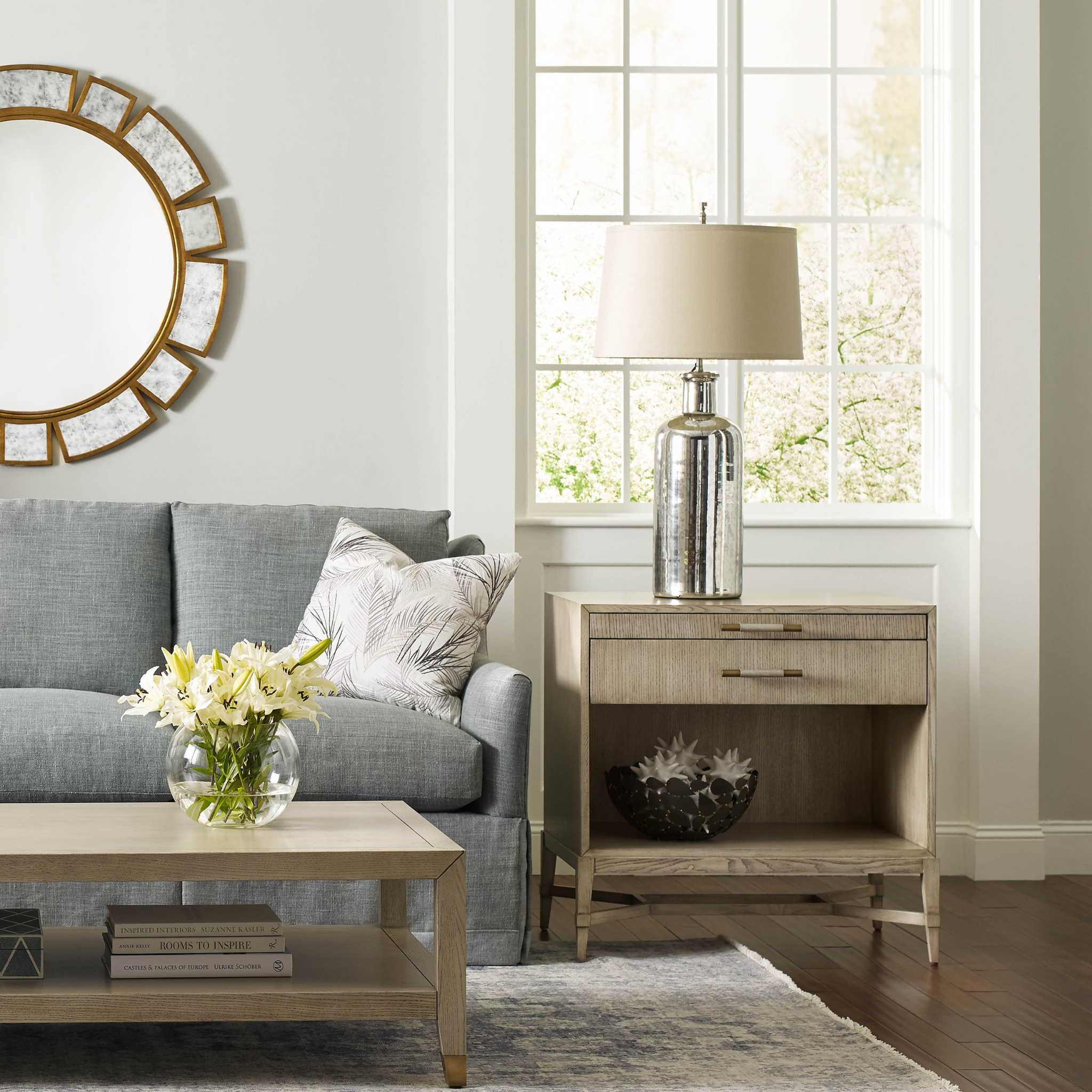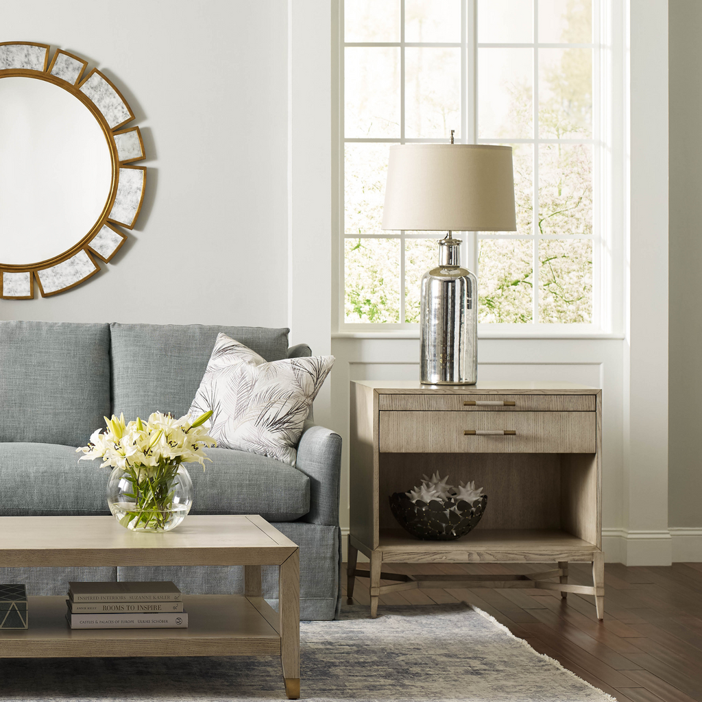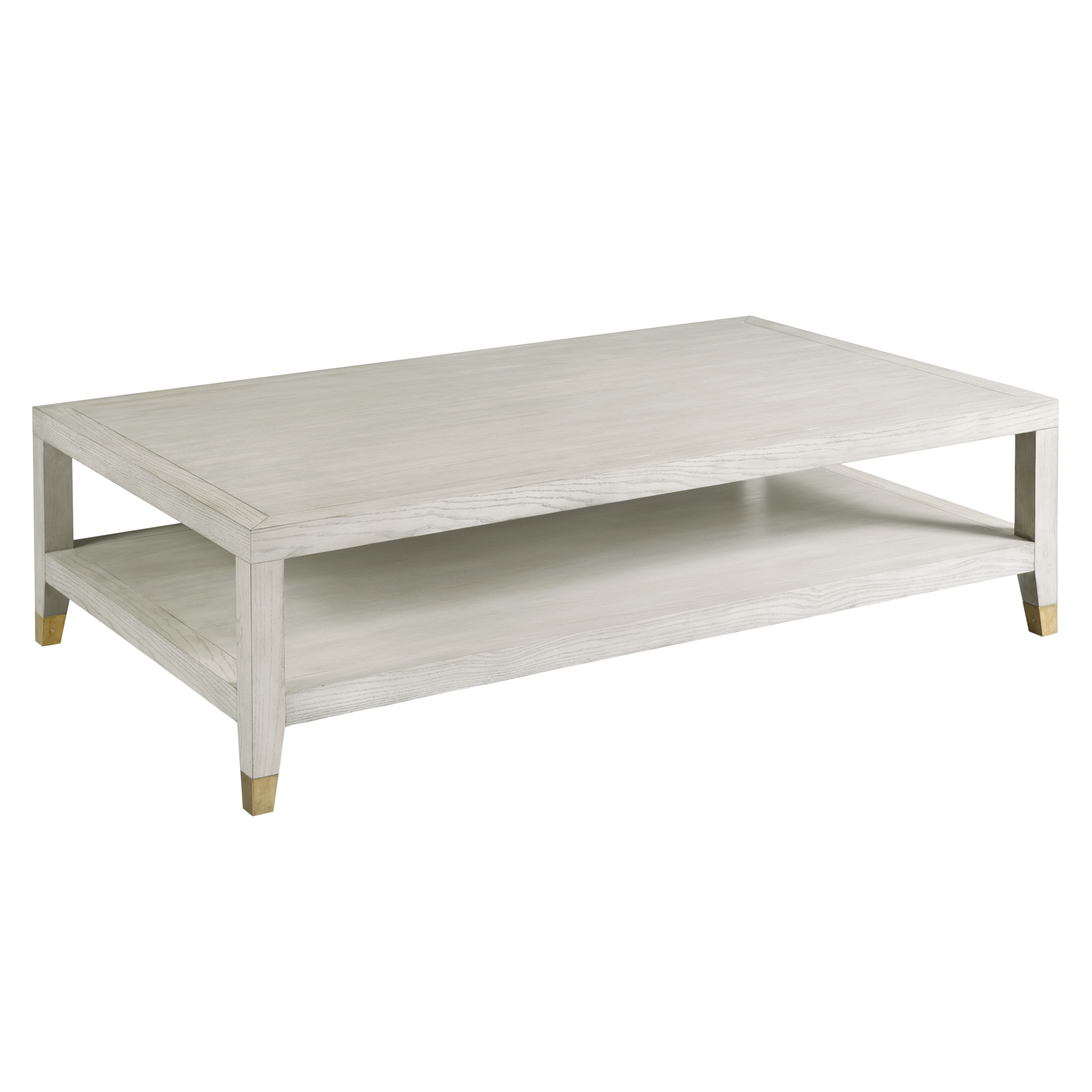 A rectangular framed top veneered with quarter sawn ash is elevated by squared corner posts over a low shelf.