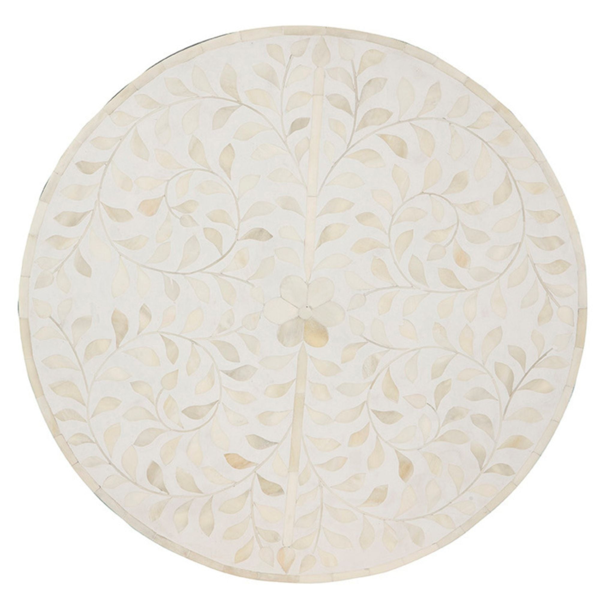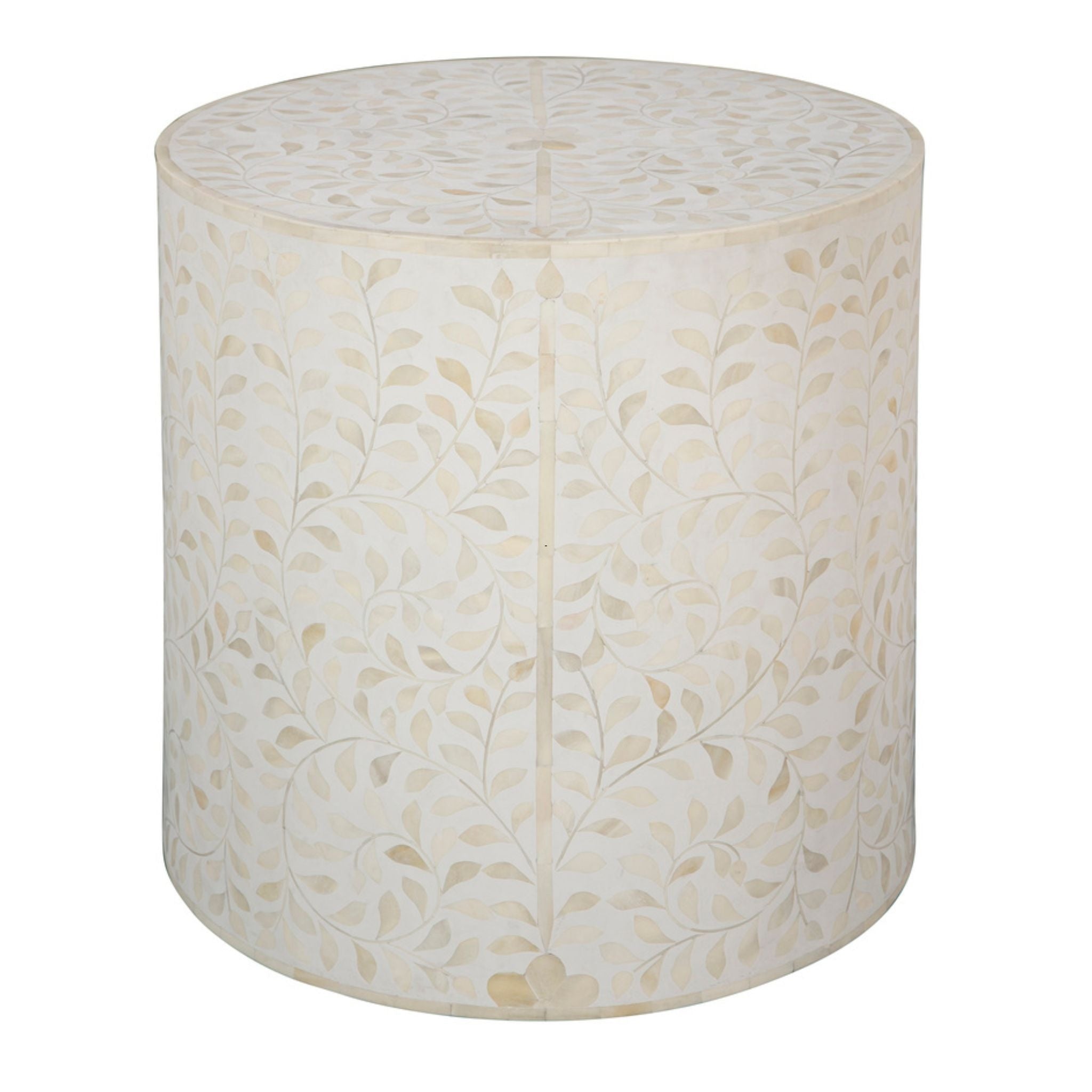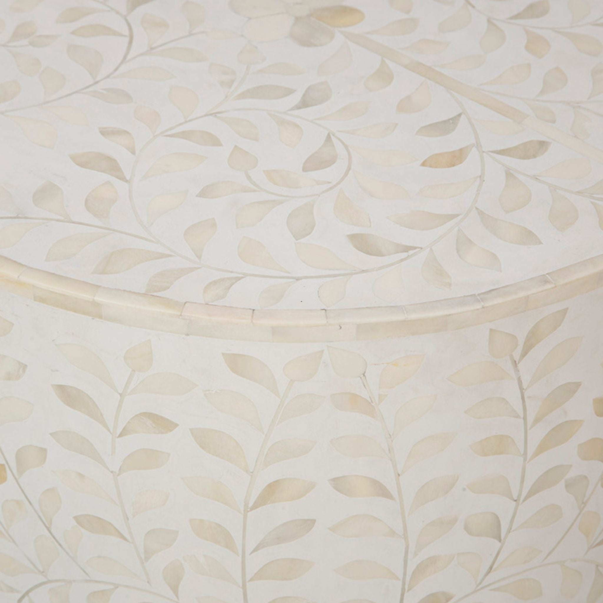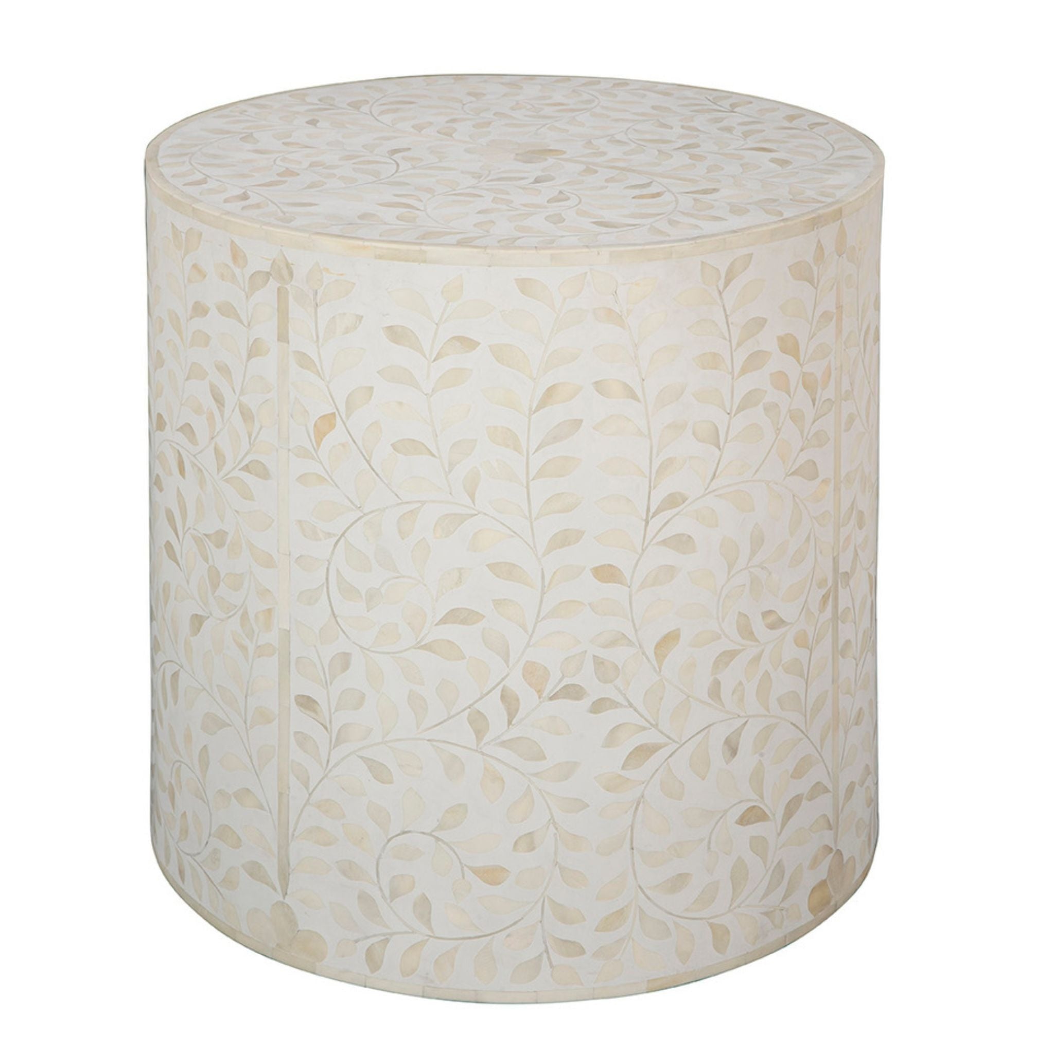 The White Shell End Table features intricate shell and bone inlay set in pearl white resin, creating a sophisticated and artistic accent piece.