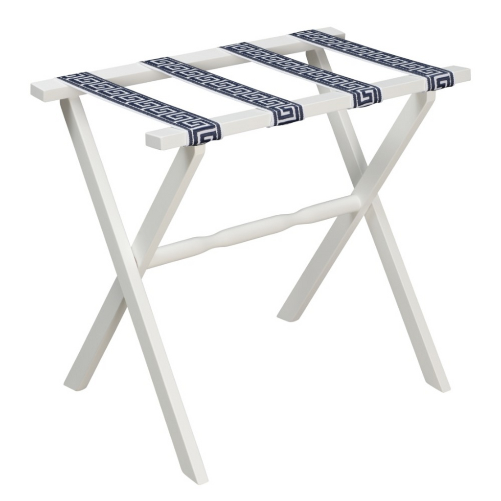 White Straight Leg Wood Luggage Rack with 4 White & Sky Blue Greek Key Straps
