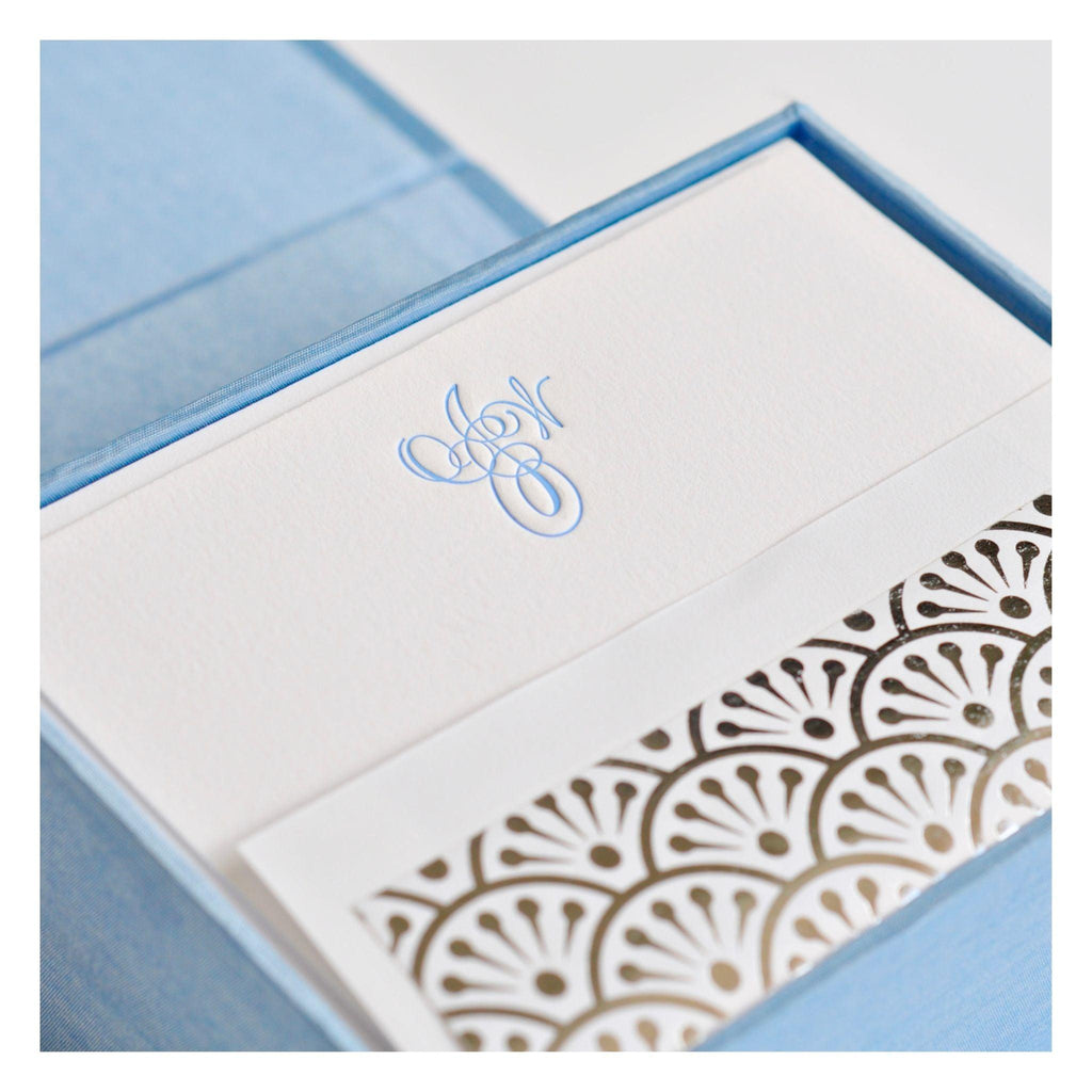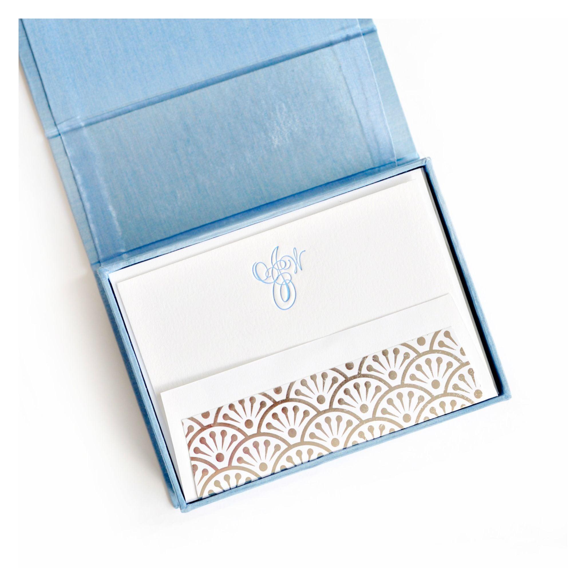 Our Petite Silk Stationery Box is the perfect gift for the stationery aficionado in your life and you're going to love personalizing this beautifully letterpressed stationery box just for them! Each box comes with 35 pieces of custom printed, 1-color letterpress stationery. Return address is additionally available in both flat printing and letterpress. Envelope liners are optional.