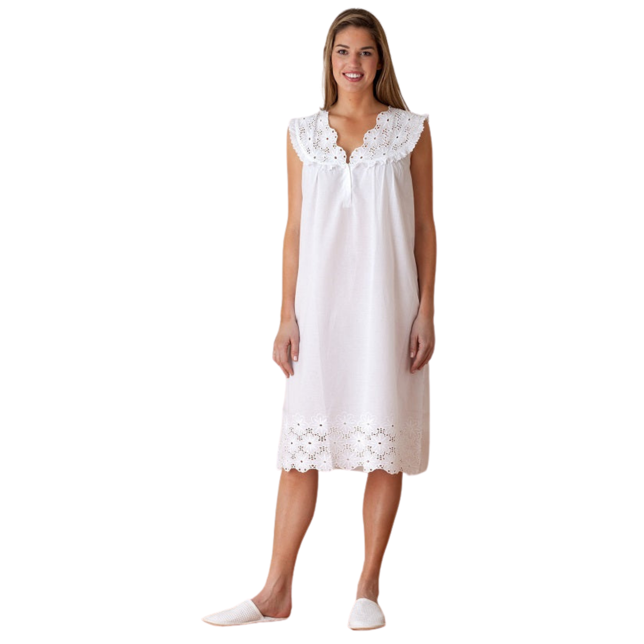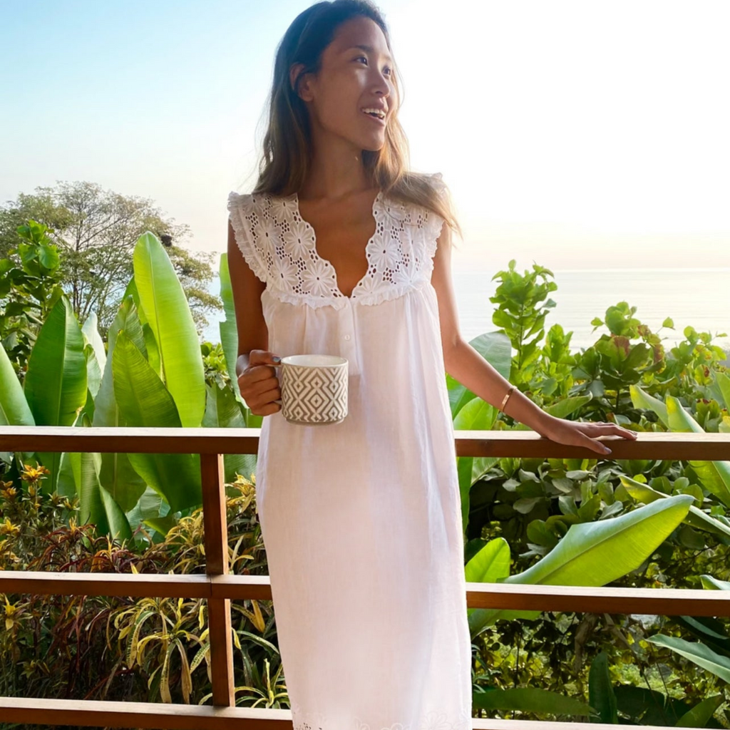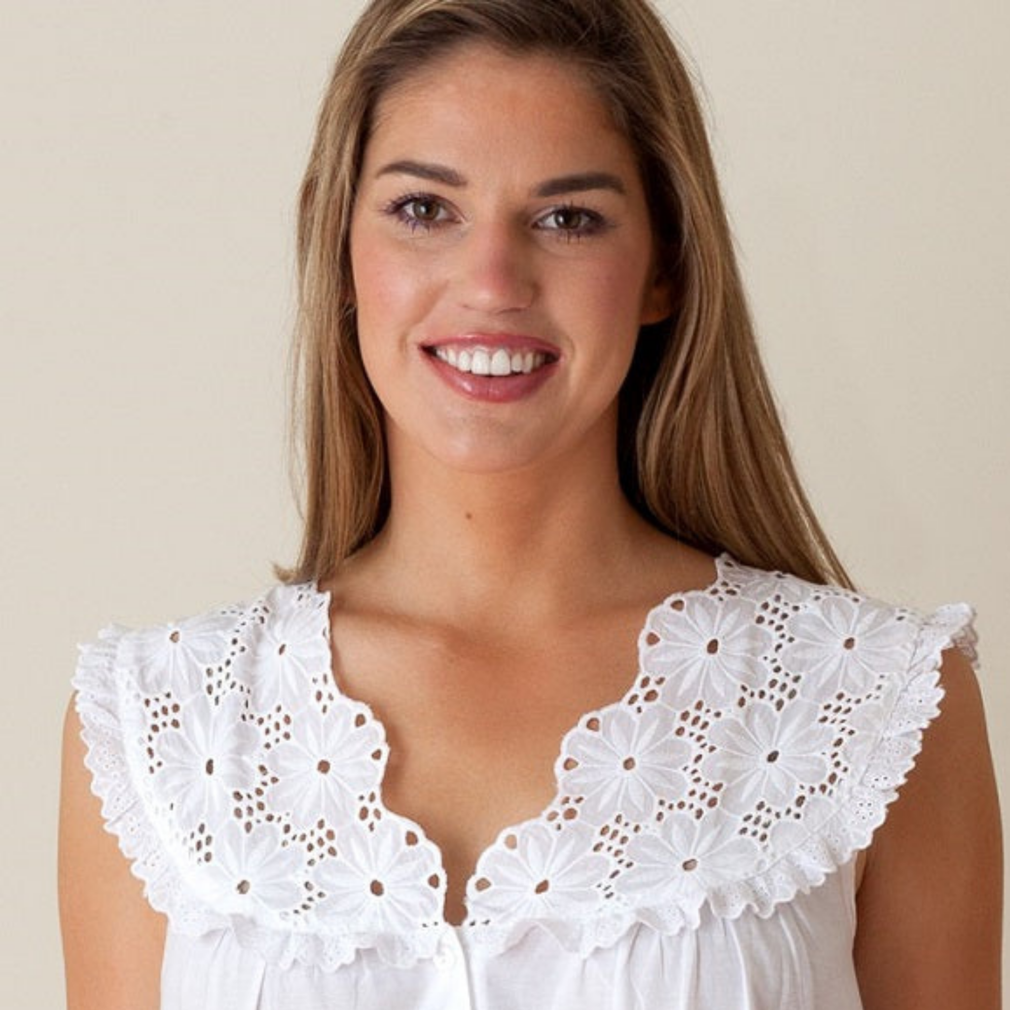 The Eloise nightgown features eyelet lace in a beautiful design on the bodice and hem. It is an elegant and timeless style. A perfect choice for a bride-to-be who wants to slip on something special on their honeymoon or for their bridal weekend. This nightie is super flexible and allows you to move freely when you sleep. It fits true to size and is easy to wash and care for on gentle cycle with delicates.