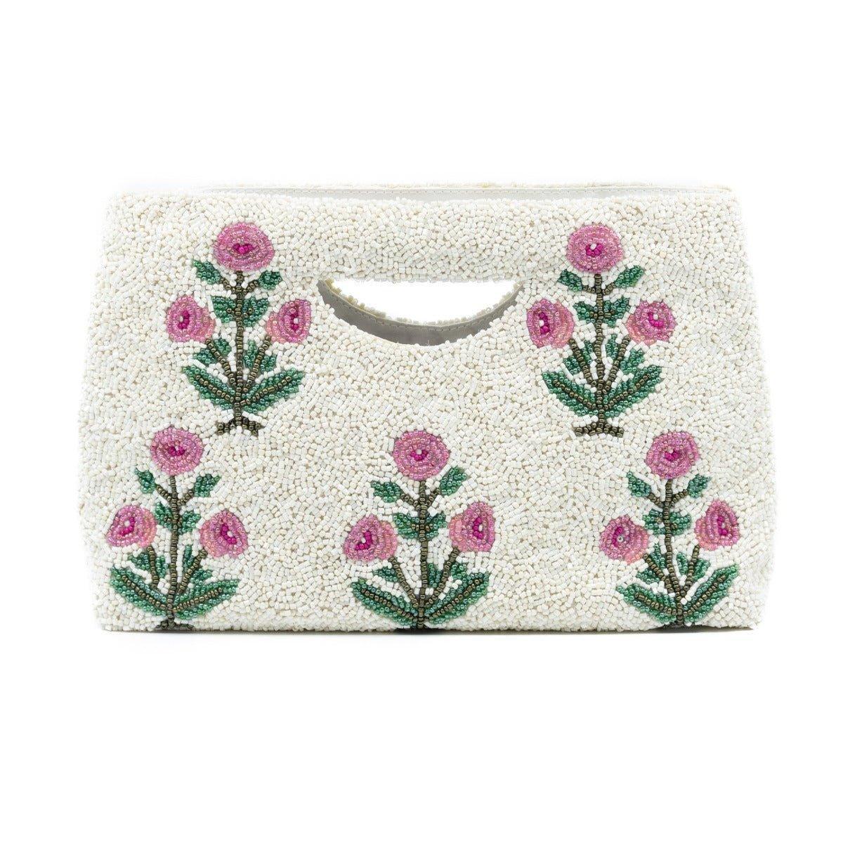 White & Pink Beaded Floral Motif Handbag With Gusset