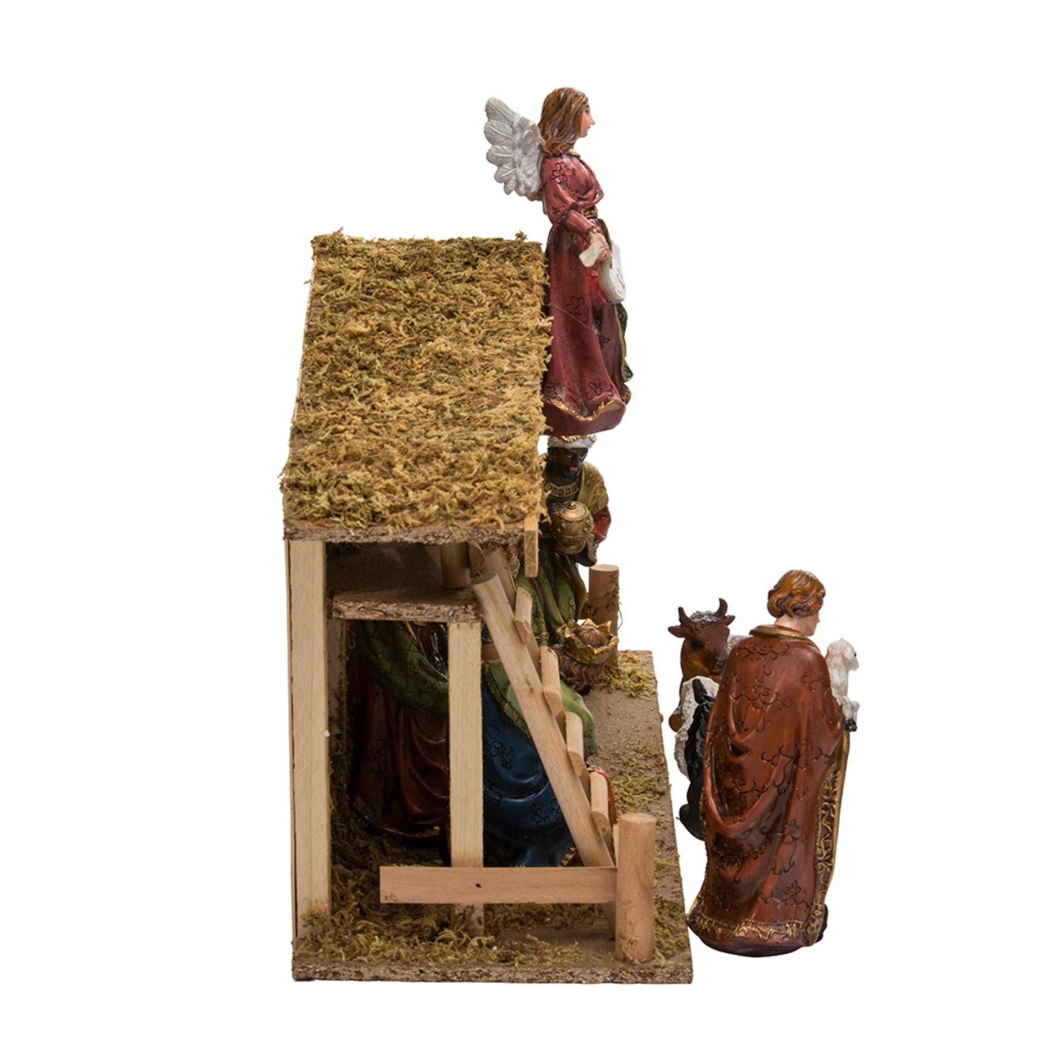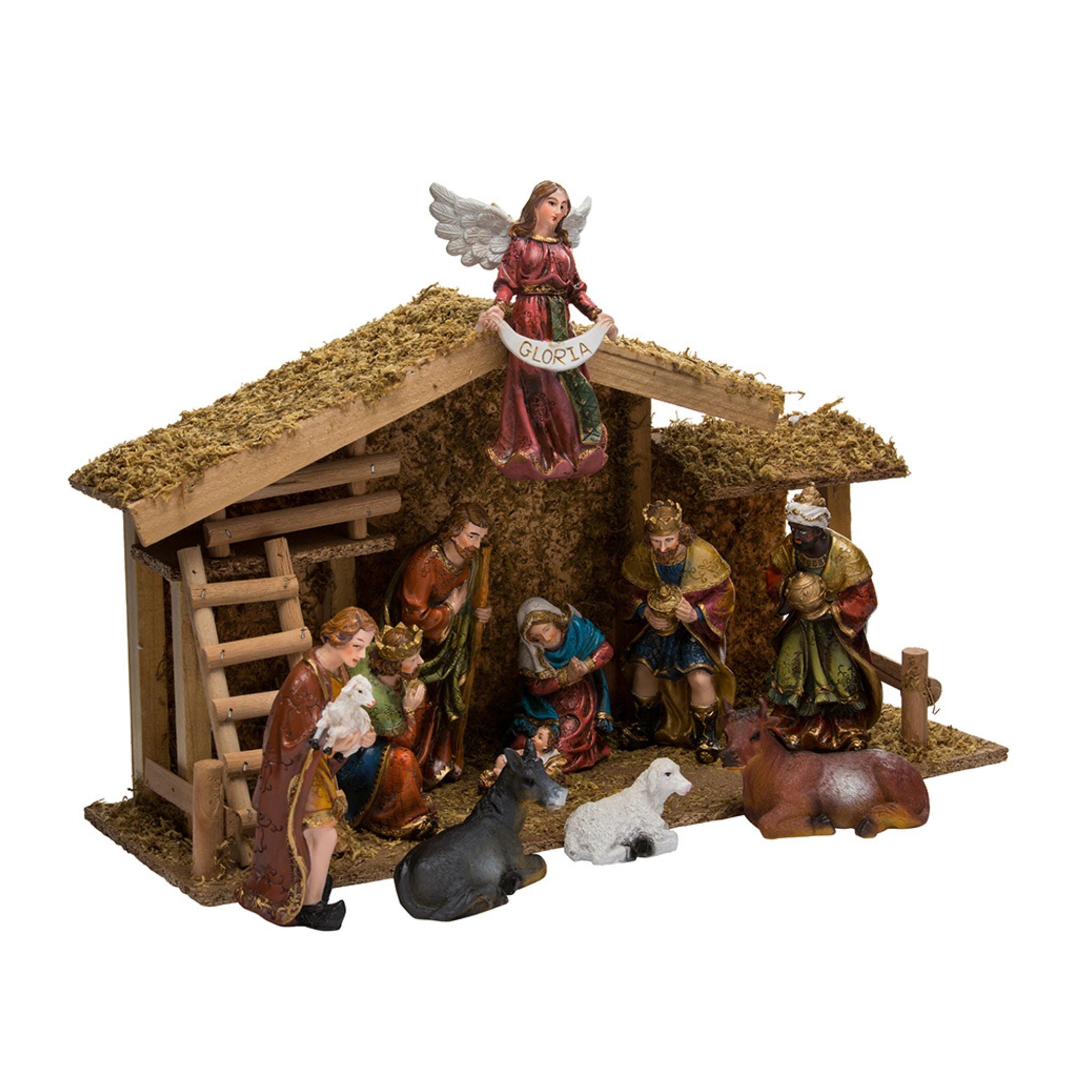 The 12-piece nativity set with a wooden stable is a classic, traditional way to add to your holiday décor. This moss-covered wooden stable houses all the key figures of the first Christmas in painted porcelain: the Holy Family, the Three Wise Men, a shepherd, a cow, a donkey, a sheep, and an angel holding a sign that reads, "Gloria." It will undoubtedly serve as a reminder of the true meaning of Christmas throughout the busy holiday season.