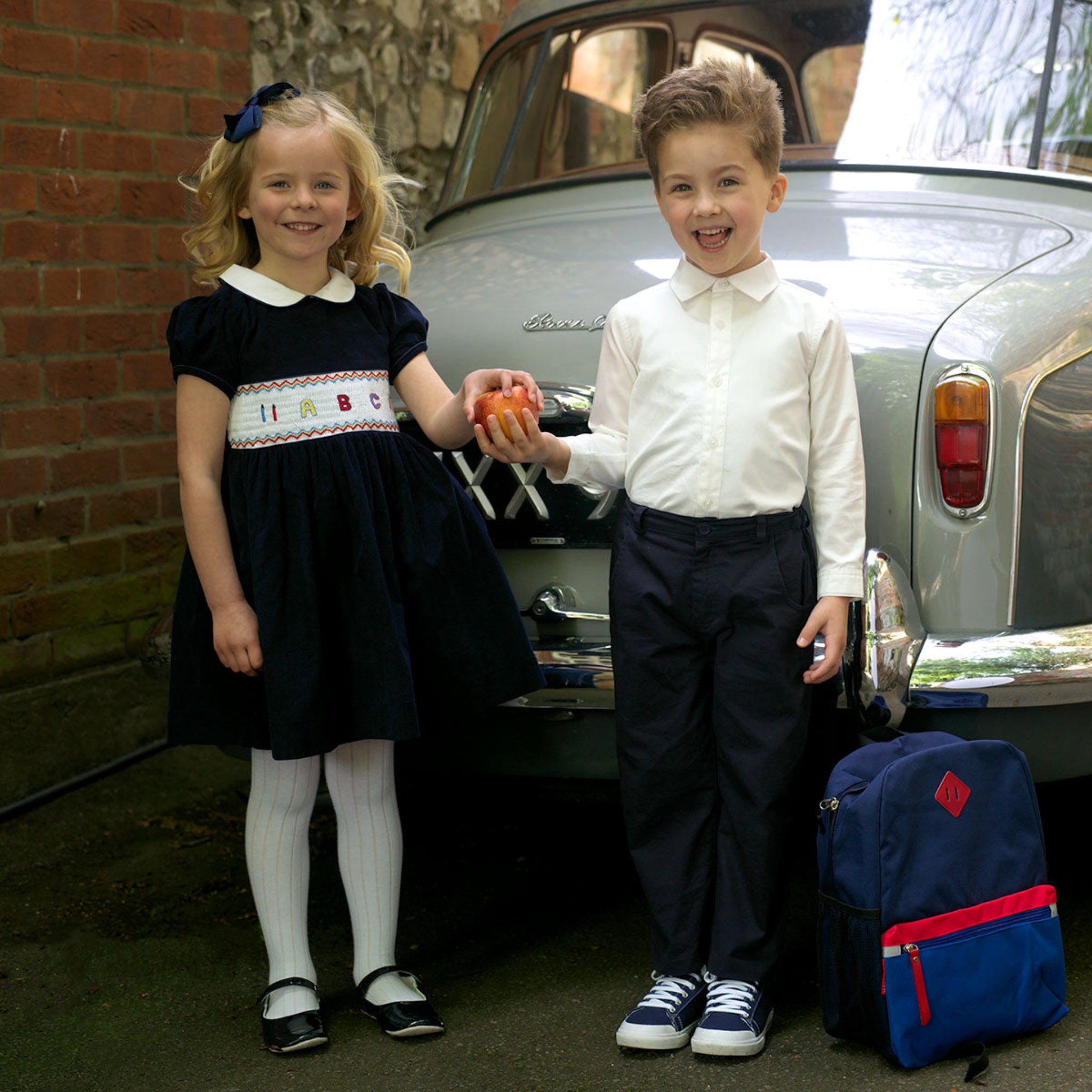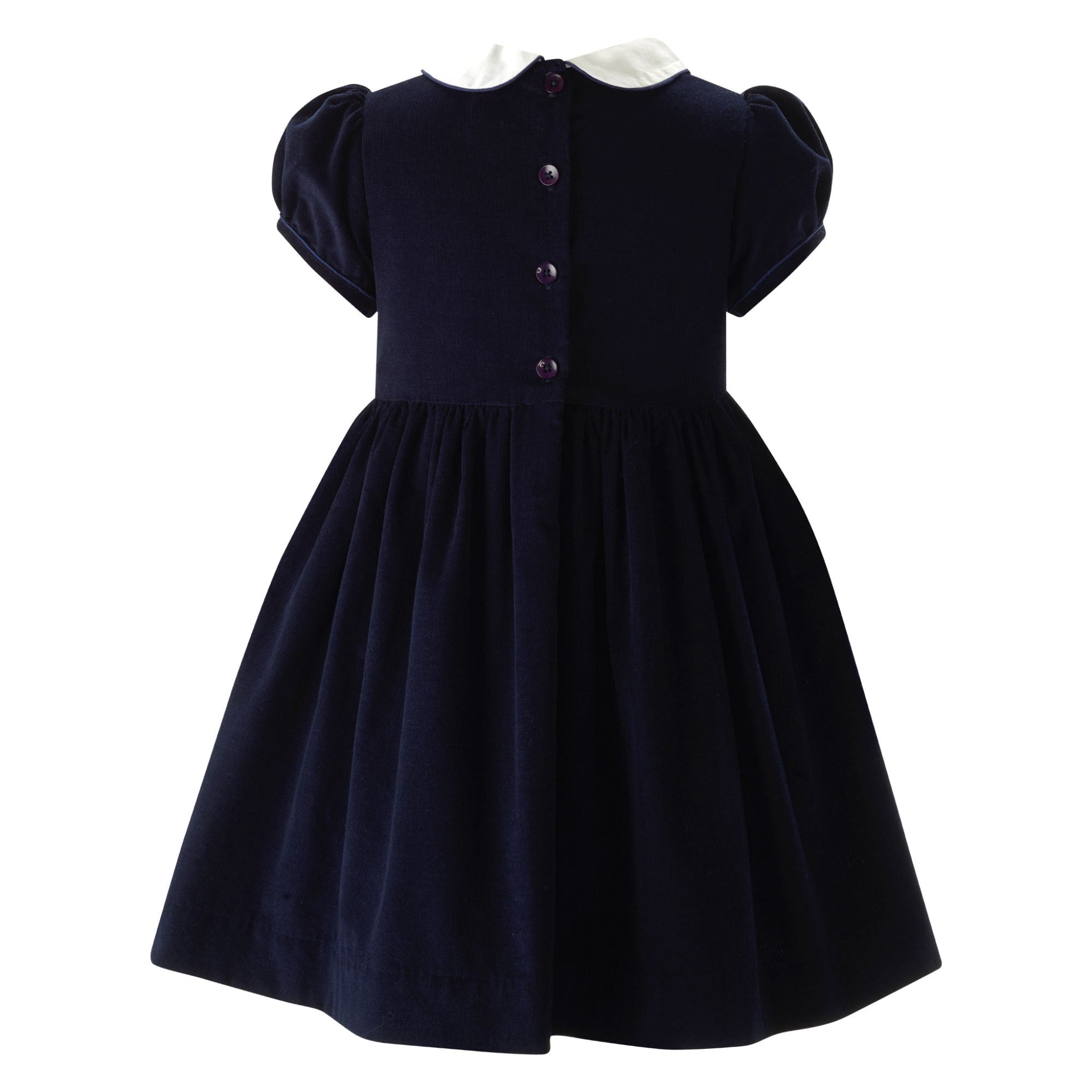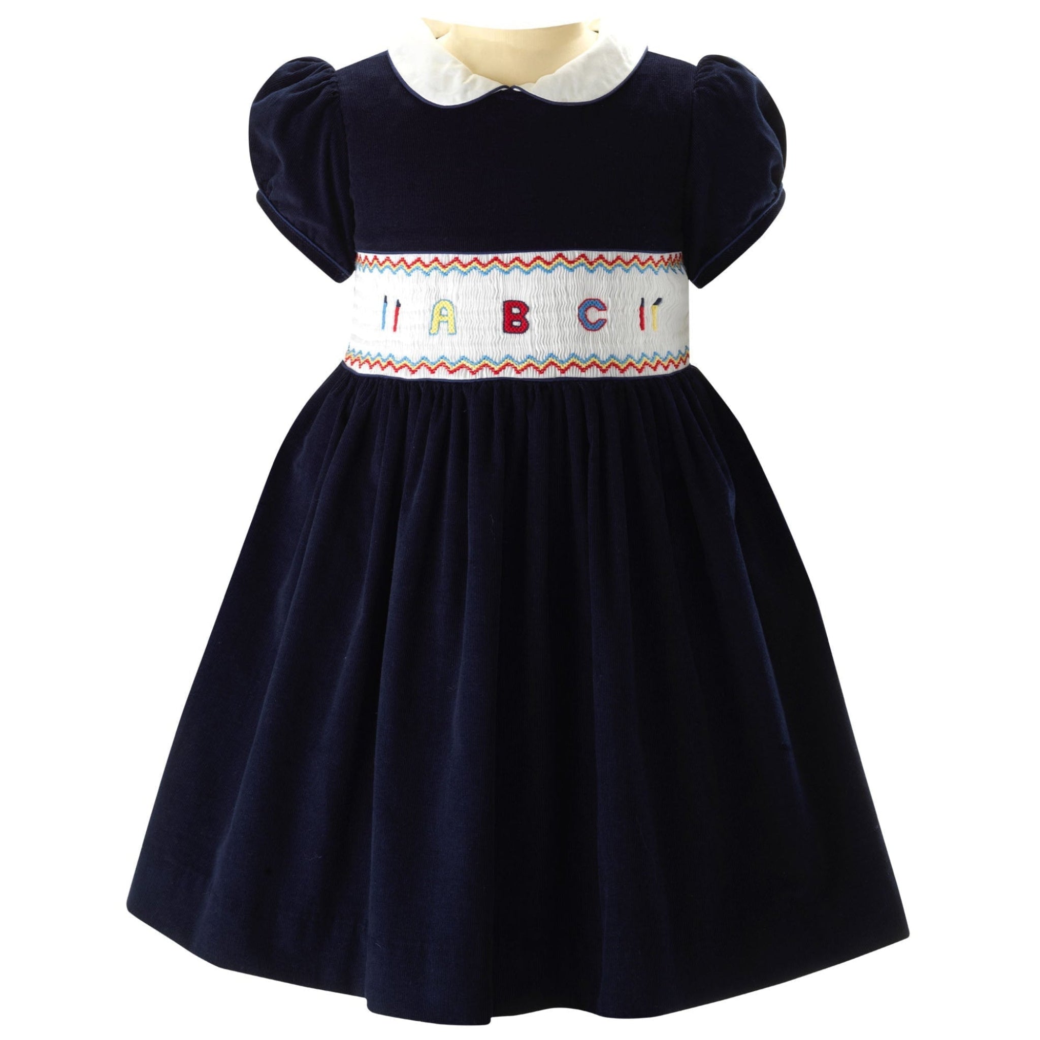 The ABC Smocked Dress is an adorable children’s navy cotton dress featuring classic puff sleeves, a gathered skirt, and a contrasting ivory Peter Pan collar. It’s detailed with sweet multicolored ABC embroidery across the smocked front bodice, making it charming and perfect for special occasions or photos.