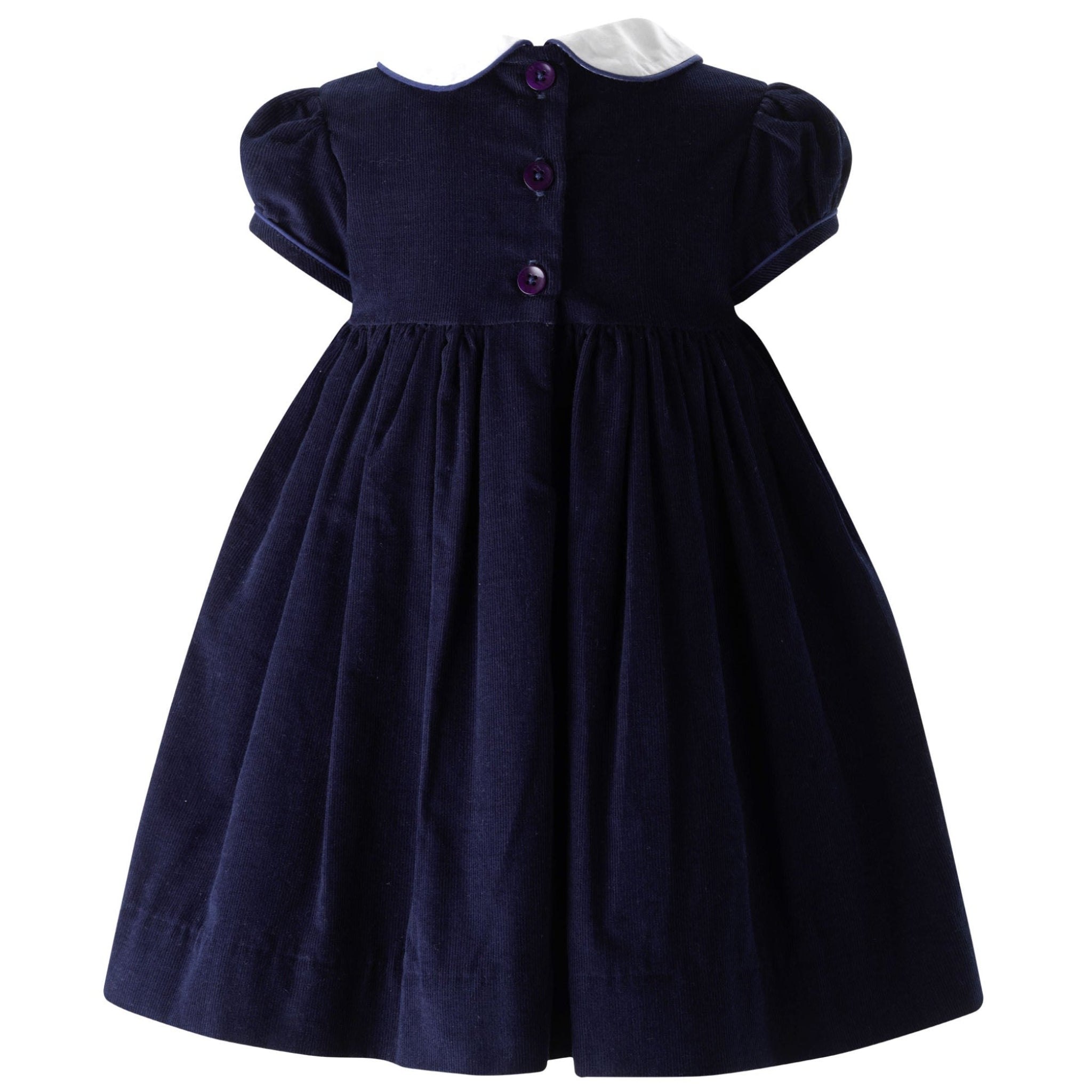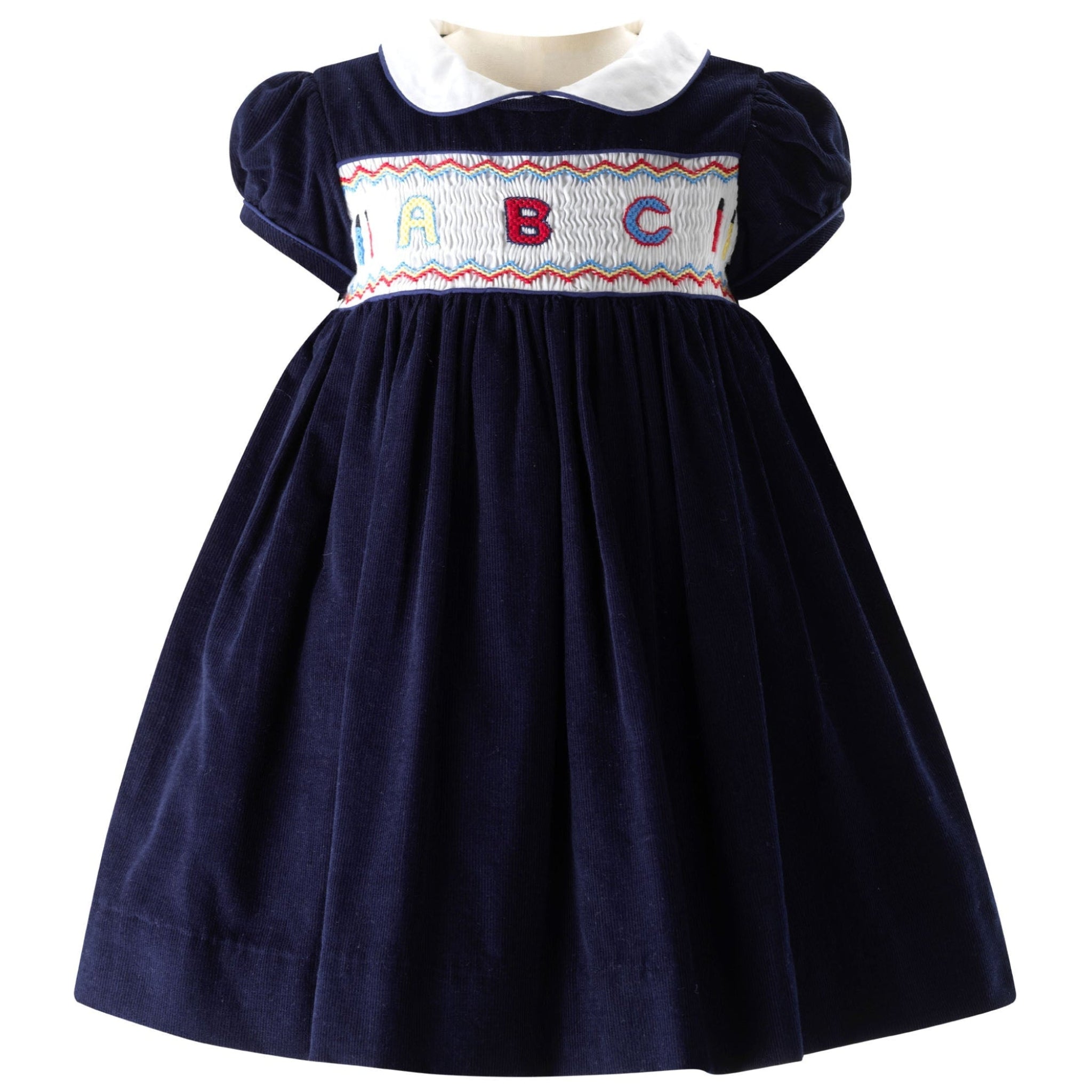The ABC Smocked Dress & Bloomers set features a charming navy cotton dress with a classic ivory Peter Pan collar, puff sleeves, and sweet multicolored ABC embroidery across the smocked bodice, paired with matching bloomers for comfortable wear. Perfect for special occasions or everyday style with timeless appeal.