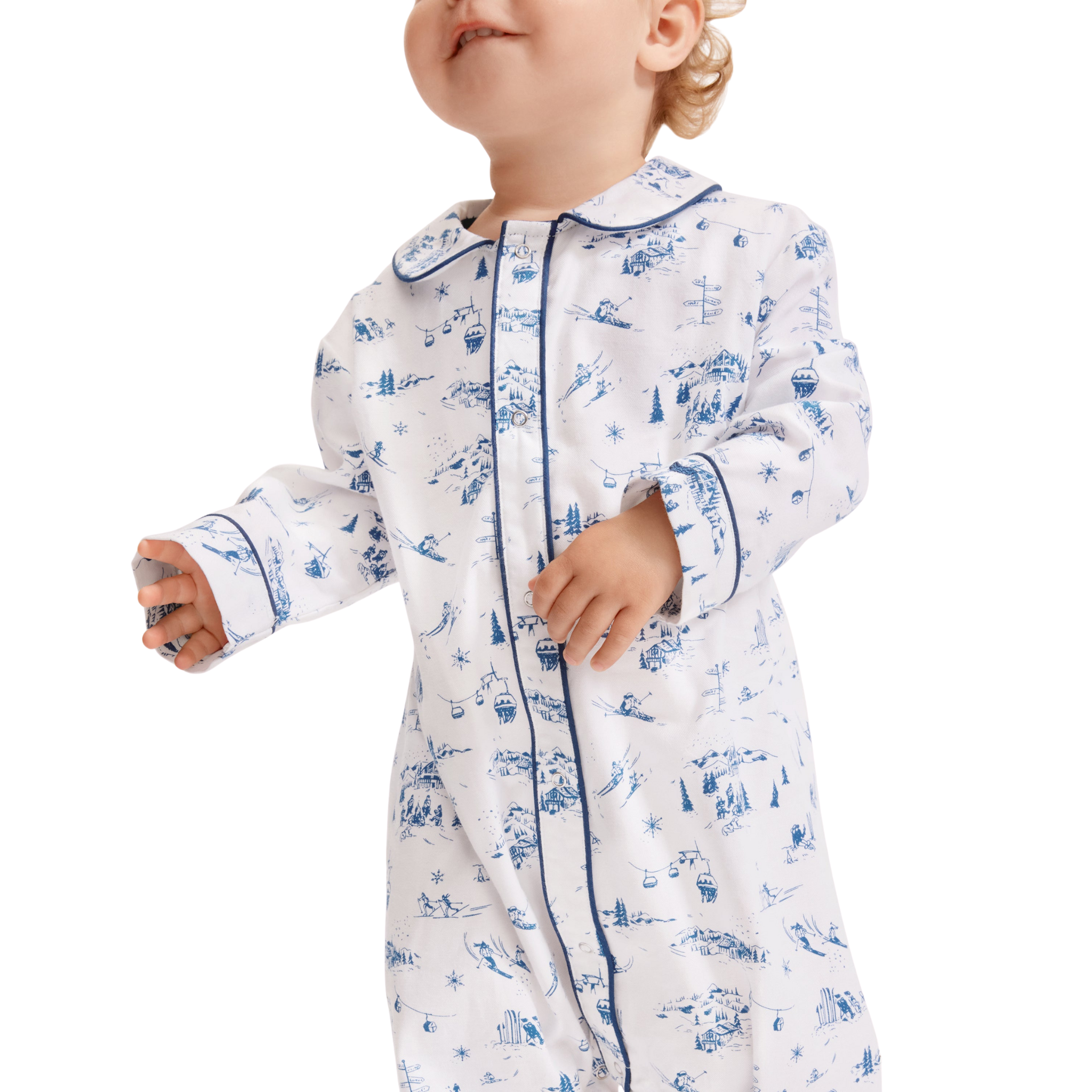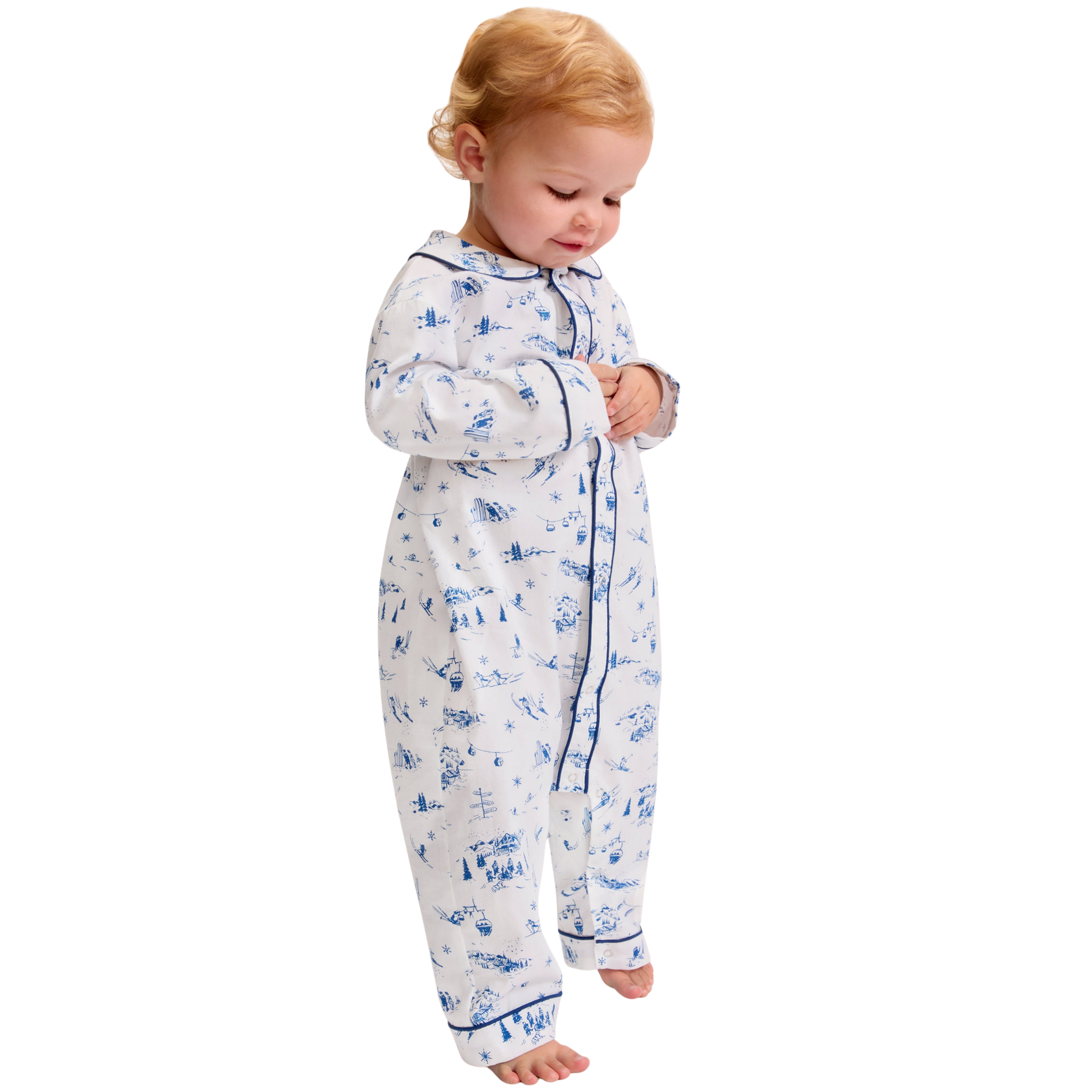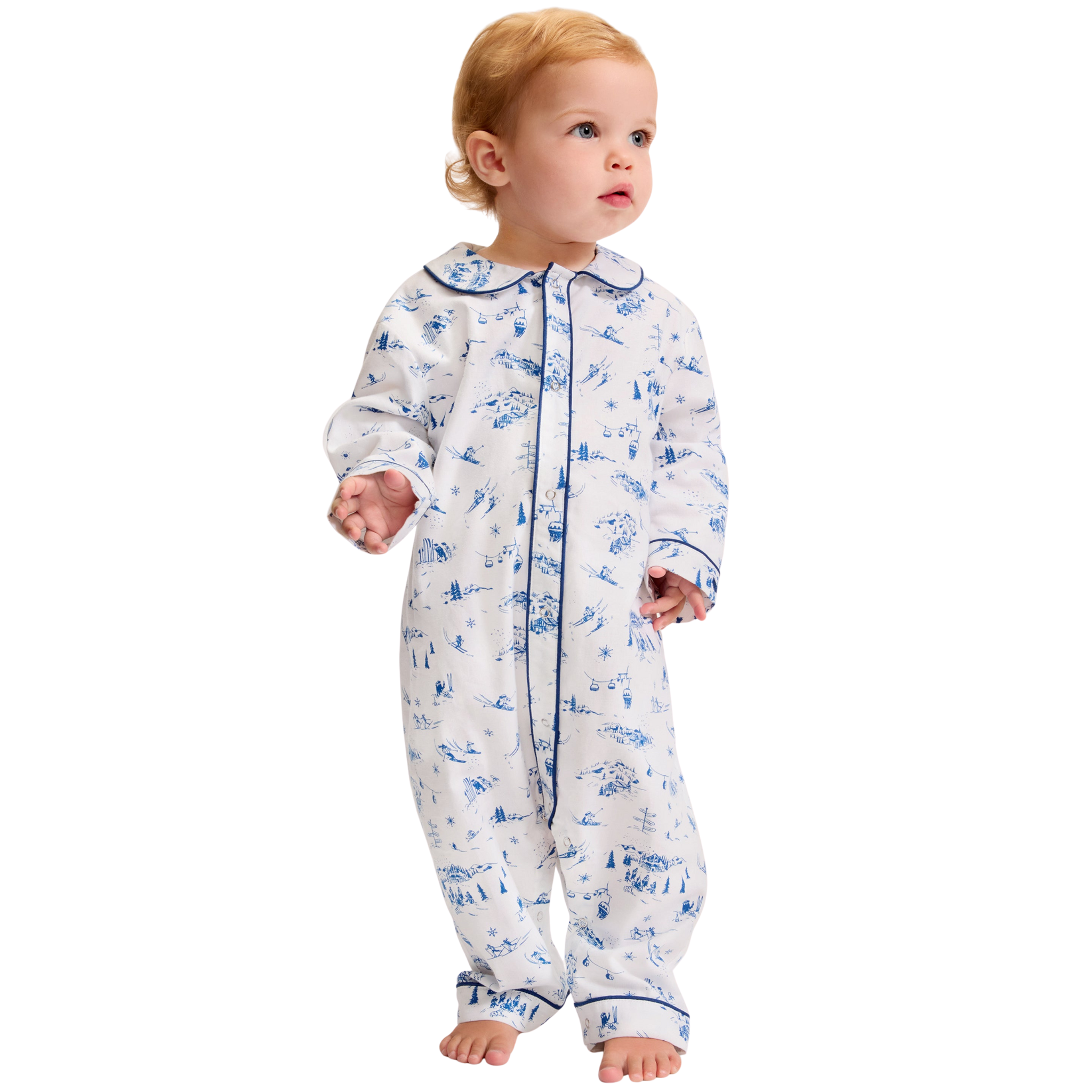 Bring storybook charm to your little one’s wardrobe. Crafted from soft, breathable cotton twill, this classic one-piece features our exclusive Chalet Toile print - an enchanting winter scene inspired by cozy mountain getaways. Designed with both comfort and style in mind, the romper includes thoughtful details like Peter Pan collar and snap button for a polished yet practical fit. Hidden snaps along the legs make dressing and diaper changes a breeze.
