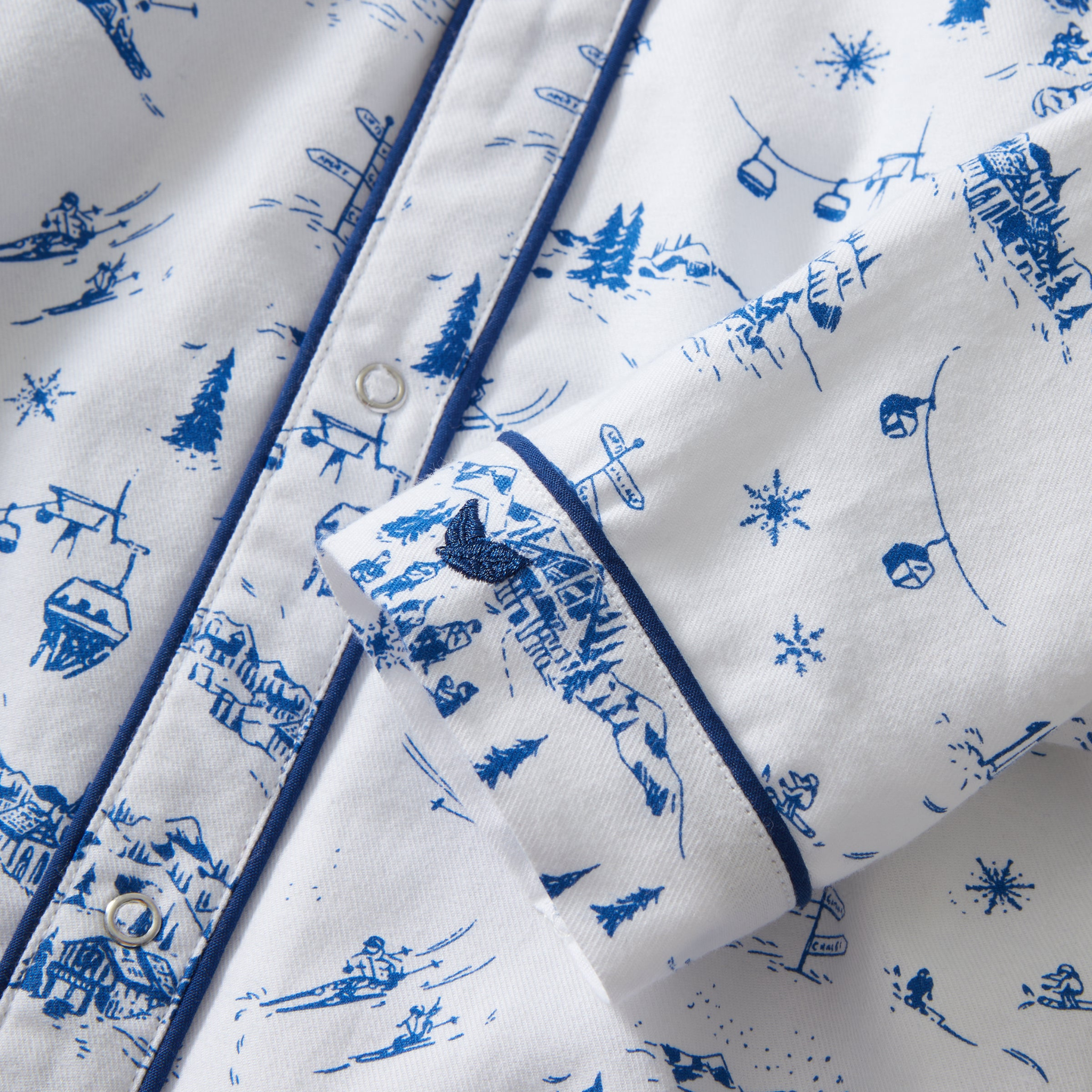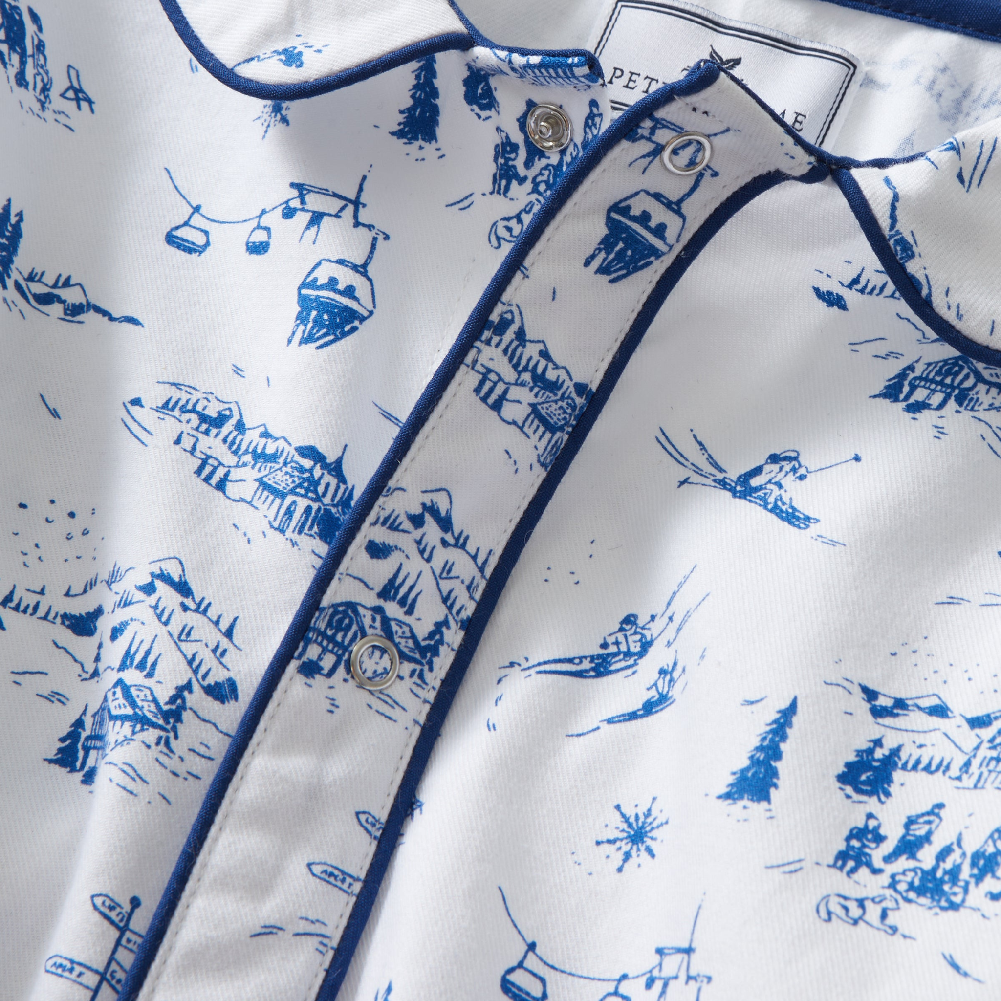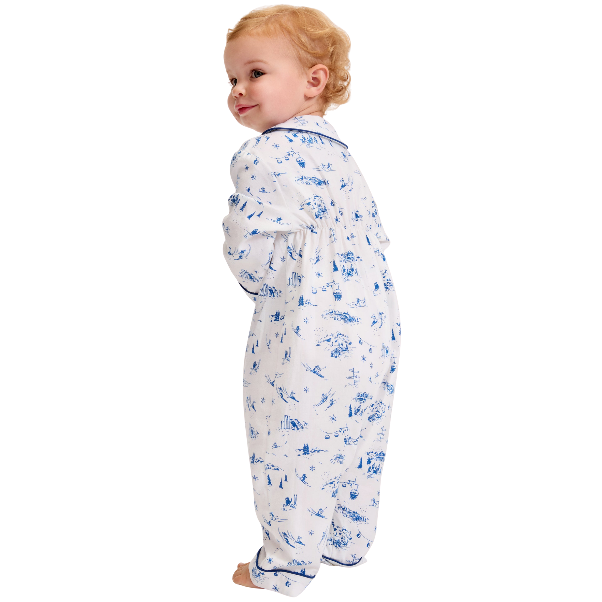Bring storybook charm to your little one’s wardrobe. Crafted from soft, breathable cotton twill, this classic one-piece features our exclusive Chalet Toile print - an enchanting winter scene inspired by cozy mountain getaways. Designed with both comfort and style in mind, the romper includes thoughtful details like Peter Pan collar and snap button for a polished yet practical fit. Hidden snaps along the legs make dressing and diaper changes a breeze.