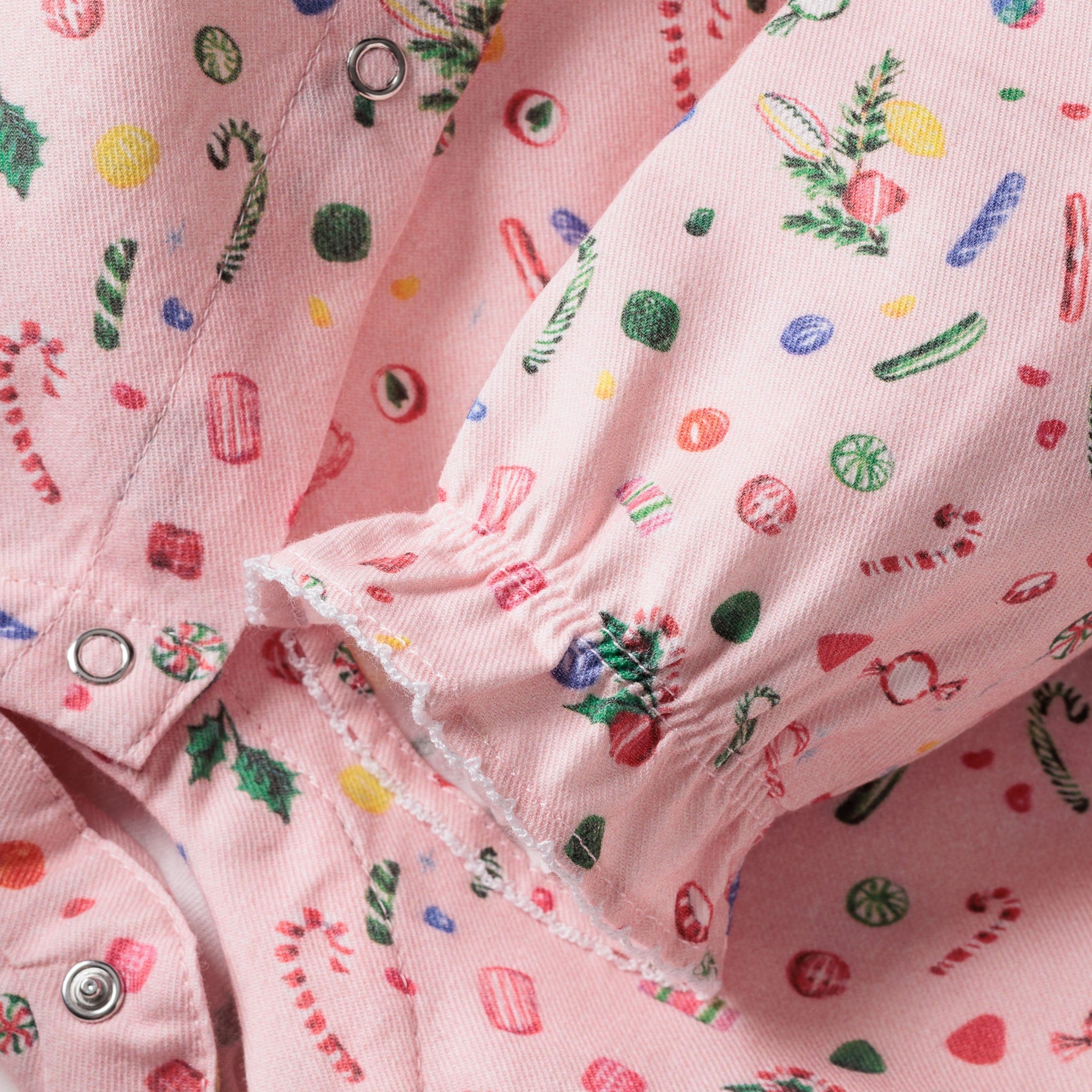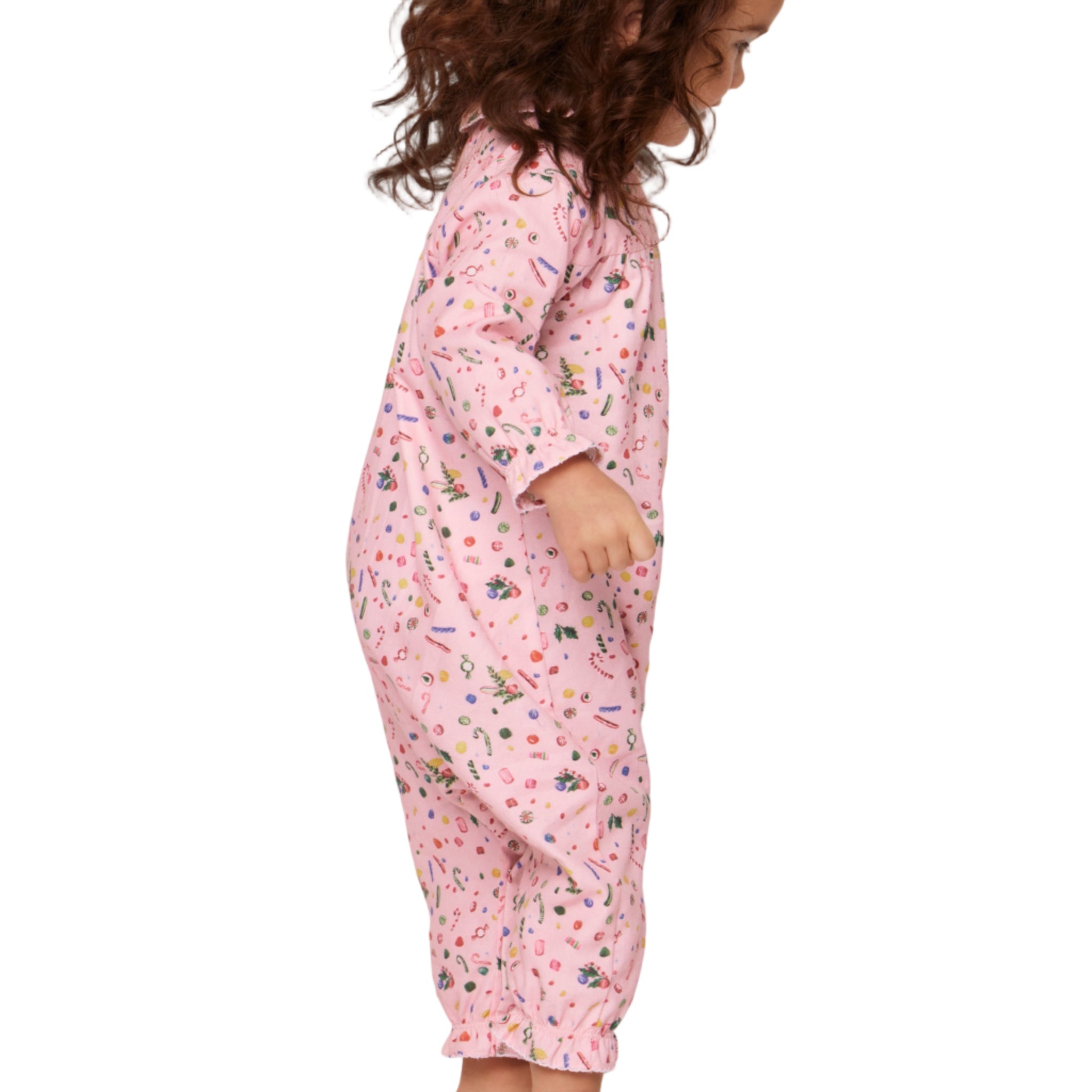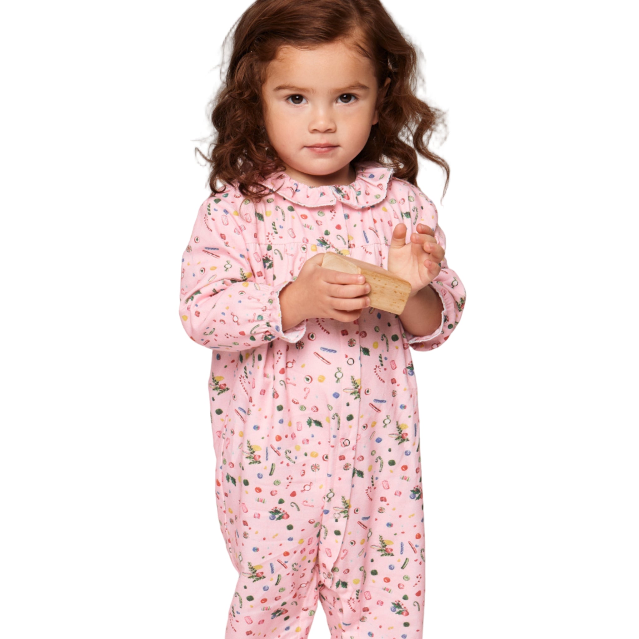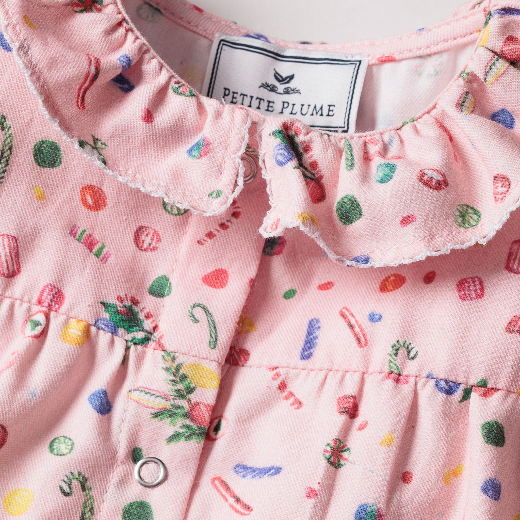 Nostalgic holiday sweets cover this twill romper, starting the festive season with a sugar rush. Feel transported to holidays past with illustrated ribbon candies, pinwheels, and peppermints straight out of a vintage candy dish. Petite Plume debuted the first-ever chemical-free, flame-retardant fabric for children's sleepwear. Fine yarn-dyed cotton is blended with a touch of inherently flame-retardant fiber to pass strict CPSC safety laws without relying on harmful additives. The moisture-wicking twill weave is crisp, comforting, and cozy. Snuggly soft and becomes more buttery with every wash.