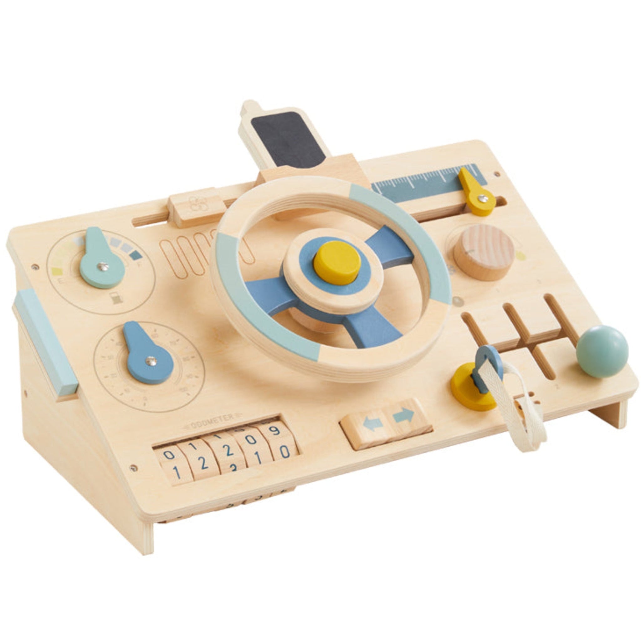 - Builds fine motor skills & color recognition with the interactive steering wheel, horn, odometer, speedometer, gas gauge, turn signal clicker, gear shift, peek-a-boo mirror & phone!