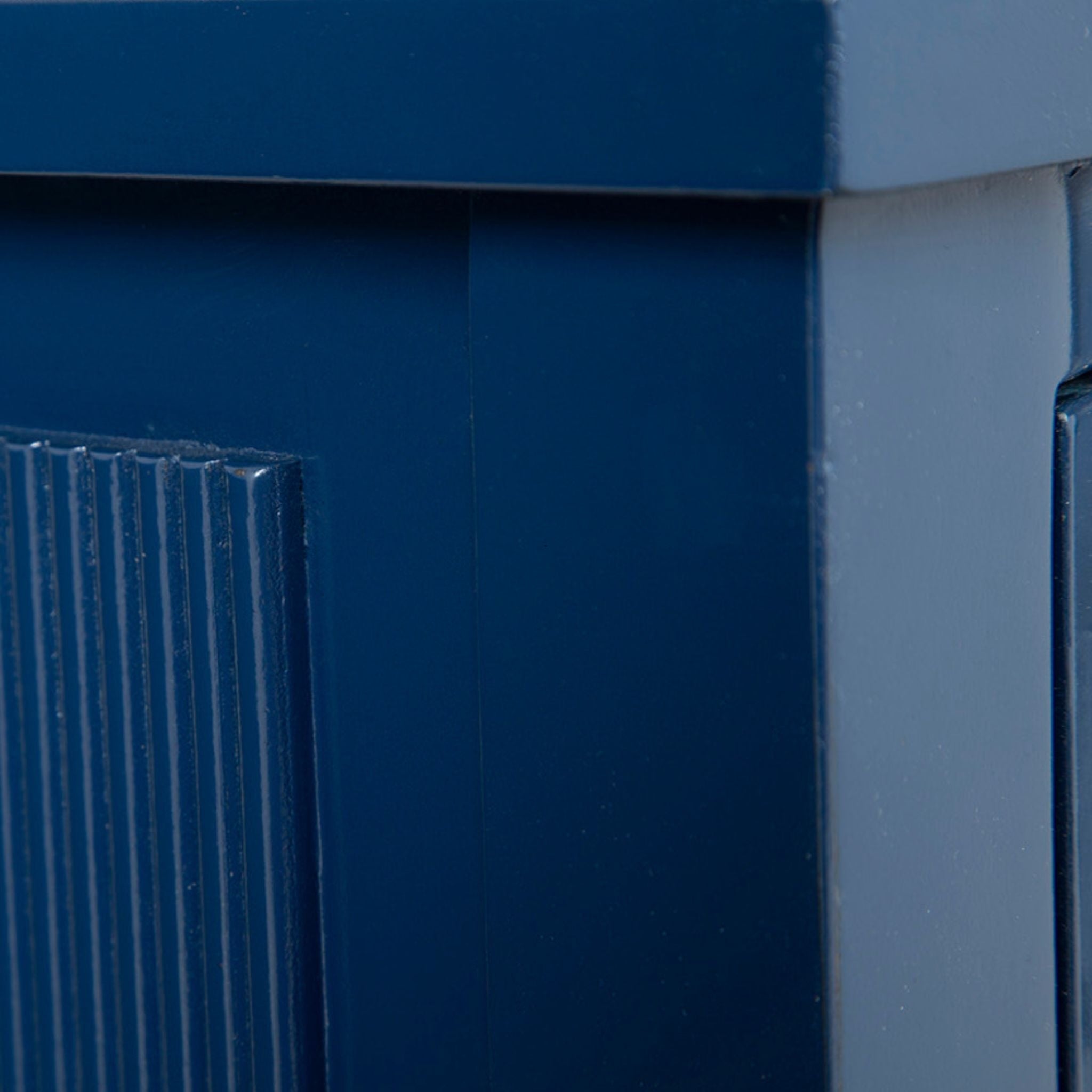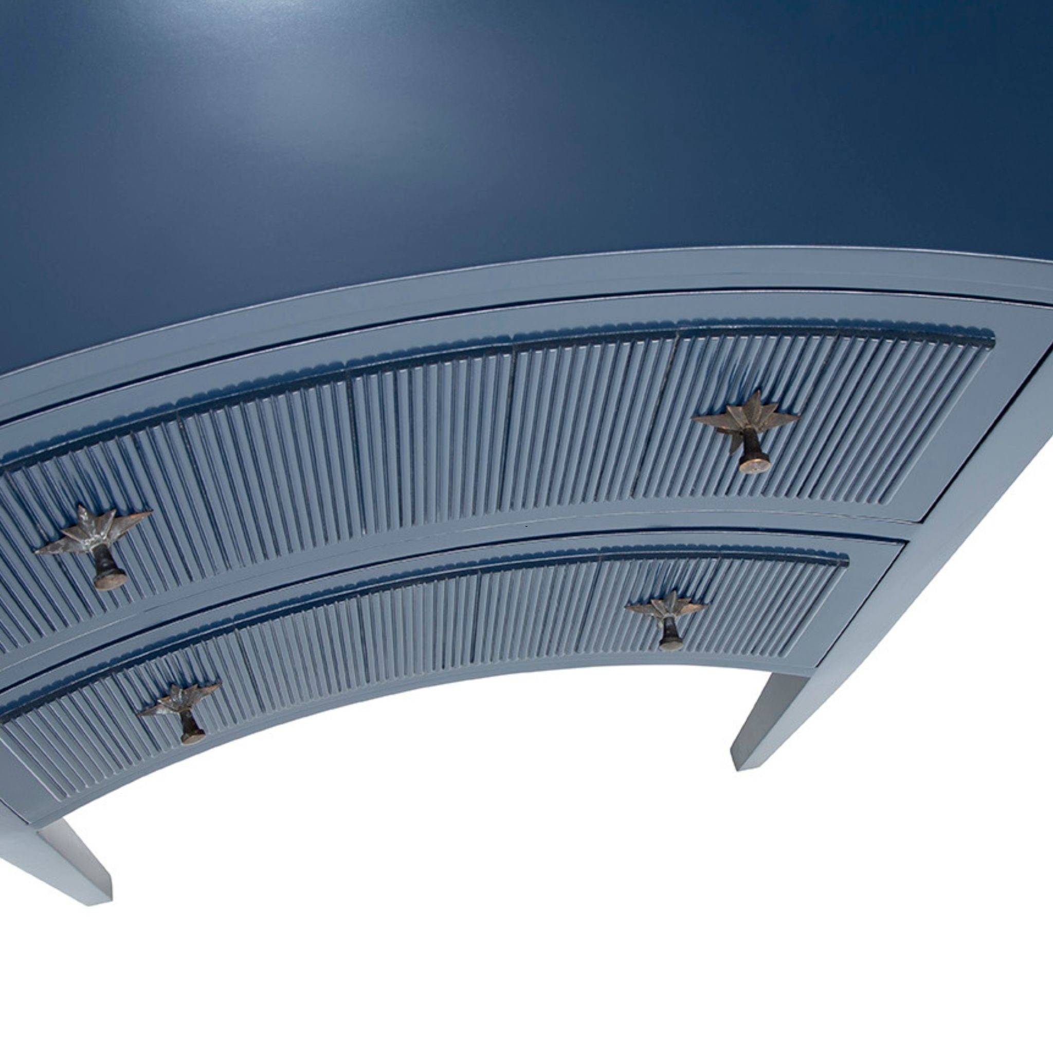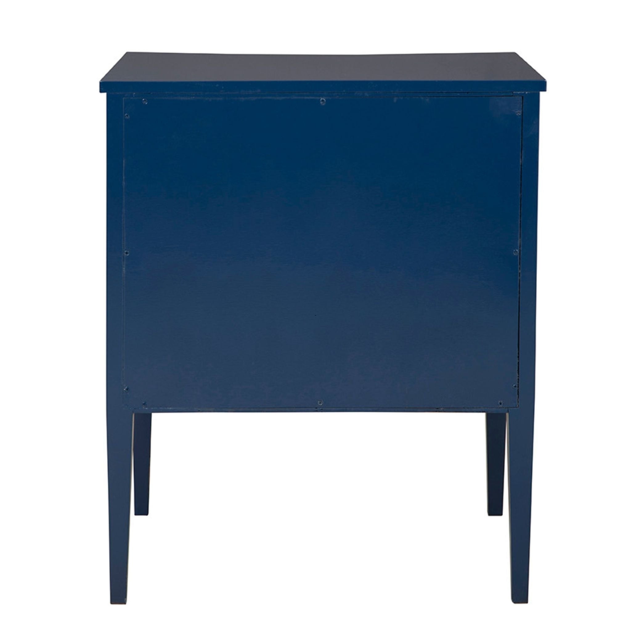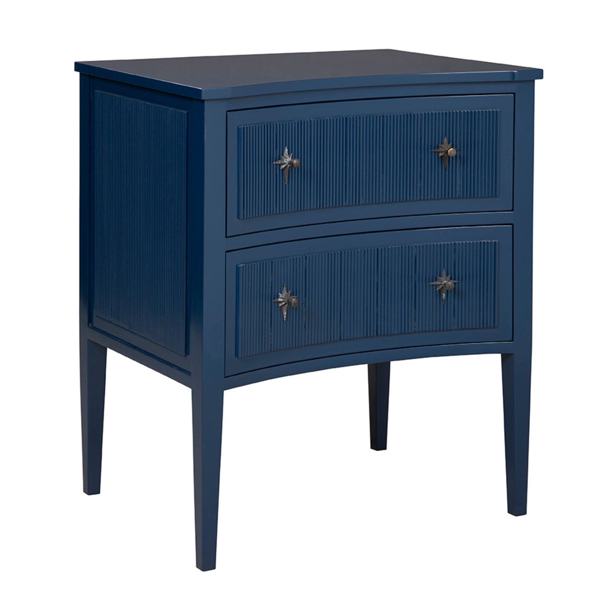 The Blue Constellation Chest features a rich blue finish, reeded detailing, and antique brass pulls for a refined yet eye-catching look. With two spacious drawers and a slim, tapered-leg profile, it works beautifully as a bedside table or a stylish accent chest.