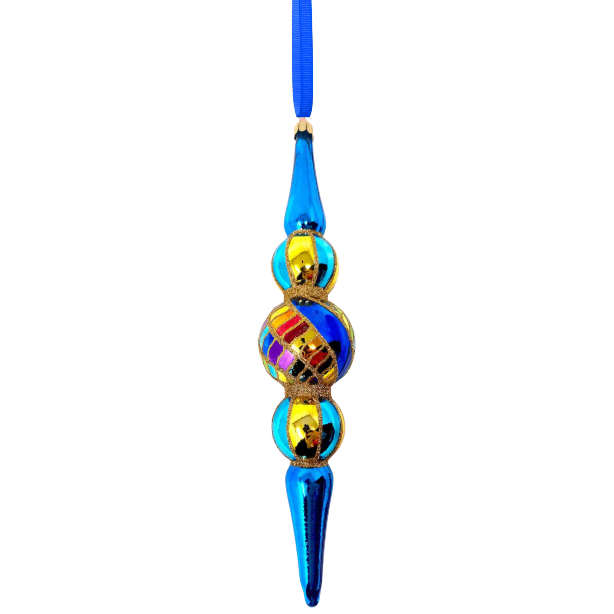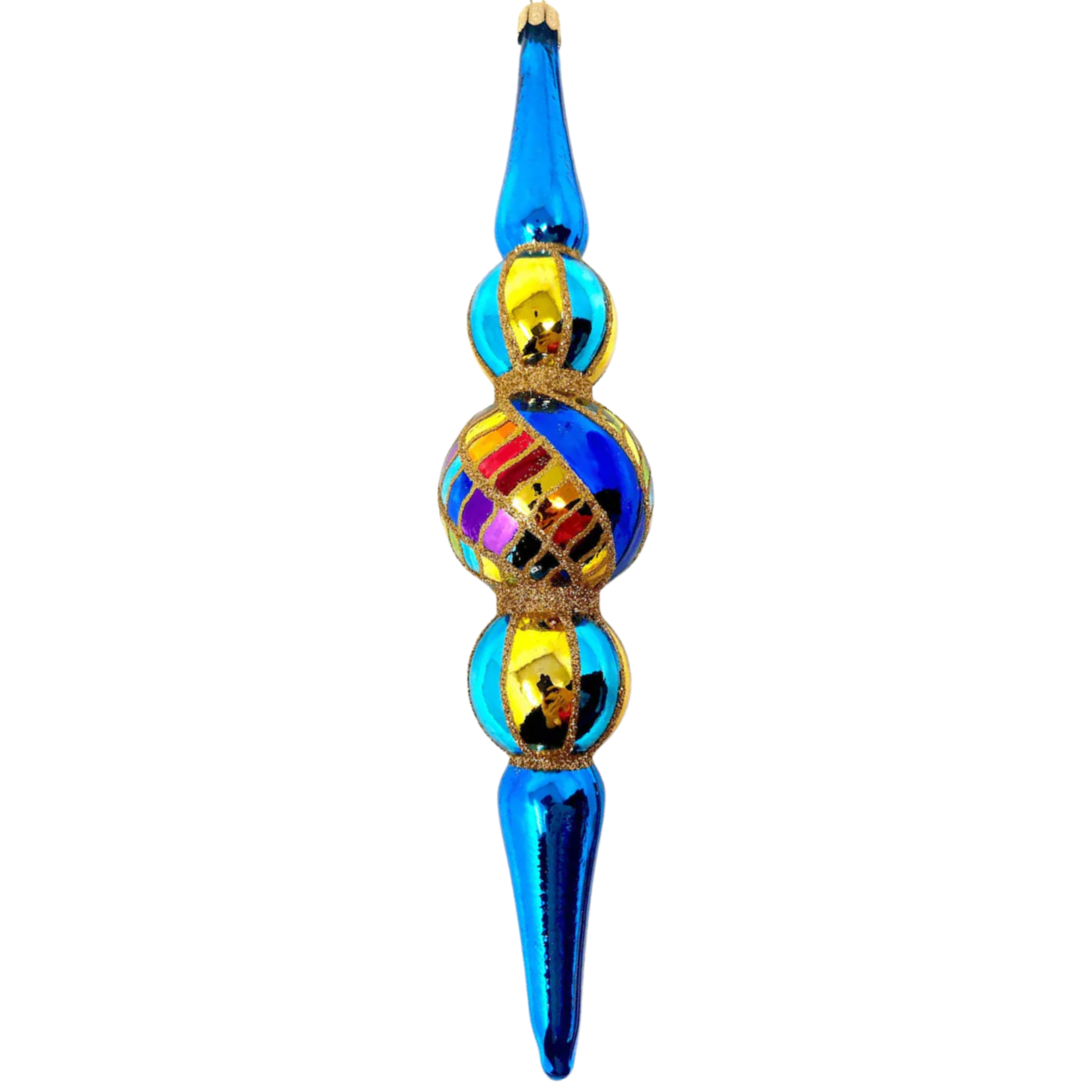 Crafted from hand-blown glass, this striking ornament features a graceful spiraled icicle shape in rich cobalt and icy blue tones that shimmer with every flicker of light. Its dynamic, spinning design gives the illusion of movement, bringing a modern touch to a classic winter form. Perfect for adding depth and sparkle to your tree, this ornament blends cool sophistication with timeless holiday magic.