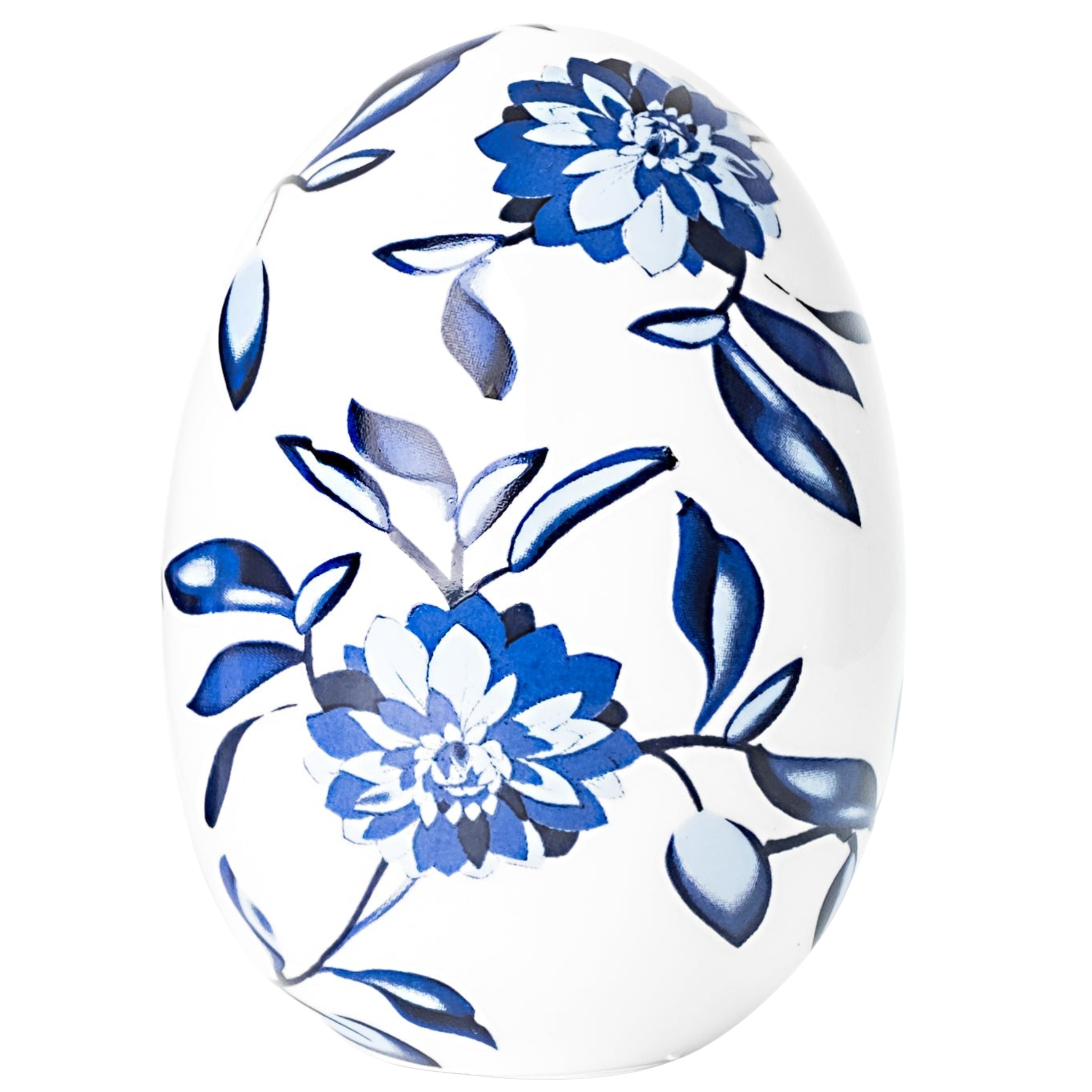 A blue and white porcelain egg adorned with a delicate floral motif. Intricate blossoms and flowing vines are finely detailed against a crisp white background, creating a timeless piece inspired by traditional ceramic artistry. Perfect as a decorative accent or collectible.
