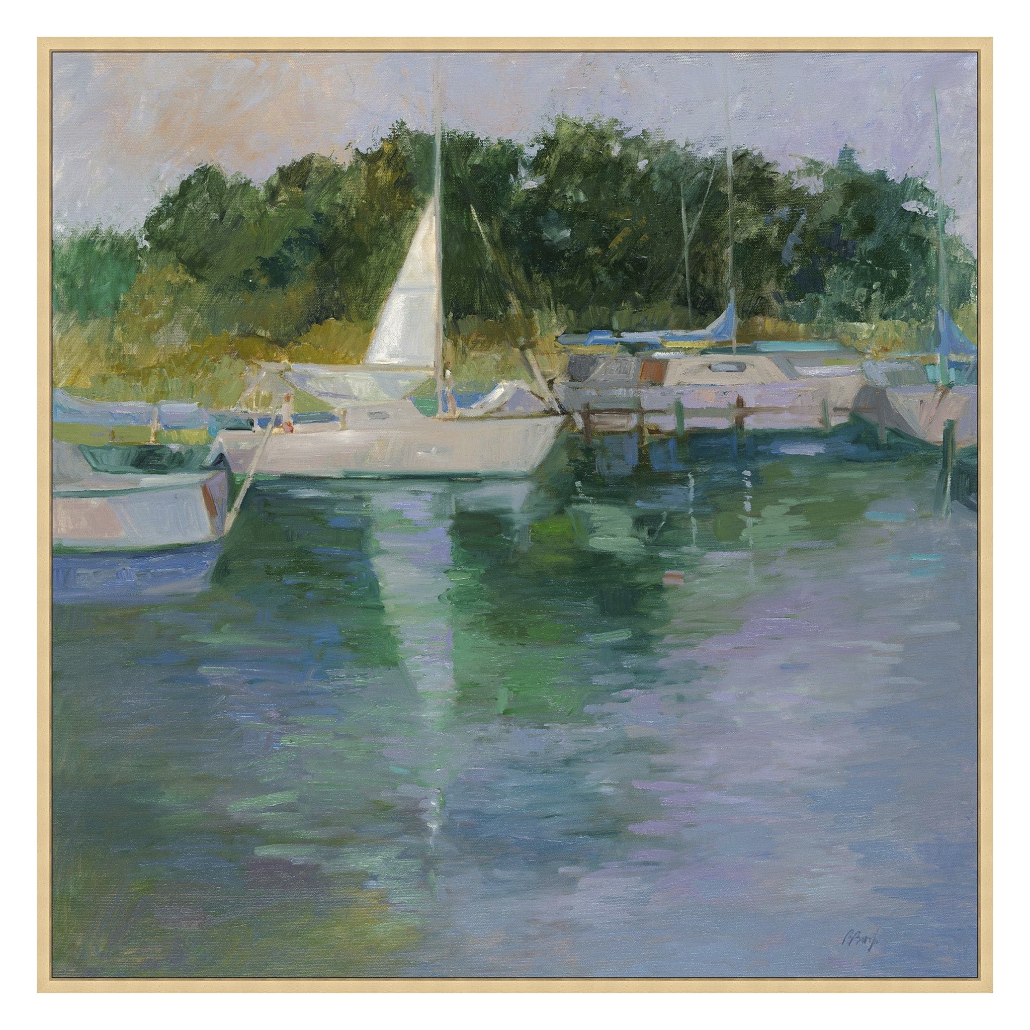 Boats is a serene wall art print that captures the quiet beauty of vessels at rest with gentle brushwork and soothing coastal hues.