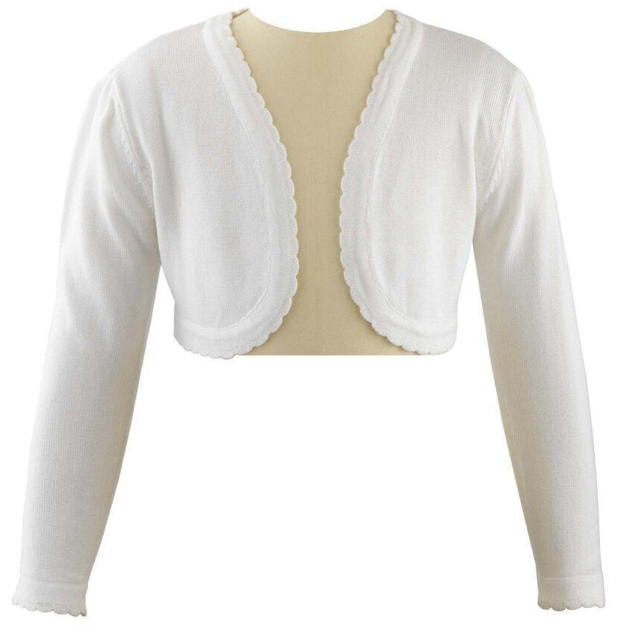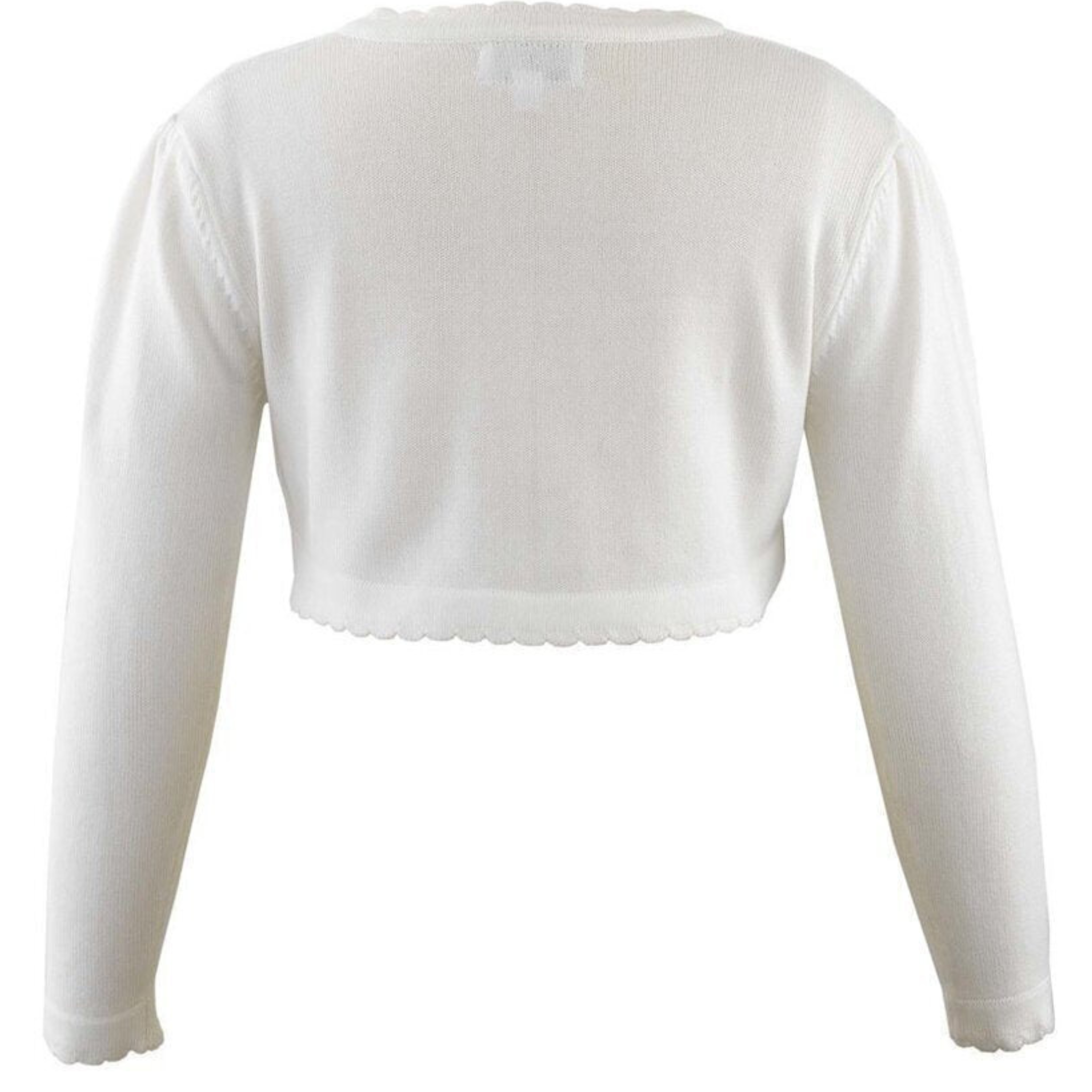 Add the perfect finishing touch to any special outfit. Elegant and timeless, this elegant layering piece is designed with a classic cropped silhouette that pairs beautifully with dresses and formalwear. Made from soft, comfortable fabric, it features long sleeves and a gently curved front for a polished look. Ideal for weddings, holidays, or cool evenings, this ivory bolero offers just the right amount of warmth while keeping your little one stylish and picture-ready.
