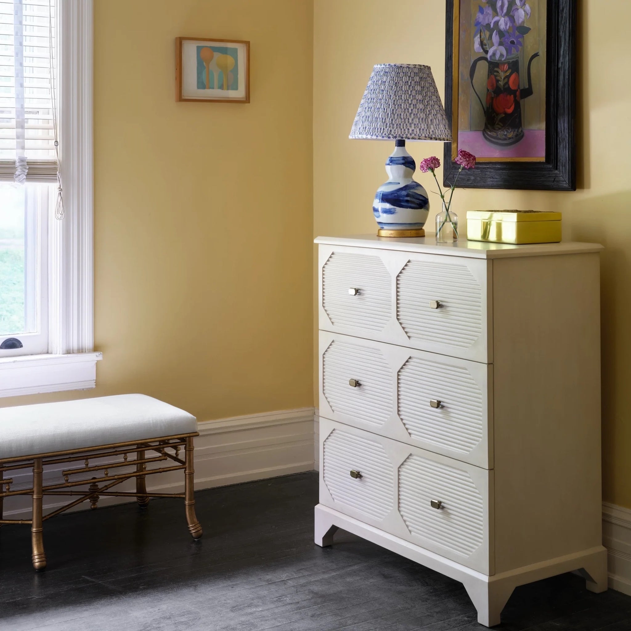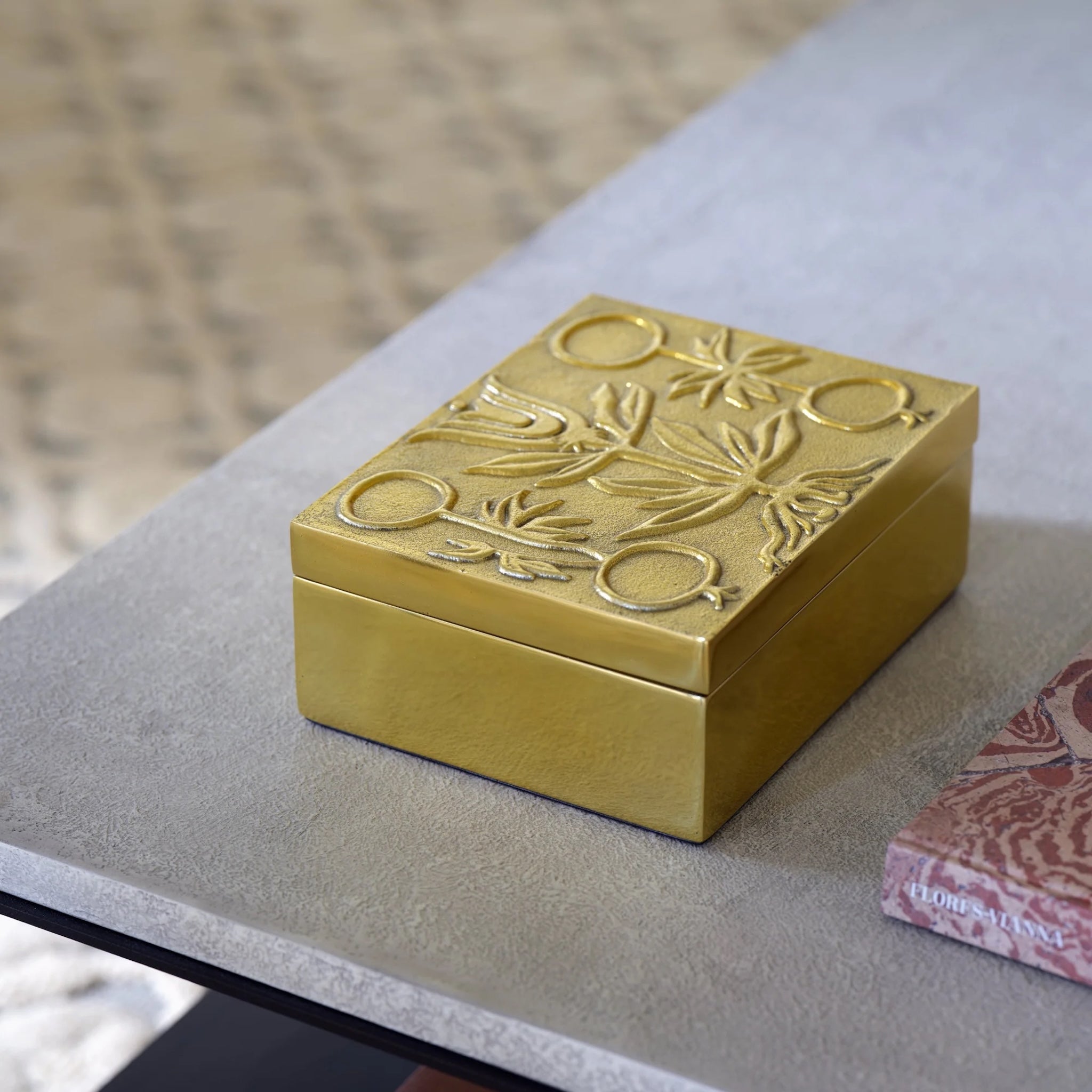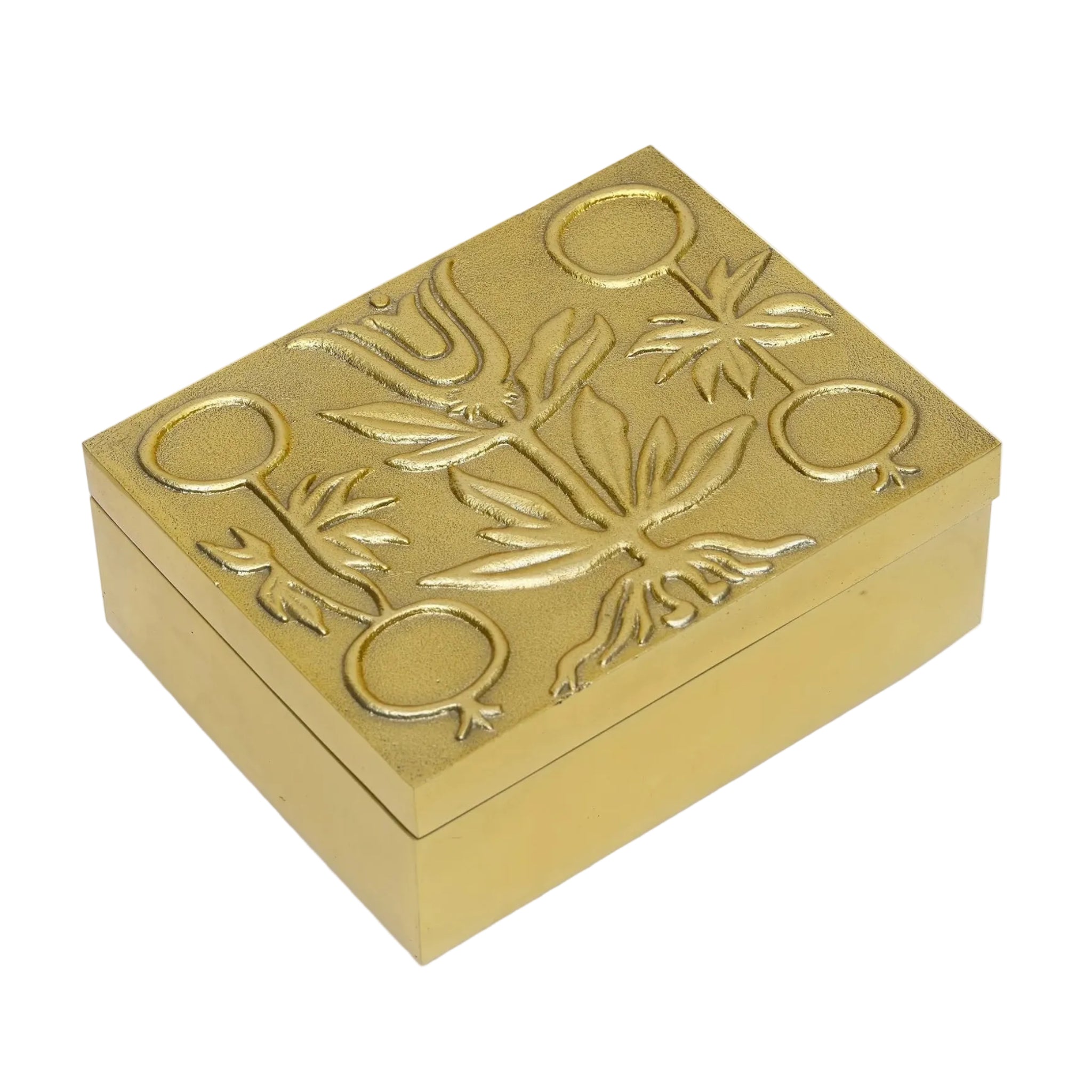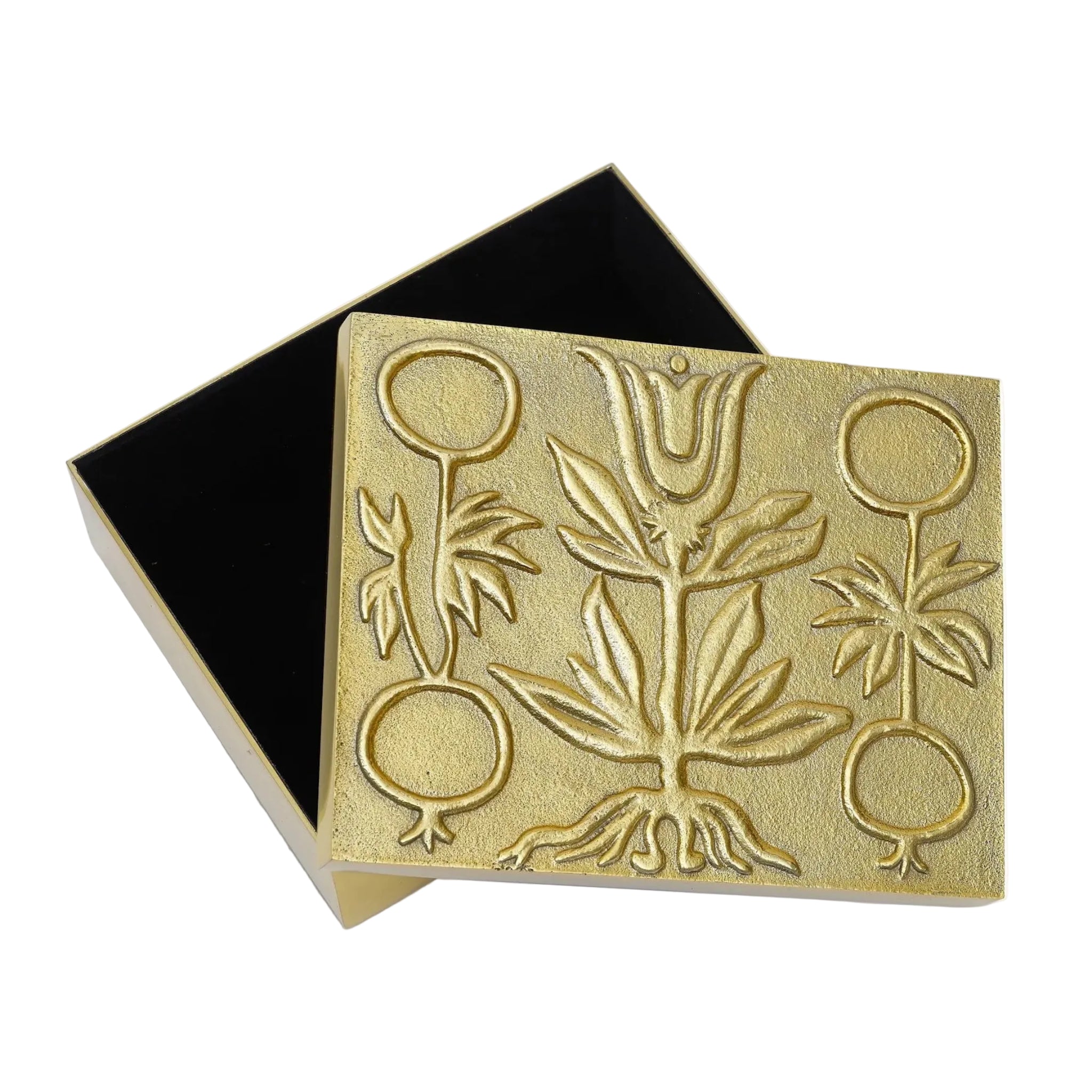 Crafted from cast aluminum with a polished brass finish, this elegant box features a removable lid with a raised tulip motif. A plush black velvet lining protects your mementos or daily essentials, making it as functional as it is decorative.