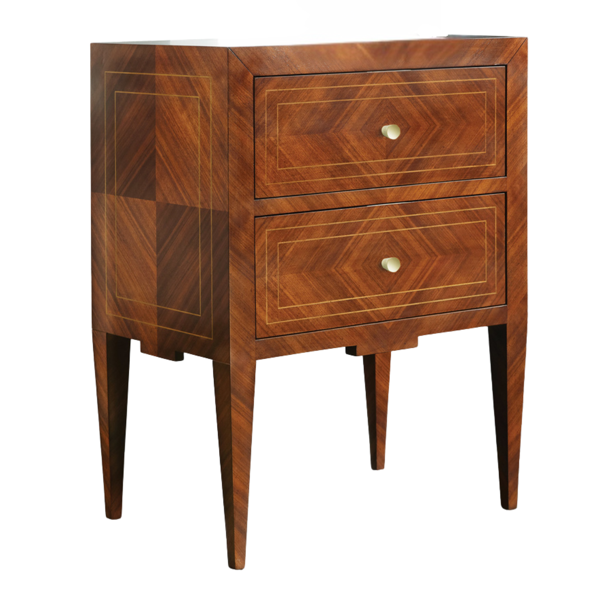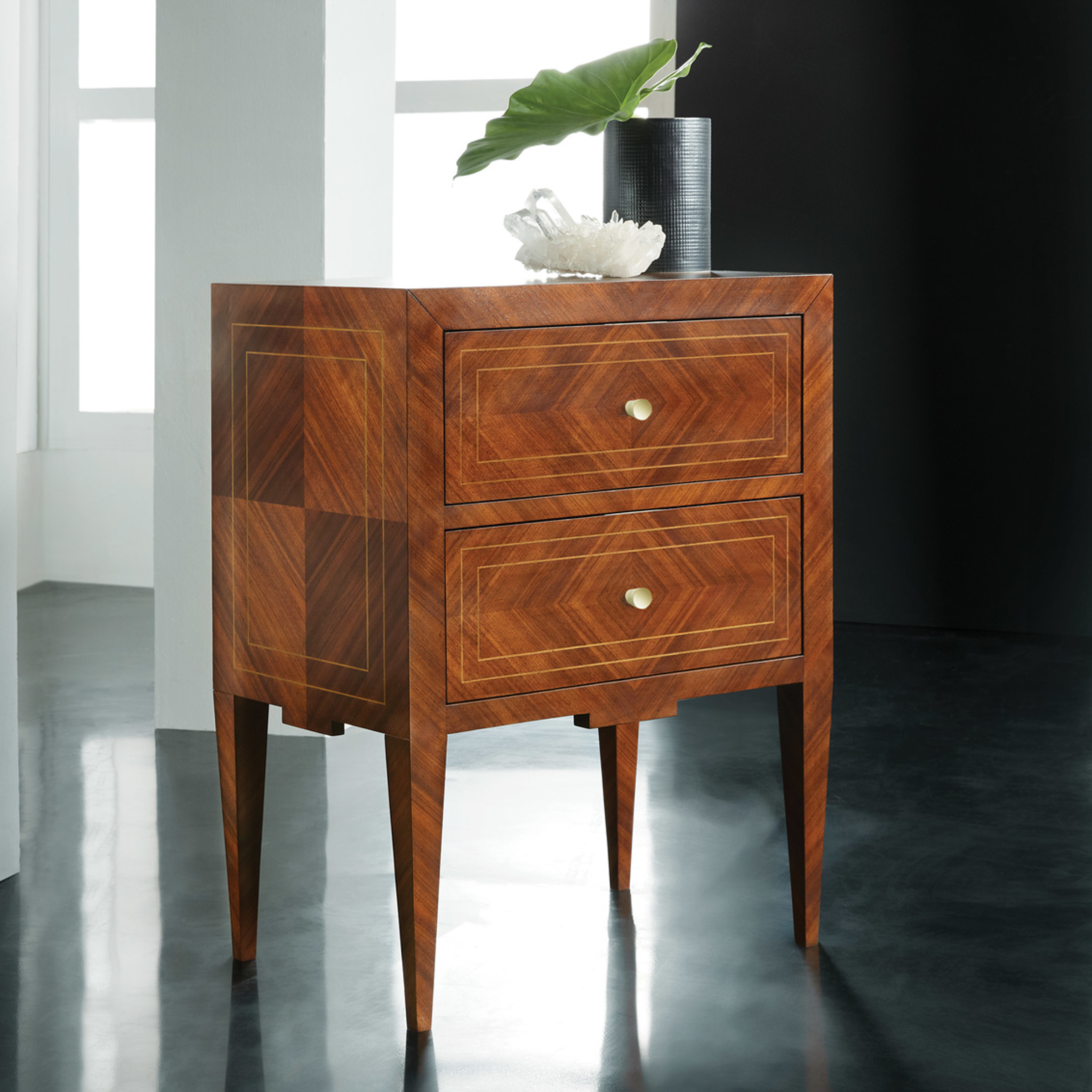 The Breganza Bedside Chest features two drawers and is crafted from Walnut Veneer with Boxwood Inlay.