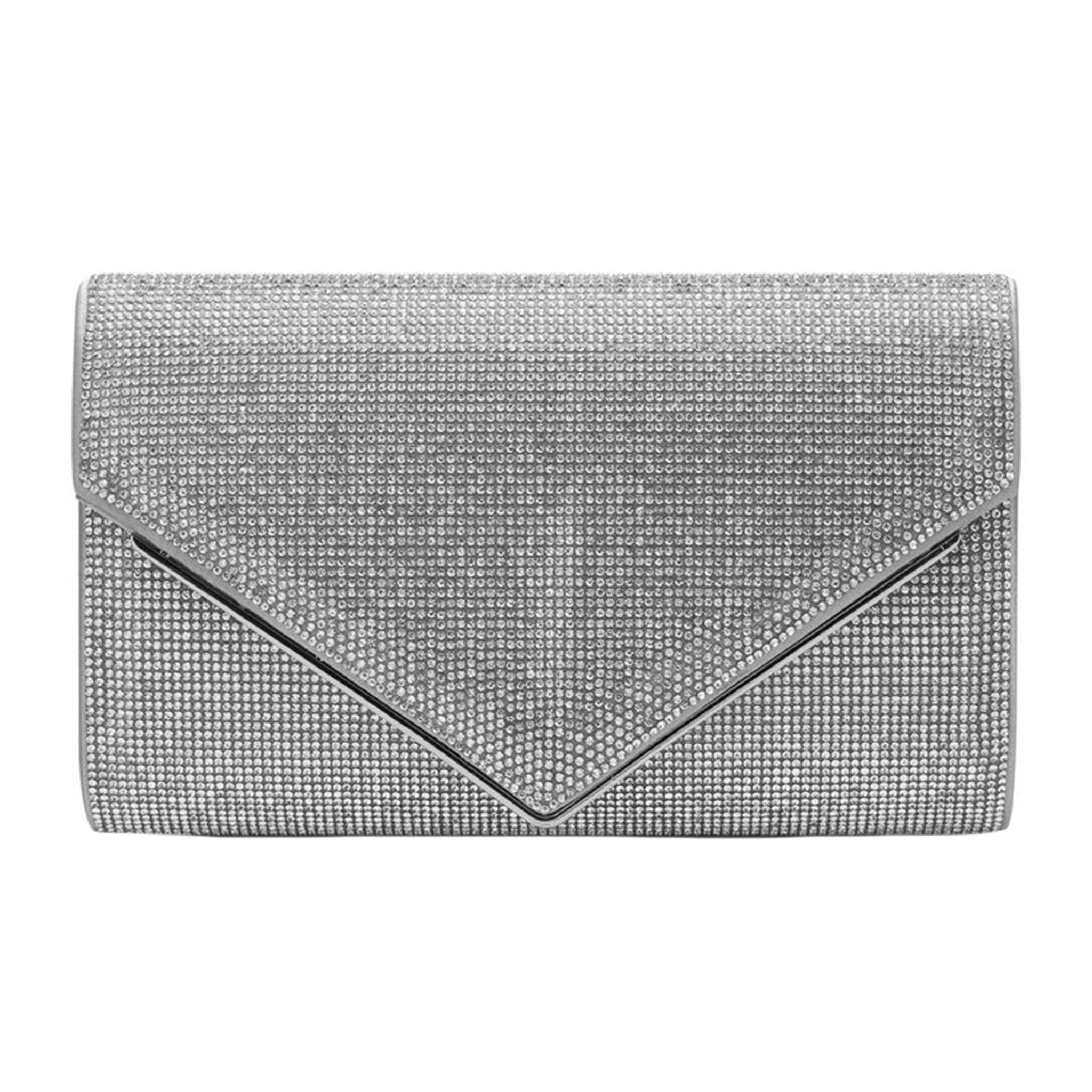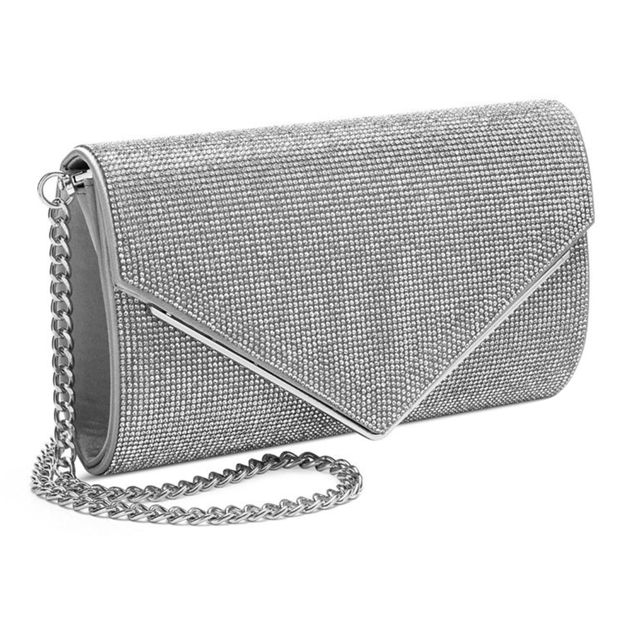 The Candy envelope clutch is embellished with shimmering crystal rhinestones on light grey satin with discreet flap hardware. It has a fully lined interior with a slip pocket and removable shoulder chain strap.