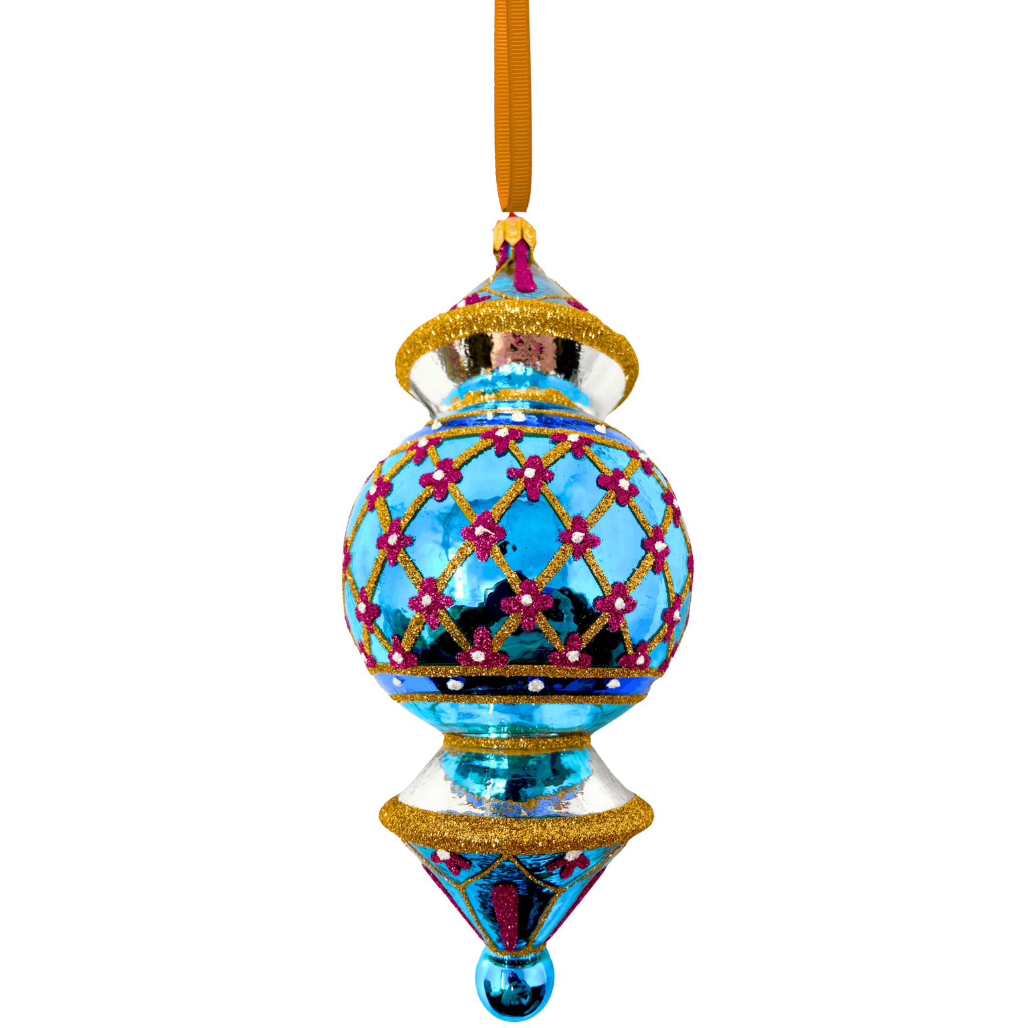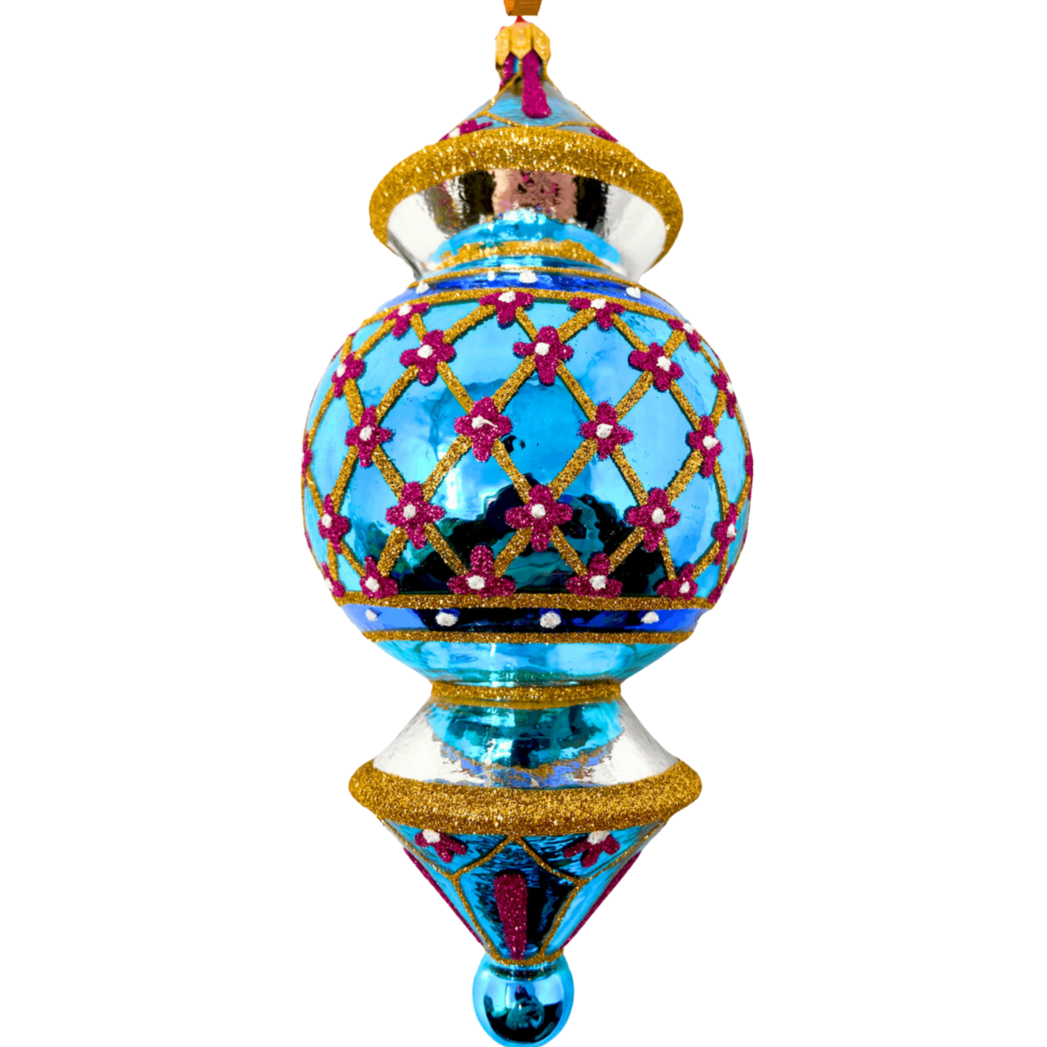Add vintage-inspired charm to your tree with this Reflector Glass Christmas Ornament, featuring a luminous turquoise base adorned with delicate pink florals and shimmering golden details.