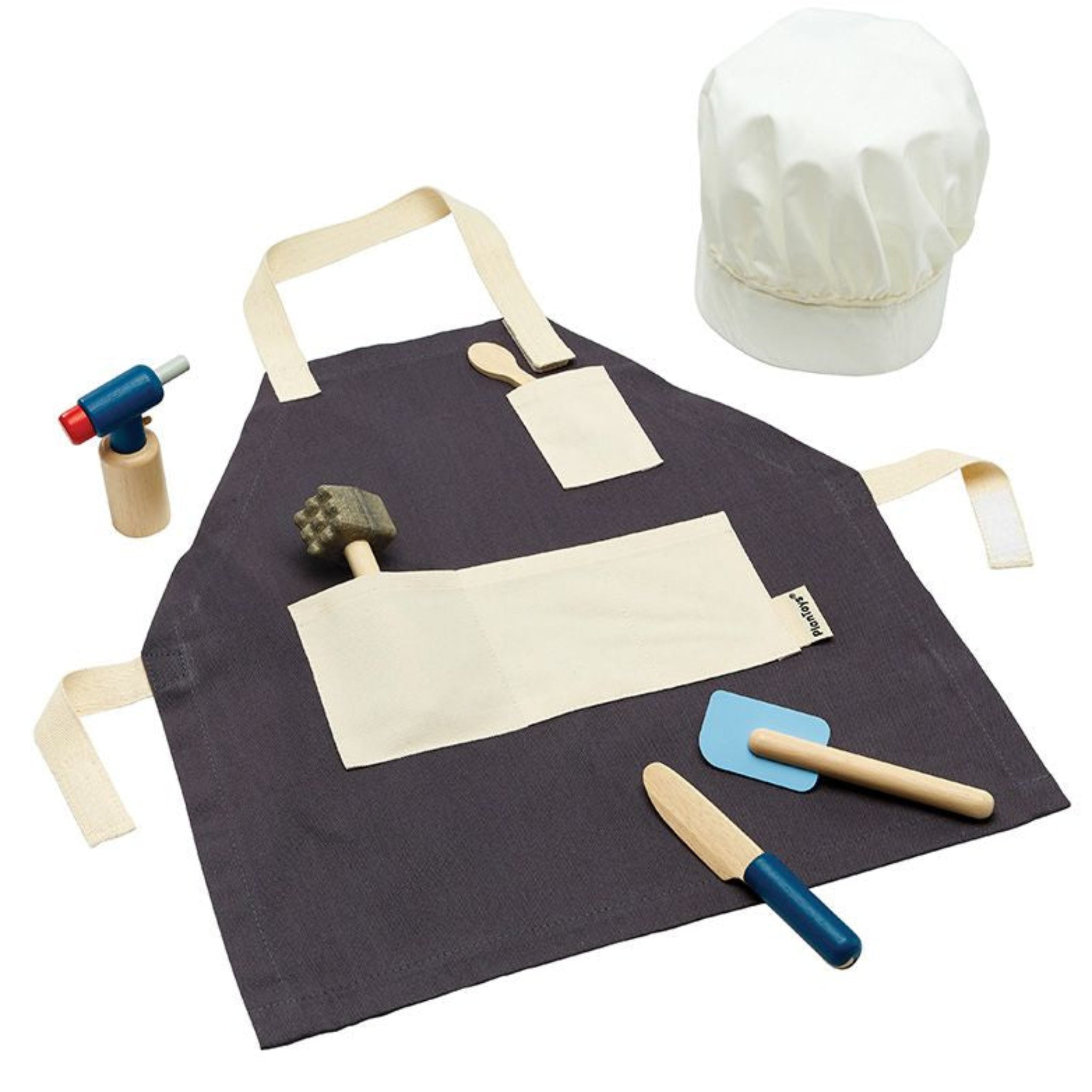 - The set includes 1 adjustable apron, 1 adjustable chef hat, 1 blow torch with a functioning knob, 1 spatula, 1 knife, 1 tasting spoon, and 1 meat tenderizer