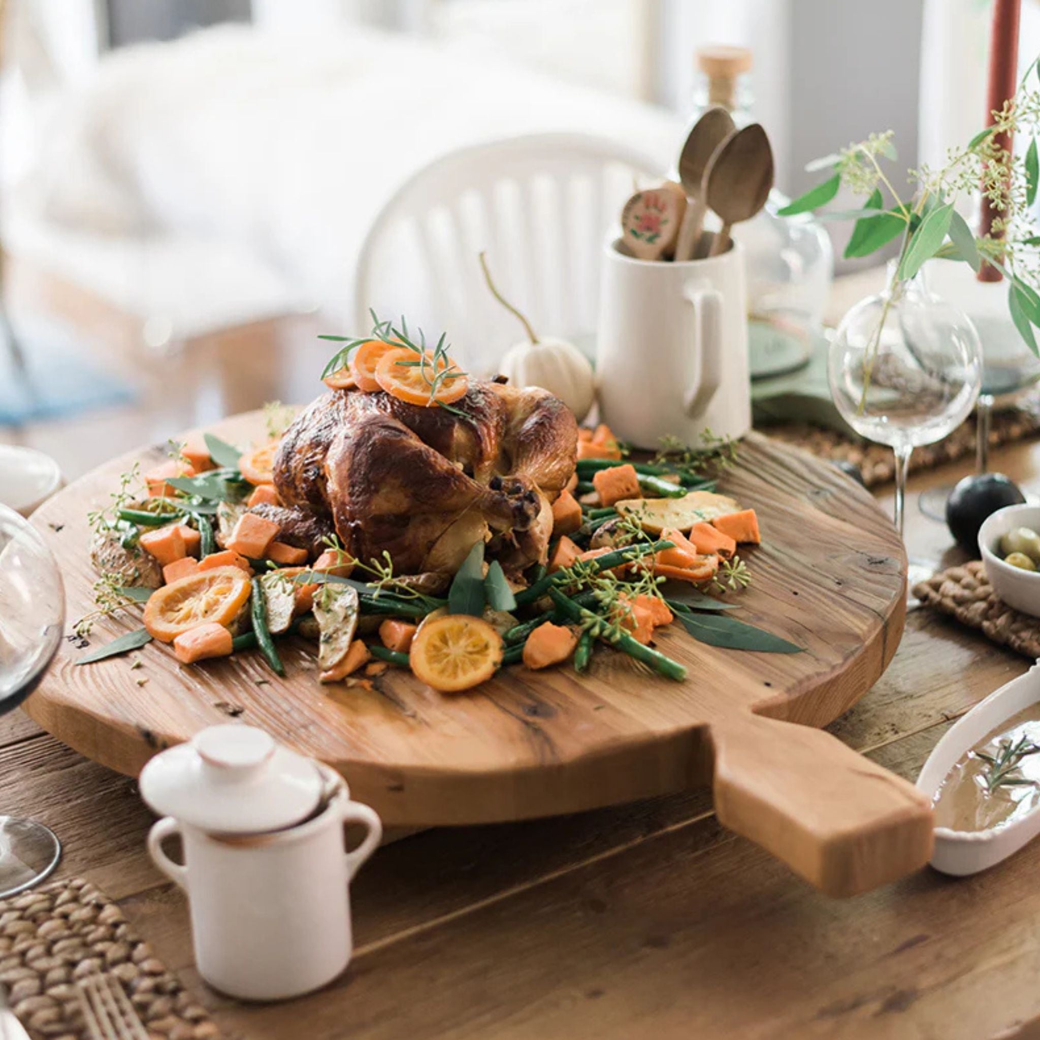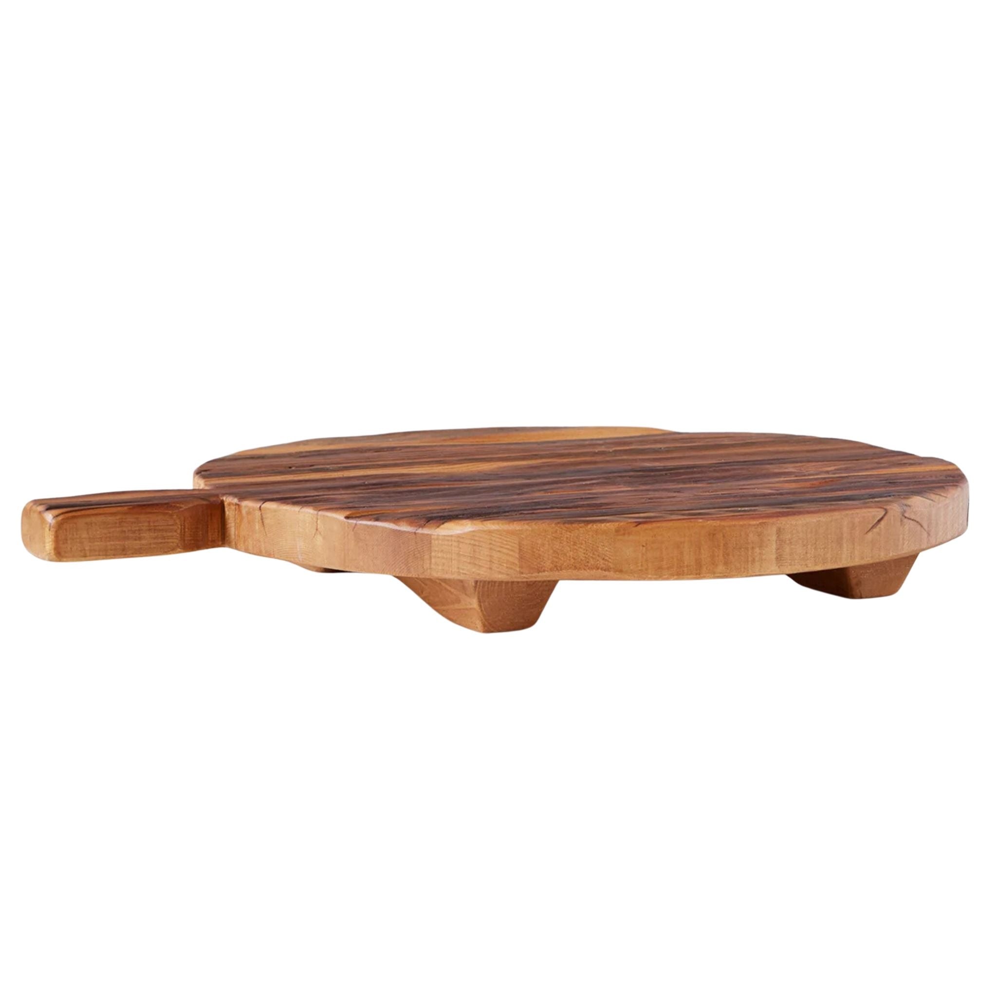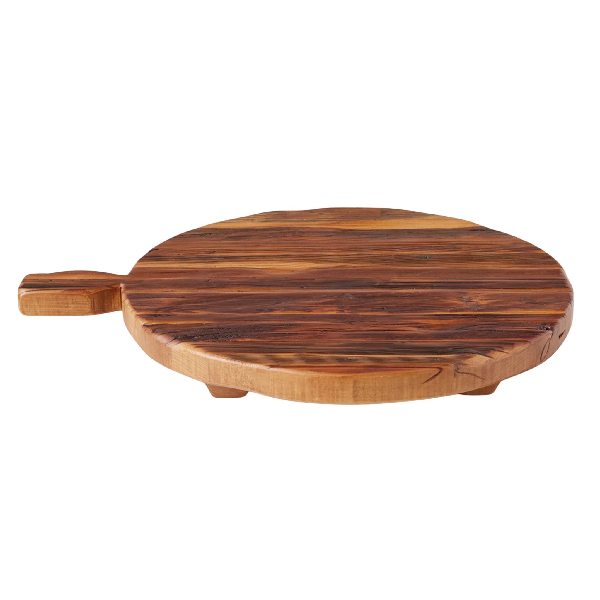 Elevate everyday entertaining with the Classic Oversized Round Footed Board, a versatile statement piece handcrafted from reclaimed wood by European artisans. Designed as a larger counterpart to our popular trivets, this board features a sturdy handle and raised feet, giving it both function and style. Its plant-based, food-safe white hard wax finish highlights the natural character of the wood, with unique crevices, splits, and grooves that celebrate its one-of-a-kind craftsmanship.