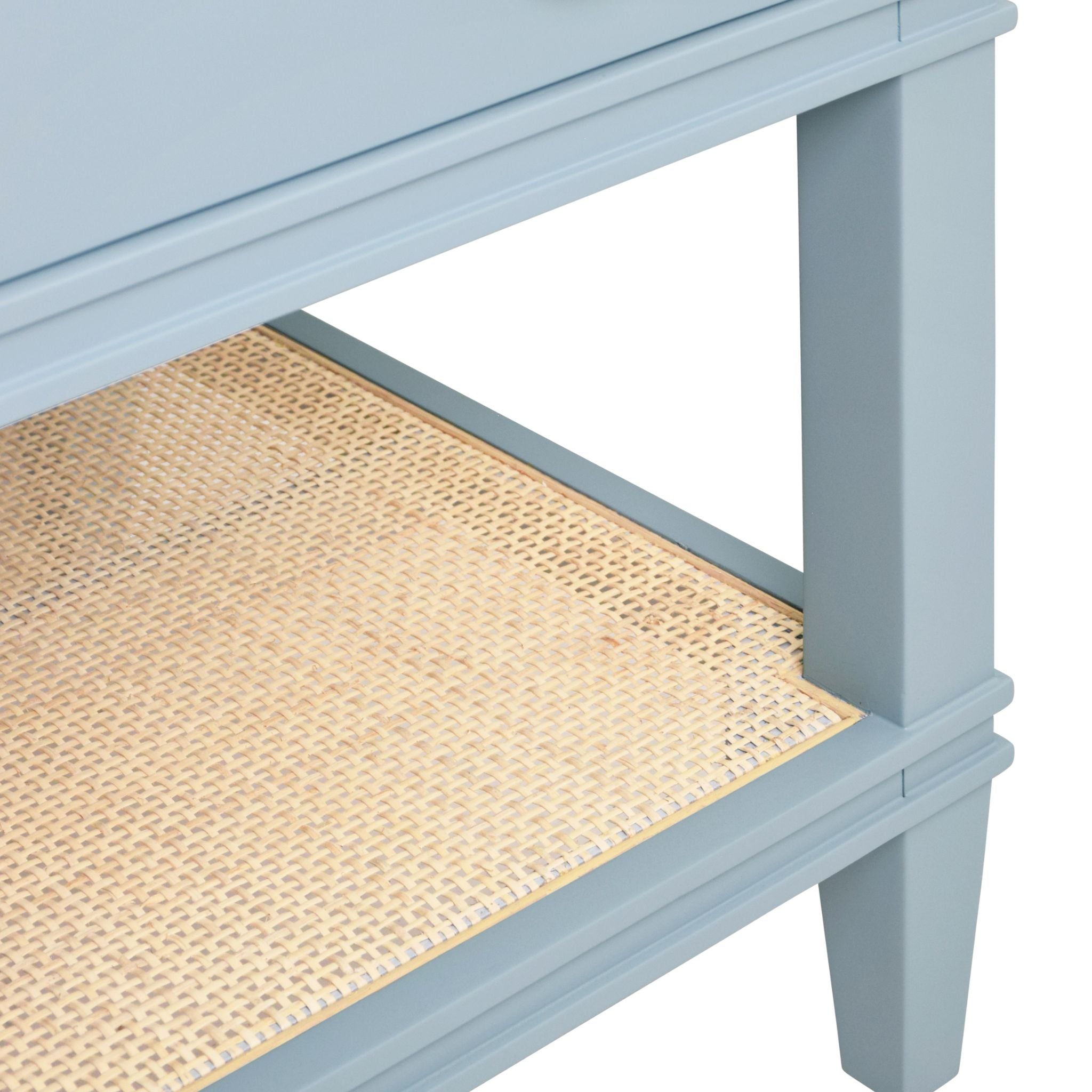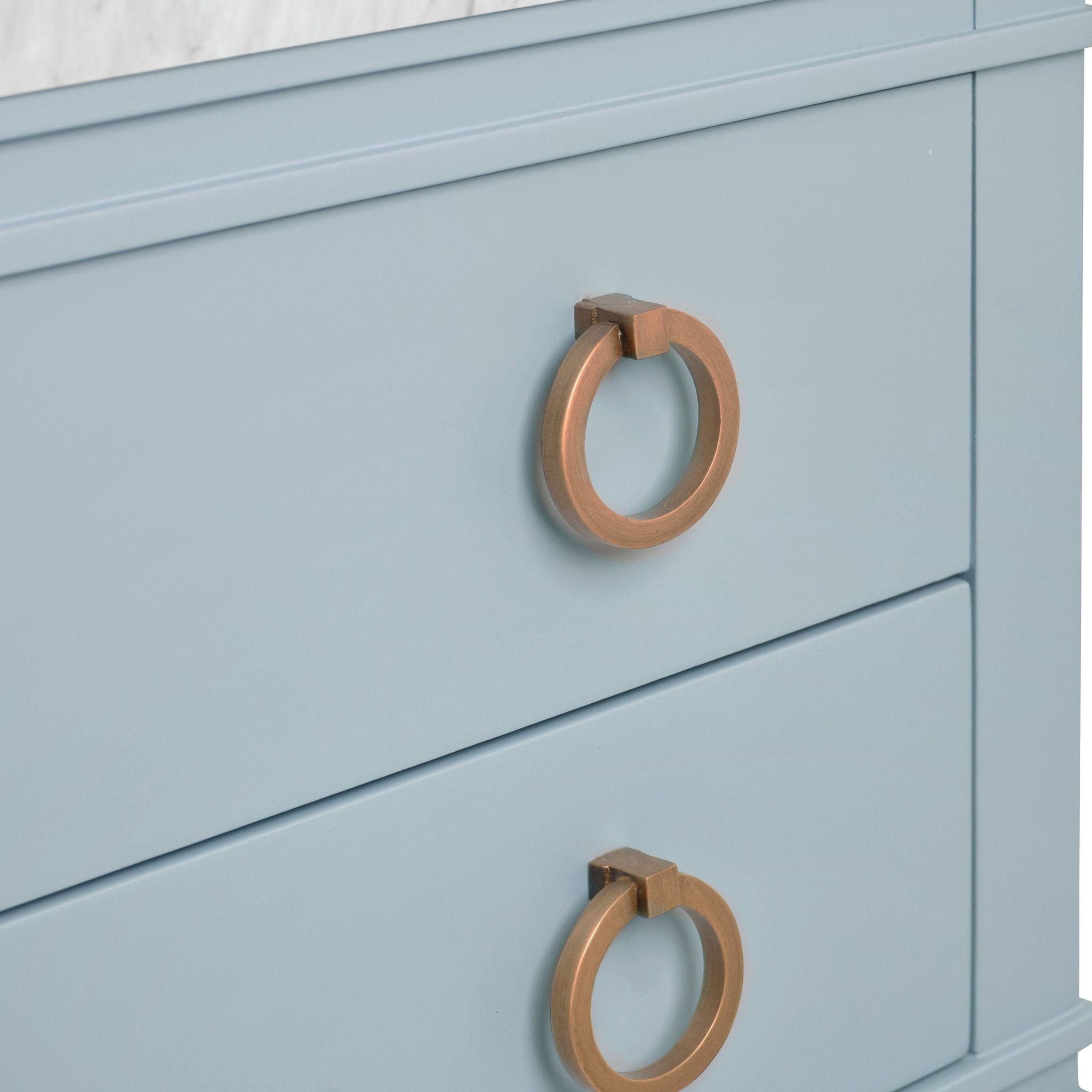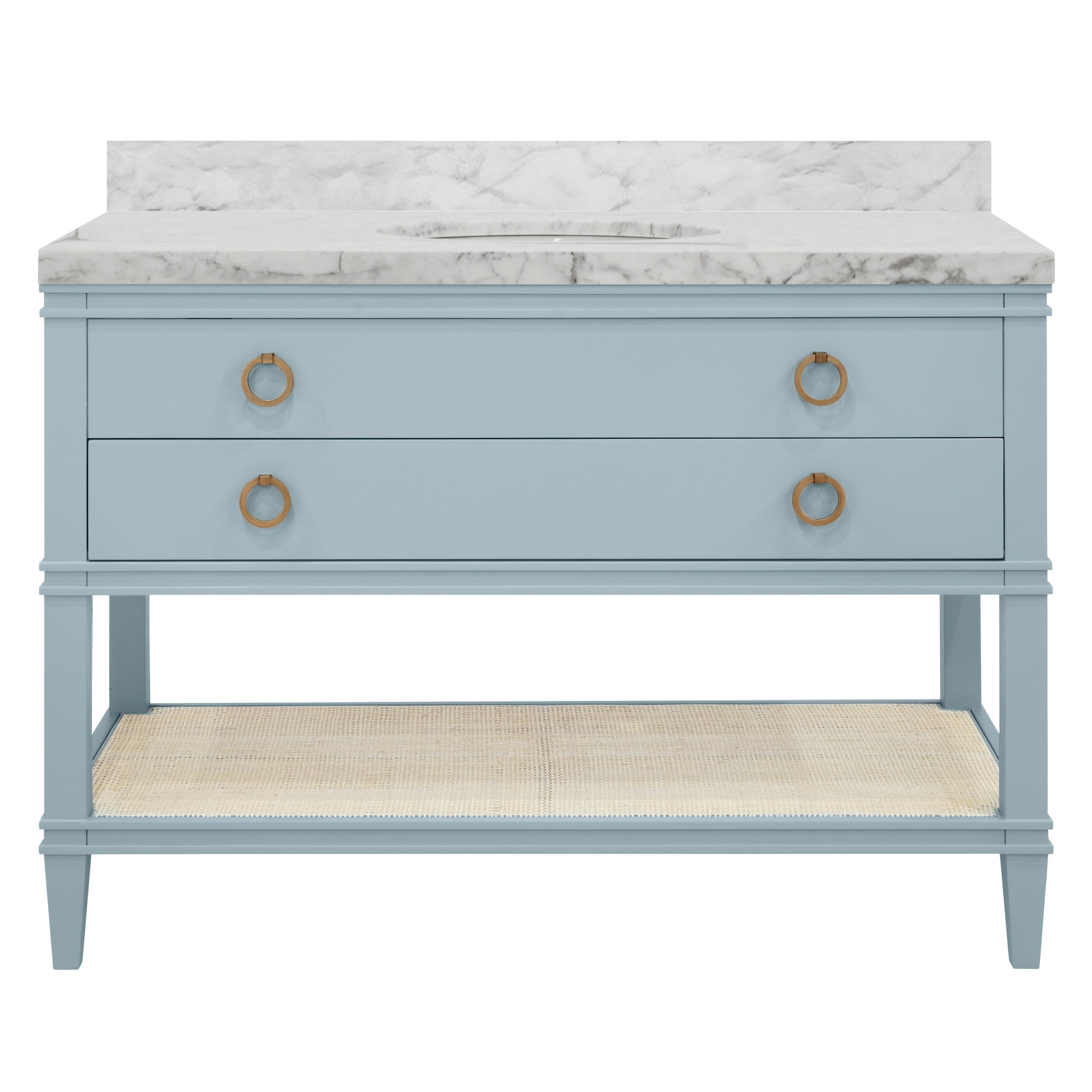 The Cutler 48" Bath Vanity brings refined coastal charm with its matte light blue lacquer finish, white marble top, and antique brass ring hardware. Featuring an open cane shelf and included full-width backsplash, this vanity blends style and functionality for a beautifully elevated bathroom setup.