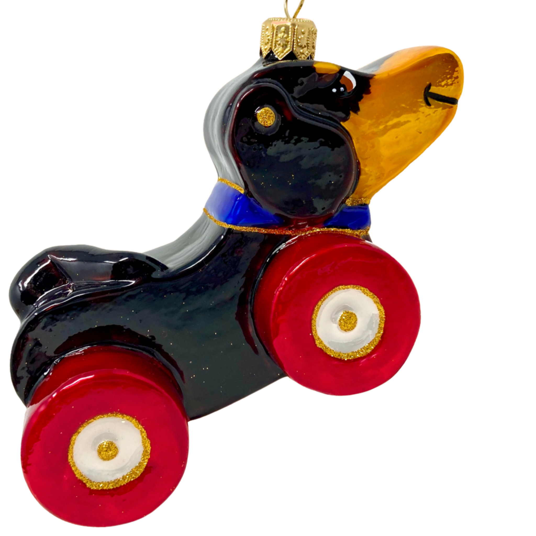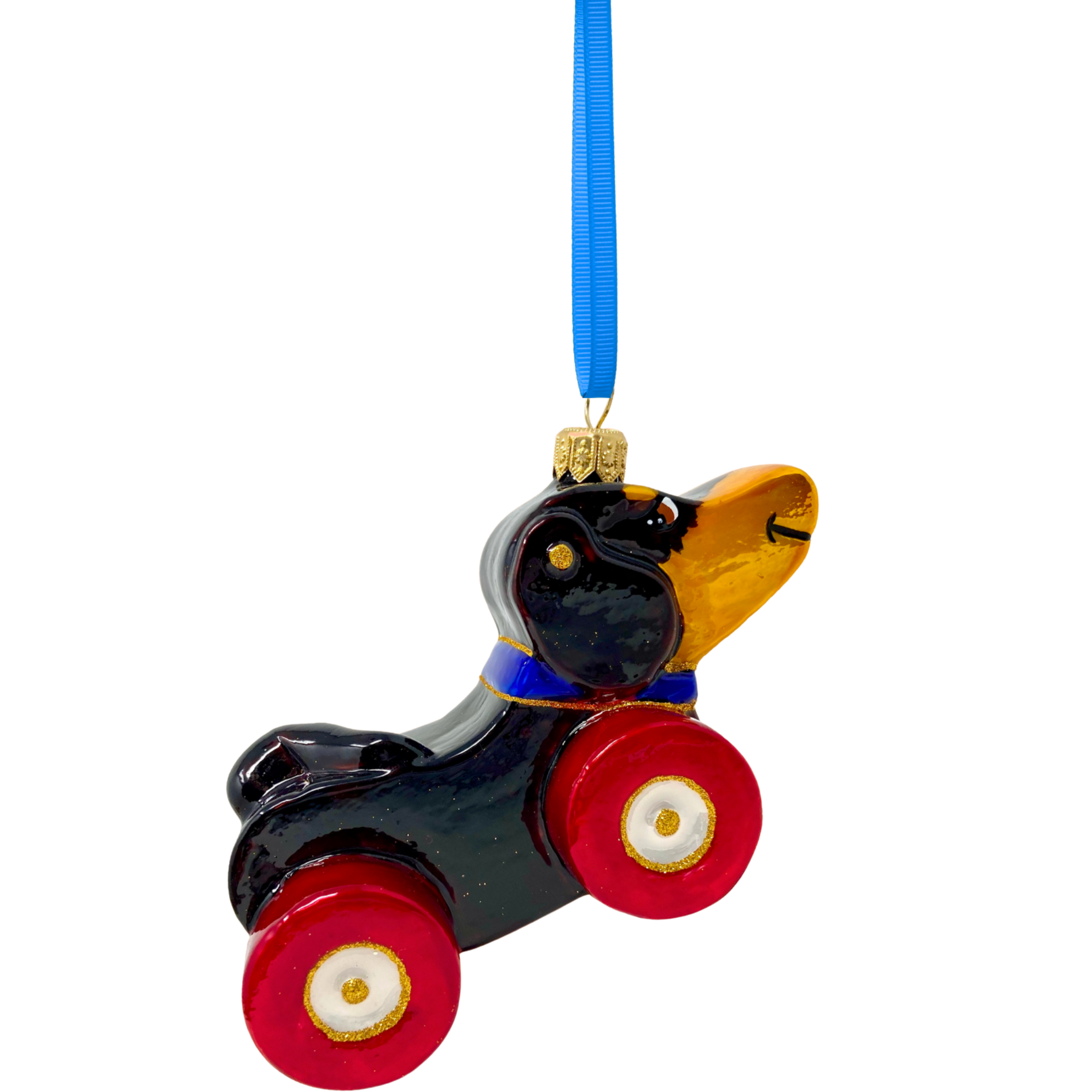 Inspired by classic children's toys, this whimsical ornament features a hand-painted dachshund with a long, sleek body, tiny wheels, and playful details that evoke old-fashioned joy. Rich tones, metallic accents, and a nostalgic design make it a standout piece for dog lovers and vintage toy collectors alike.