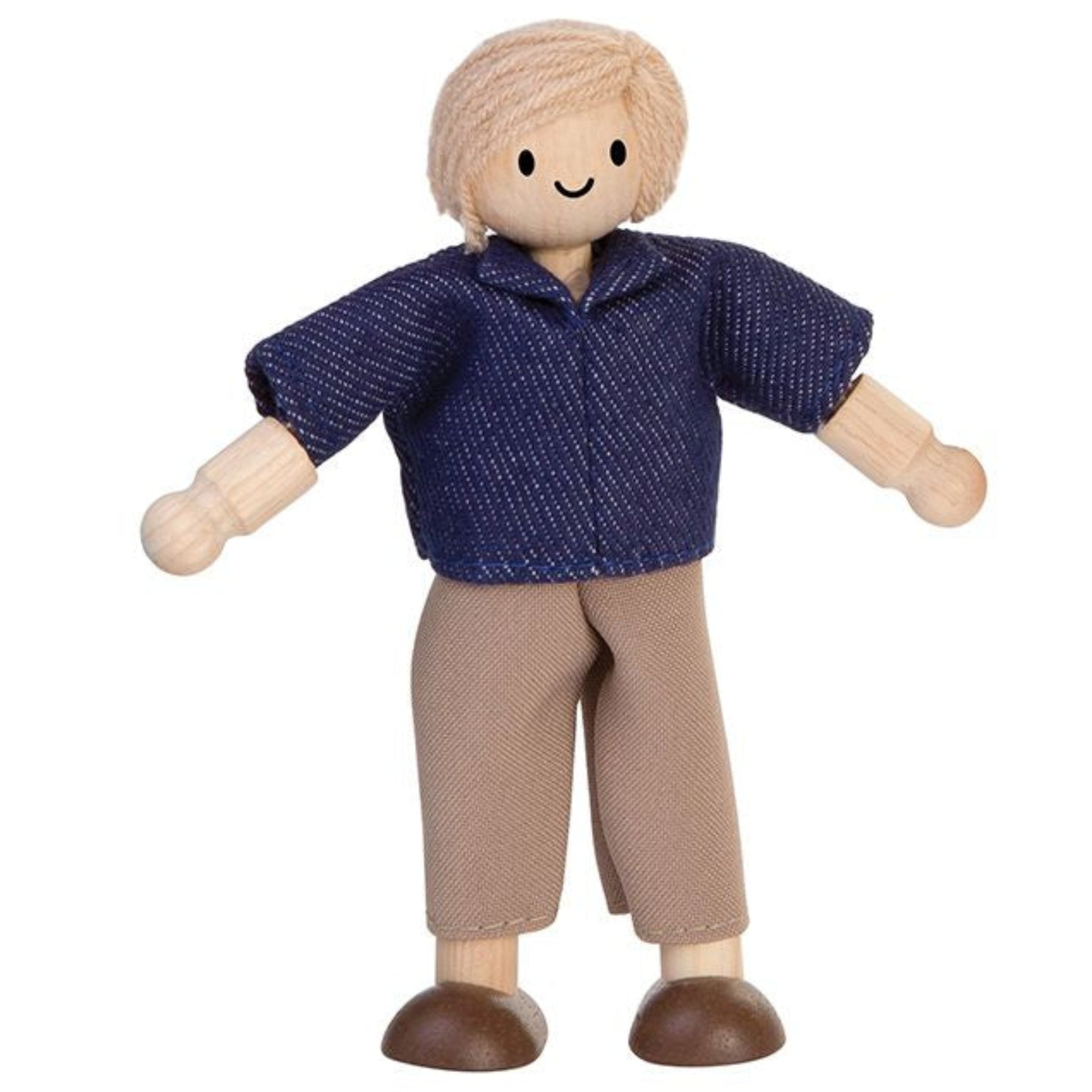 All doll heads and bodies are made of solid wood. Arms and legs are wire that can be easily shaped. Compatible with PlanToys dollhouses.