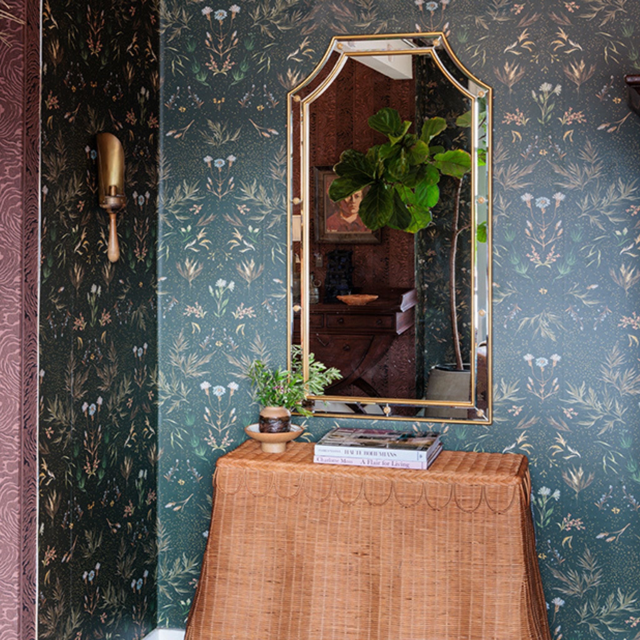 The Elodie mirror by Suzanne Kasler features a wood frame in a burnished gold leaf, and a distressed silver leaf finish with a beveled mirror. Its classic yet refined design adds warmth and sophistication to any room.