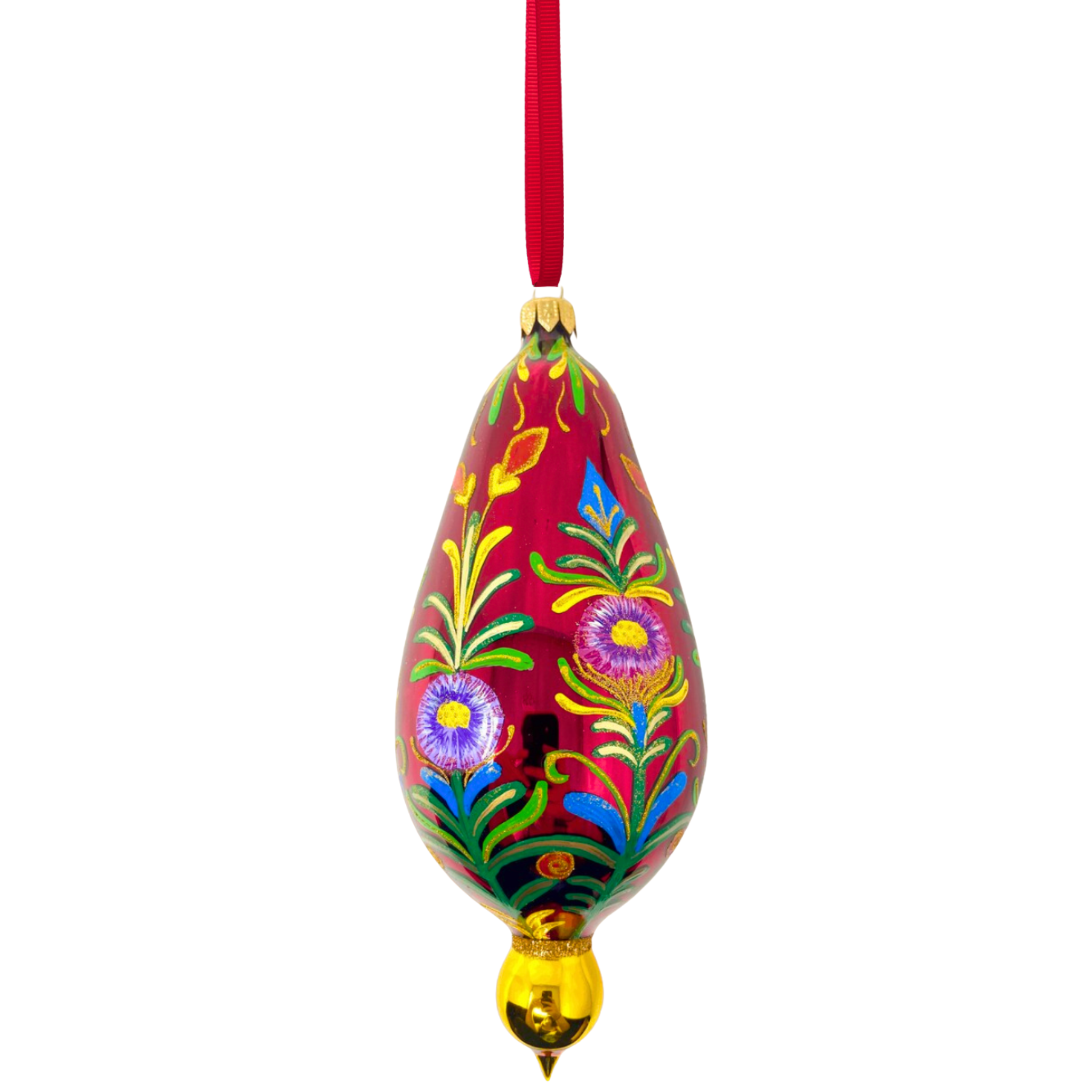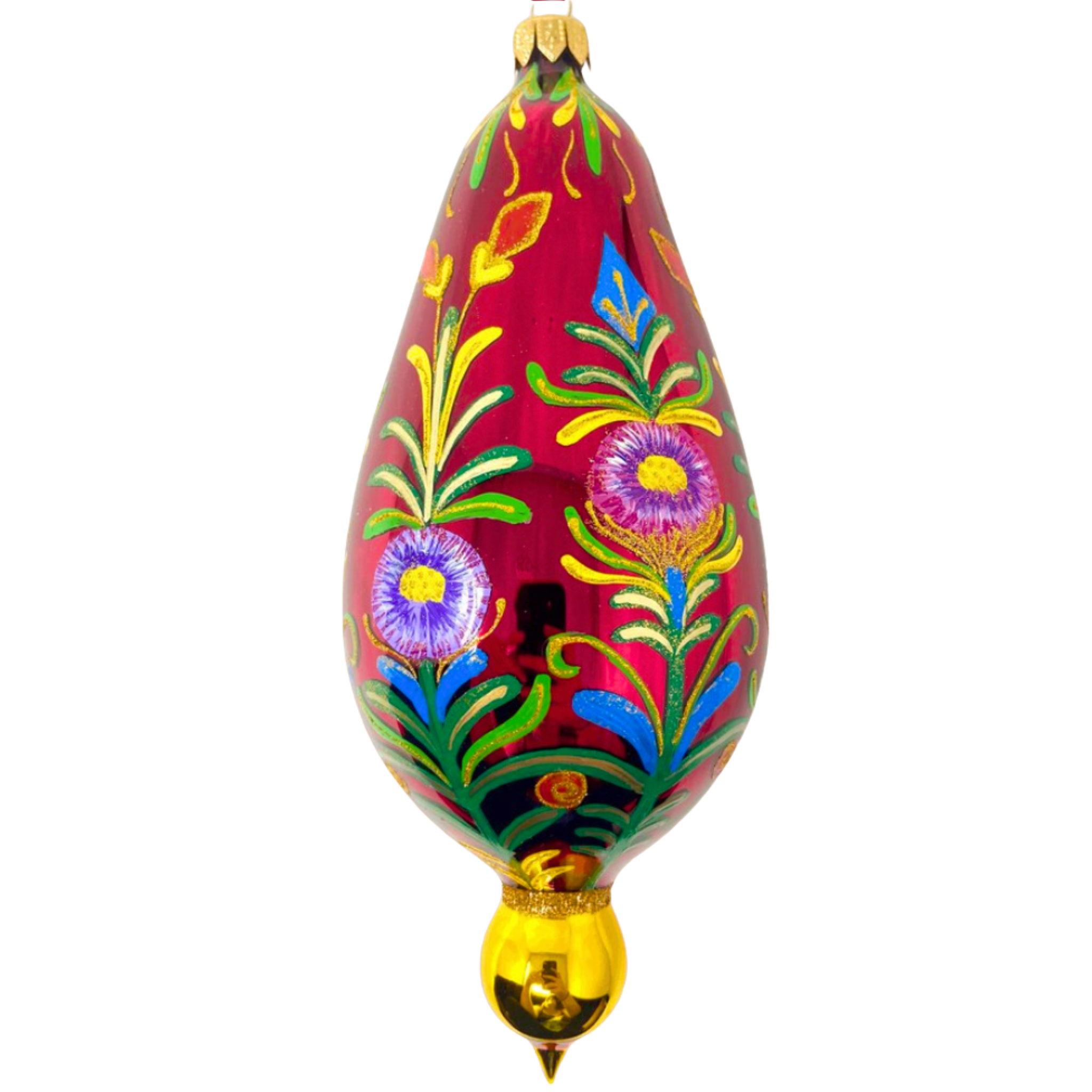 Delicately painted foliage and florals unfurl in graceful arcs, their intricate details shimmering with metallic accents and rich, earthy tones. The contrast of vibrant red and organic design evokes warmth, tradition, and timeless elegance. A perfect addition for those who appreciate nature-inspired beauty with a touch of drama, this ornament brings depth and sophistication to your holiday décor.