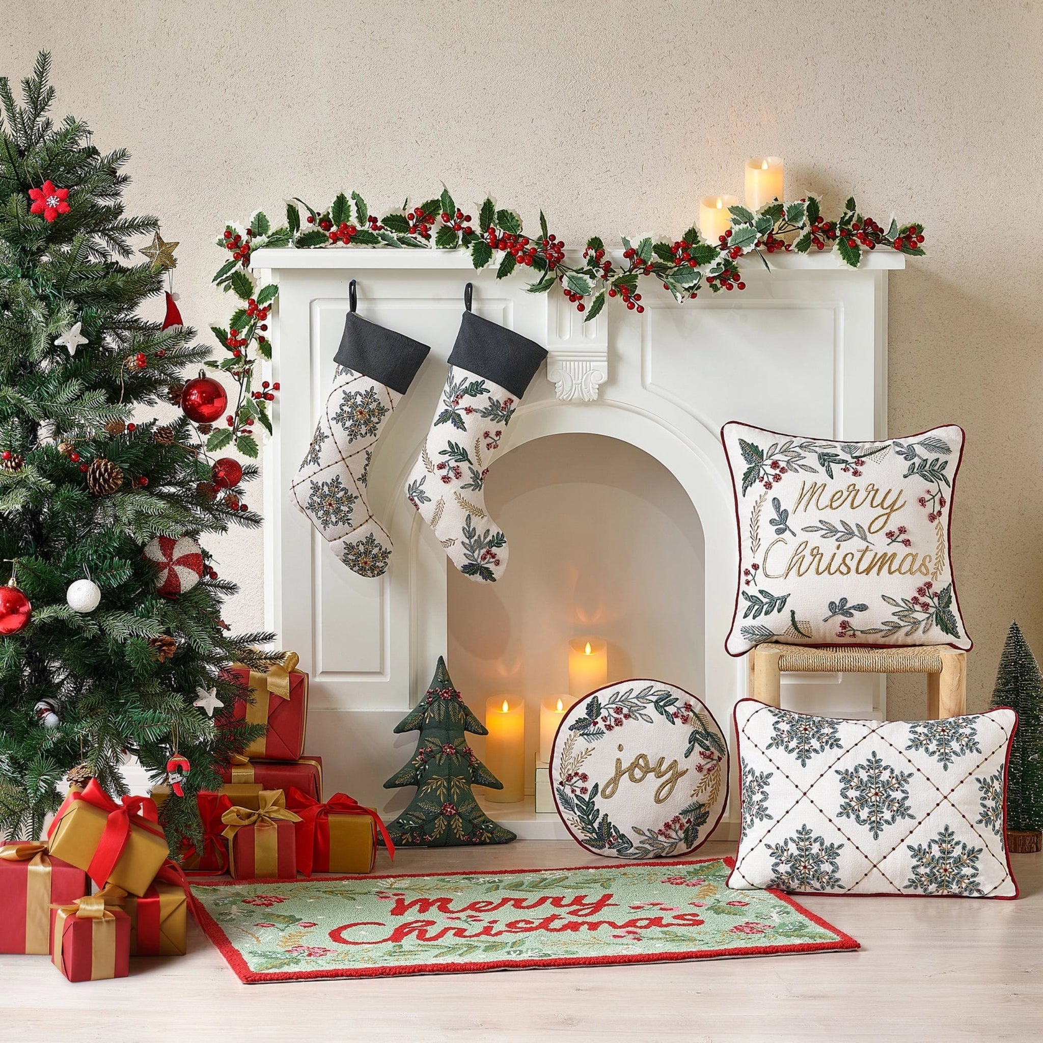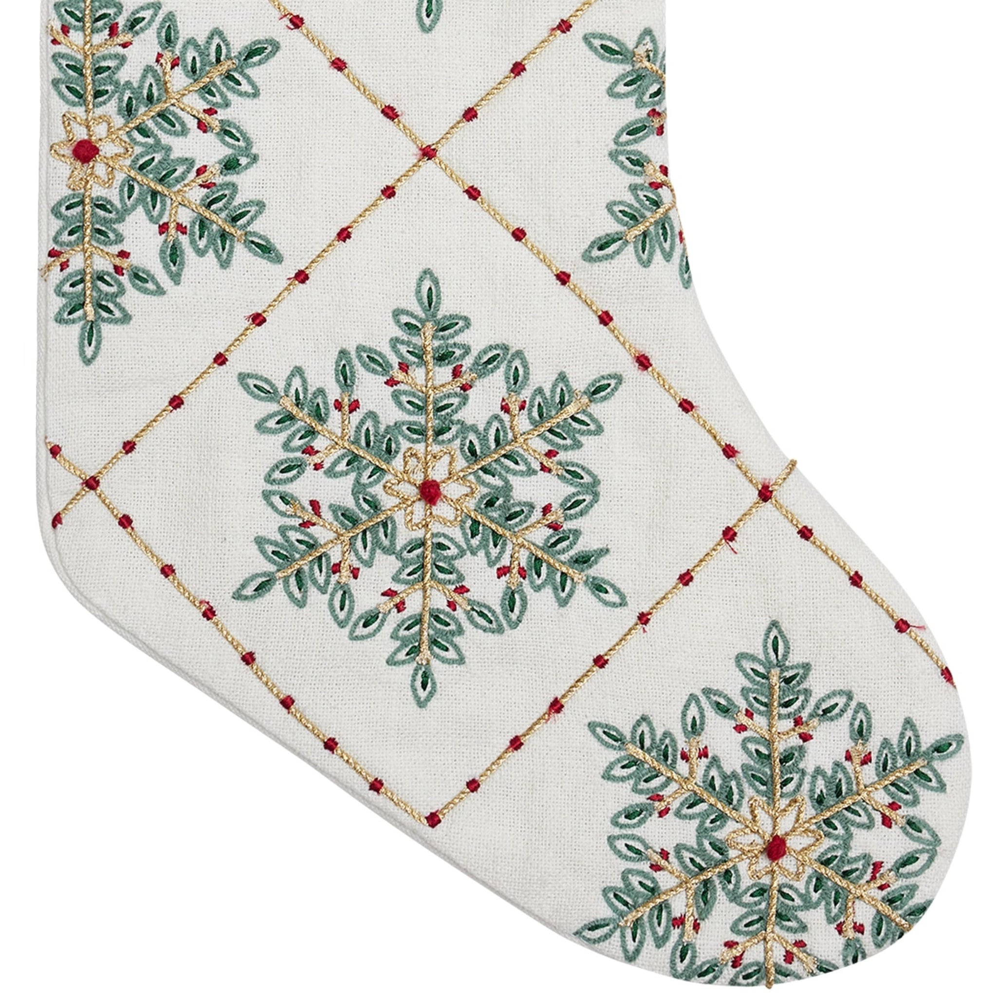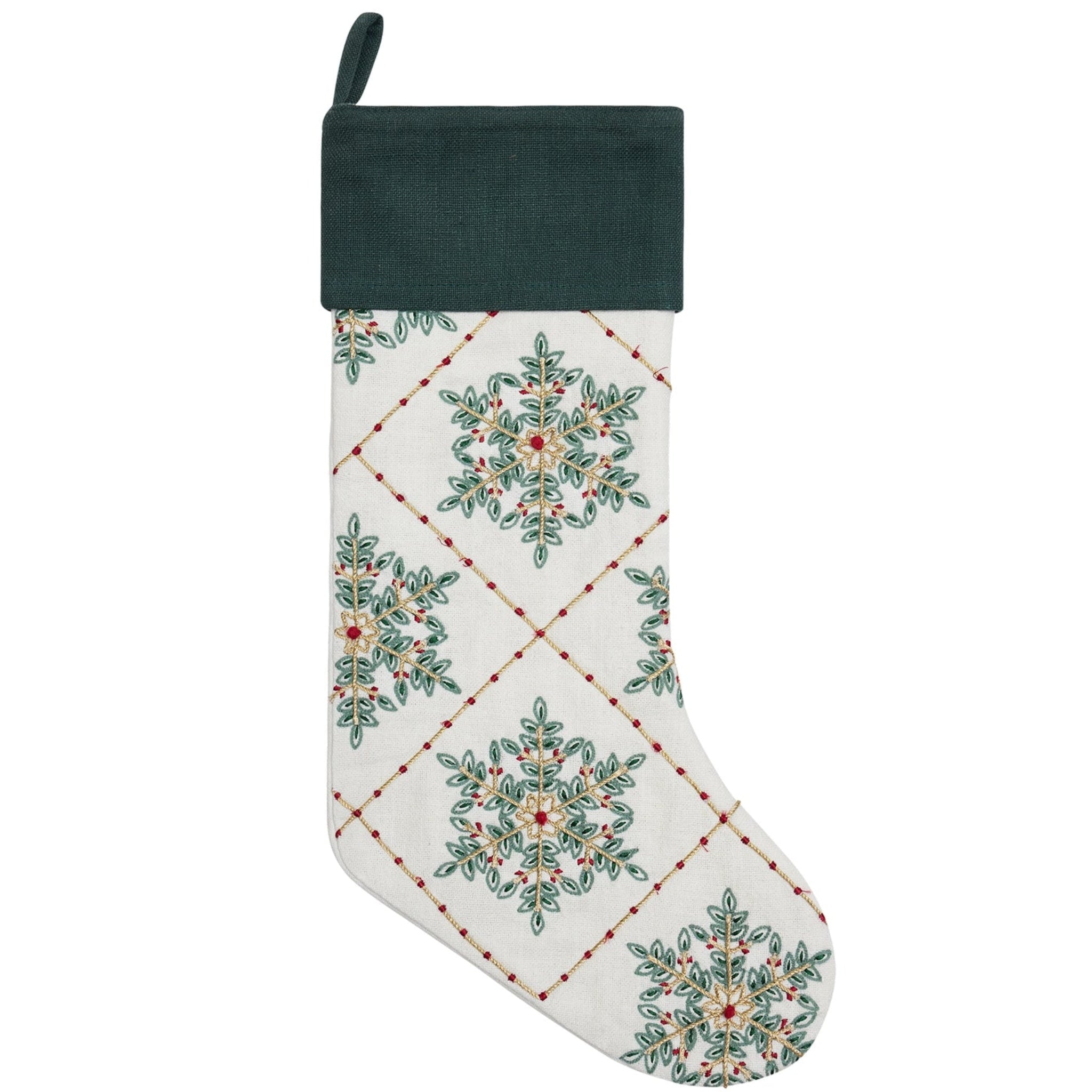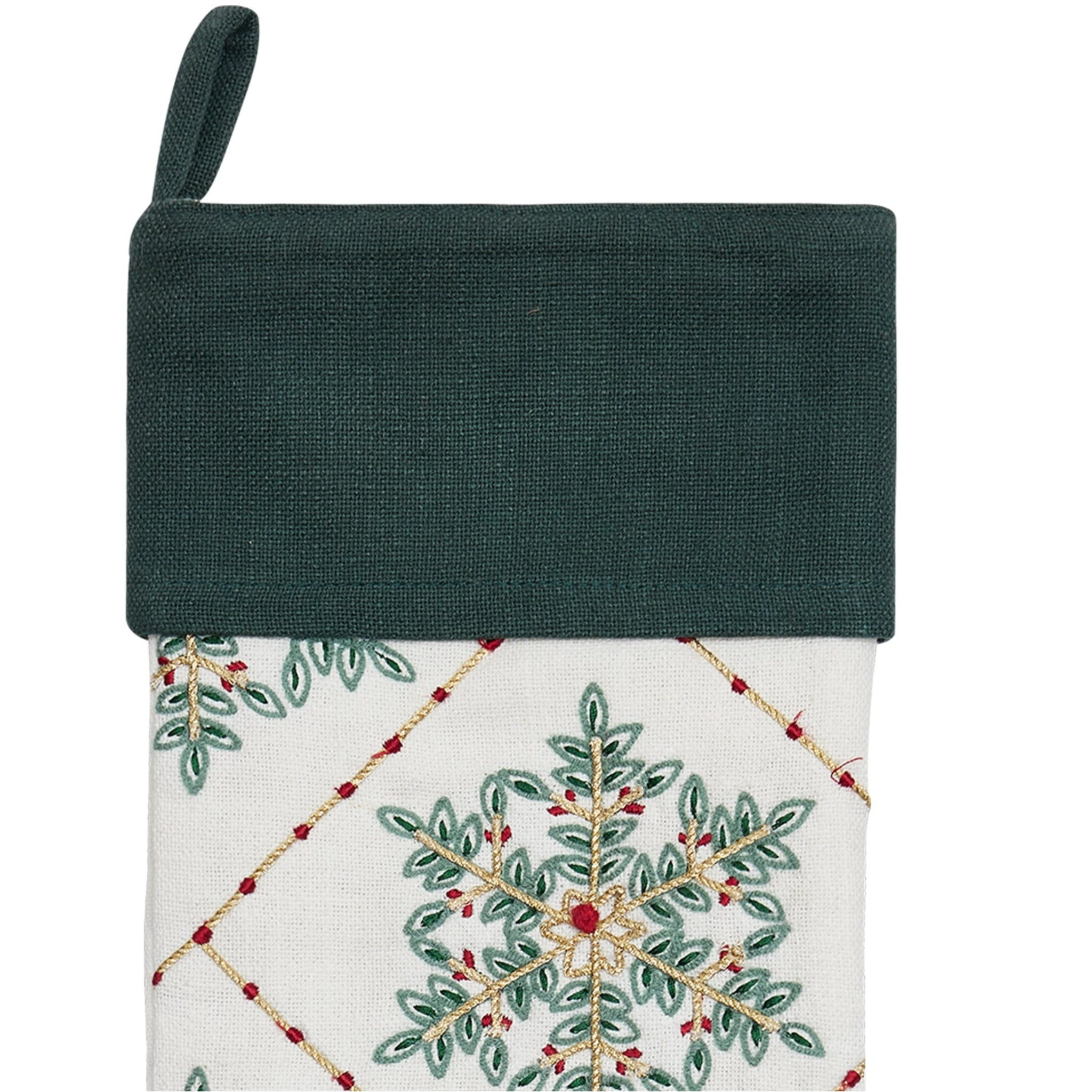 Bring a touch of classic holiday elegance to your home with this Festive Greenery Snowflakes Embroidered Stocking. Beautifully crafted from a soft, durable fabric blend, it features delicately embroidered snowflakes intertwined with sprigs of festive greenery. The detailed stitching and rich seasonal tones create a timeless look that complements any holiday décor - perfect for hanging by the fireplace and filling with joyful surprises.